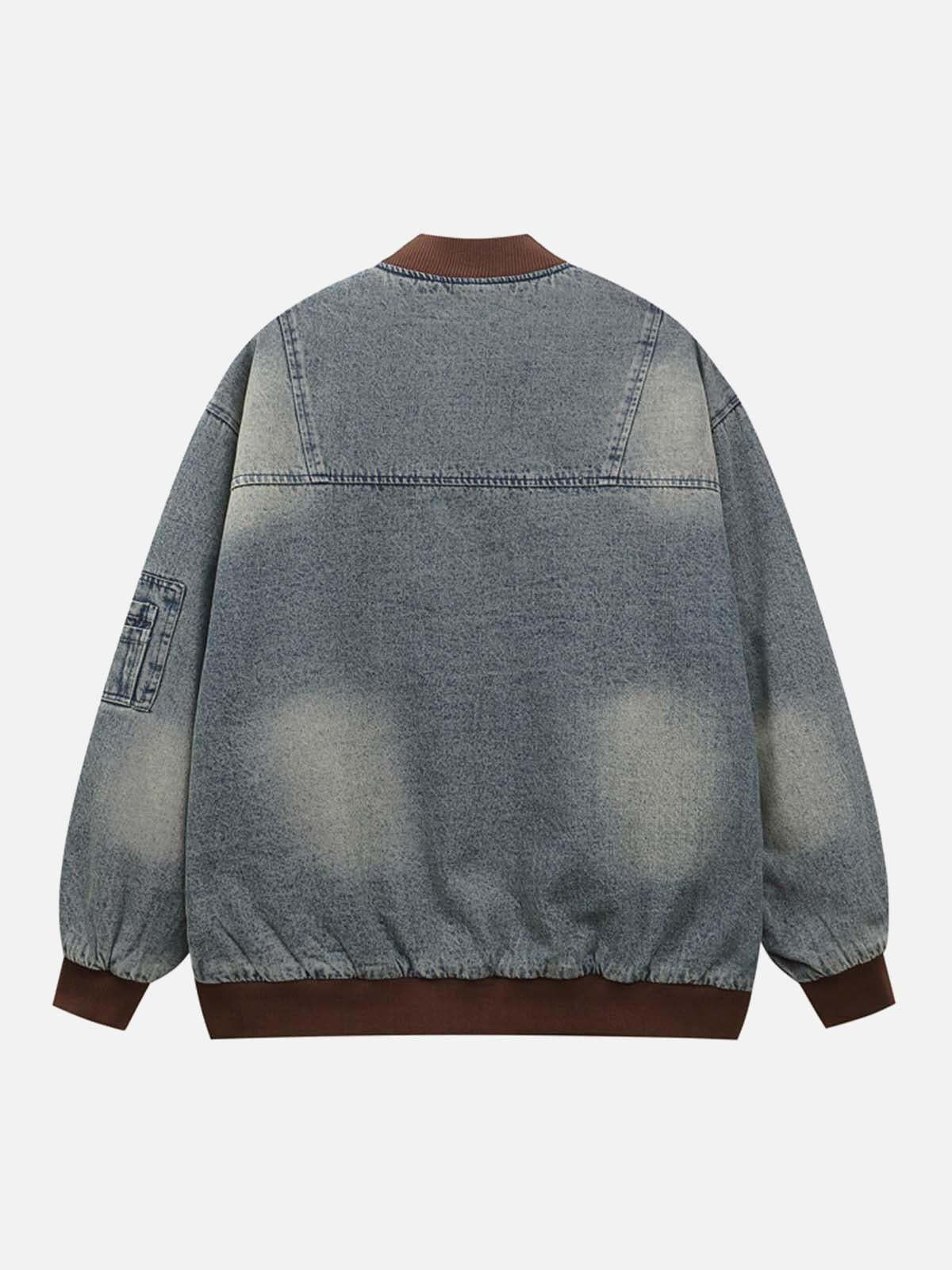 Revel in the raw energy of urban vibes with this standout denim bomber jacket, where faded blue hues meet bold, appliqué graphics that scream individuality. The rich brown ribbed cuffs and collar add a touch of contrast, enhancing the jacket’s dynamic personality. Available in sizes M, L, and XL, it’s designed for a relaxed fit that layers effortlessly over your favorite Y2K outfits. Pair it with joggers or distressed jeans for endless outfit ideas that capture the essence of streetwear fashion. Ready to up your style game?