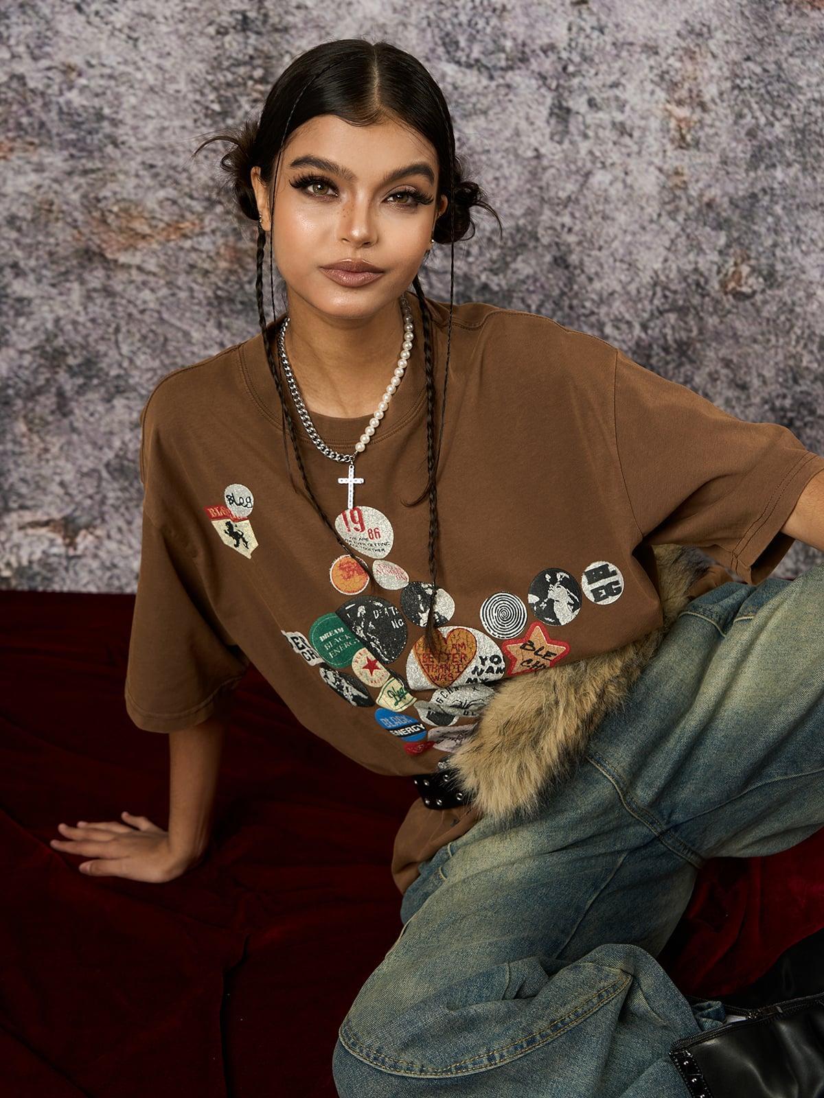 Embrace the urban jungle vibe with this graphic tee that turns heads with its eclectic patchwork of bold designs and daring textures. The earthy brown canvas serves as a backdrop for an explosion of vibrant, contrasting graphics, making it a go-to piece for those who live life in the fast lane. Available in black for a sleek, understated look or brown for a rugged, adventurous feel, this tee offers sizes from S to XL to ensure the perfect fit. Its relaxed fit and soft fabric make it an ideal choice for laid-back summer style, pairing effortlessly with your favorite denim or cargo pants. Perfect for those who appreciate a mix of comfort and cutting-edge design, this tee is your ticket to effortless summer fashion inspo.