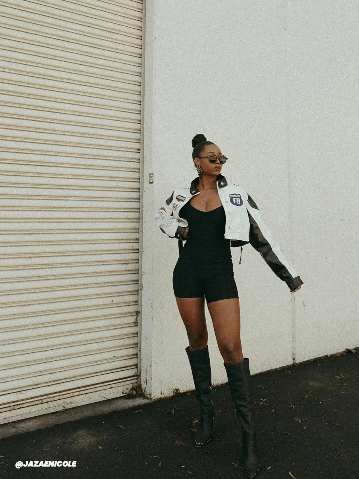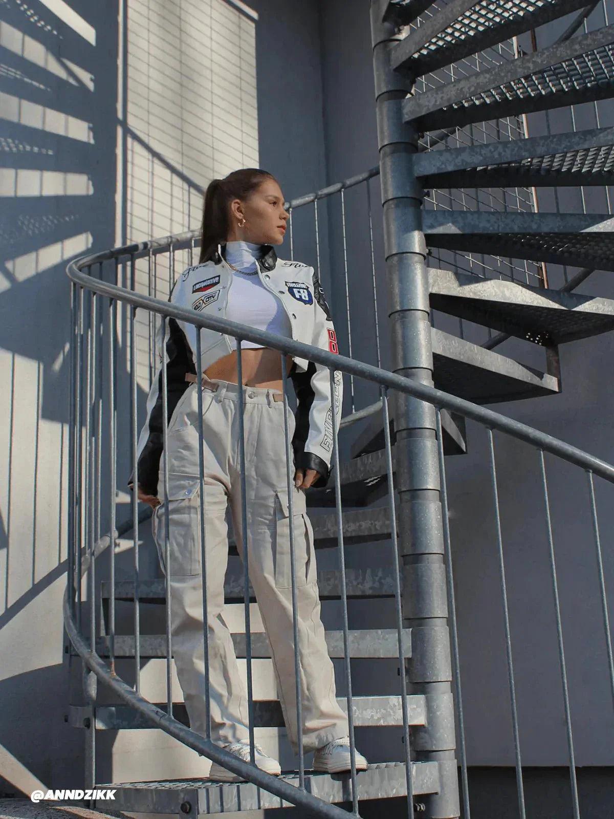 Rev up your style game with this edgy black and white cropped jacket, featuring bold patches and a sleek, glossy finish that screams confidence. The contrasting elements and fitted design make it a standout piece for any urban wardrobe, effortlessly enhancing your streetwear fashion. Available in sizes S, M, and L, this jacket pairs perfectly with high-waisted jeans or a leather mini for those who dare to embrace their inner rebel. Slip into this modern masterpiece and redefine what it means to step out in style.