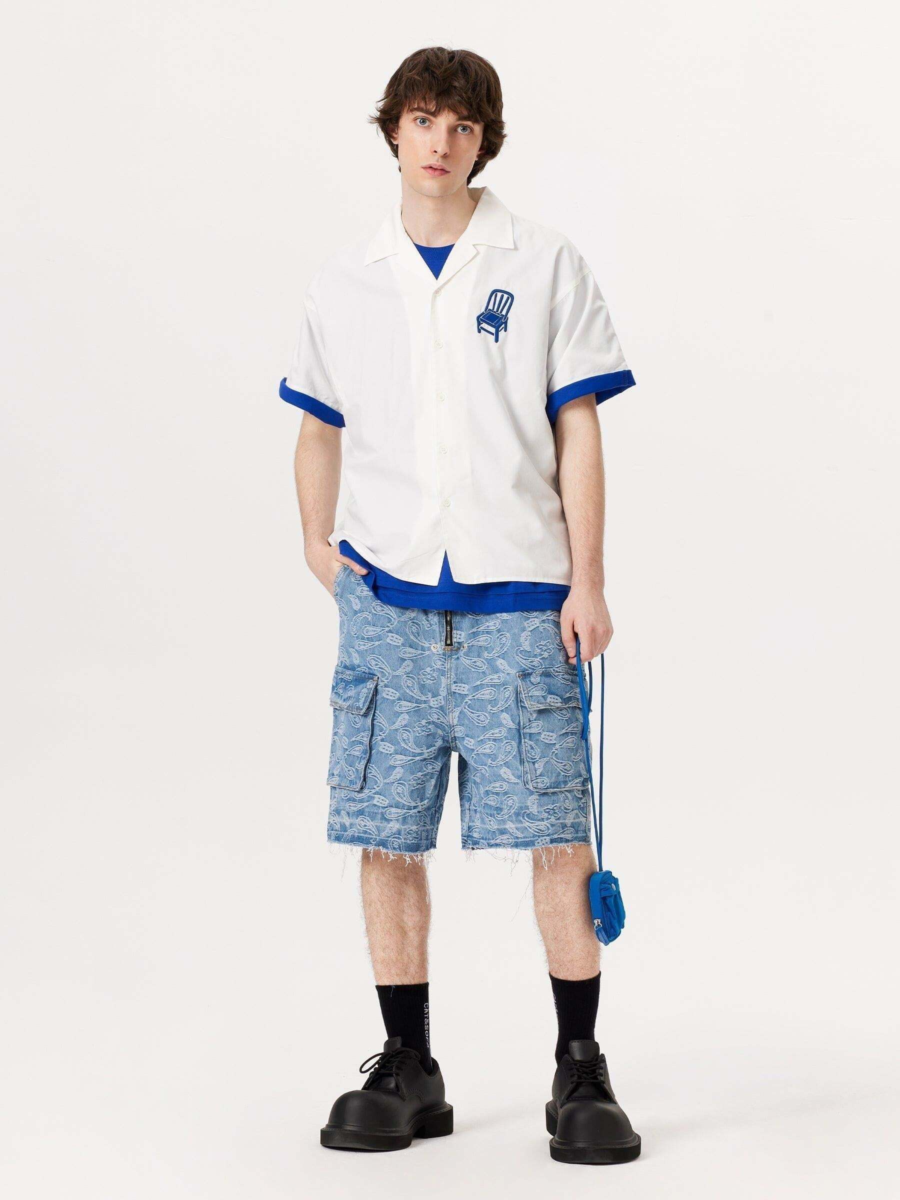 Break down barriers with a look that fuses casual cool with a hint of rebellion, all wrapped up in a crisp white shirt embellished with a bold blue chair motif. The contrasting blue trims add a splash of color that ties seamlessly with the laid-back vibe of the blue paisley cargo shorts, offering a tactile blend of edgy streetwear and comfort. Designed for those who aren’t afraid to stand out, this ensemble comes in sizes S, M, and L, ensuring a perfect fit for any urban adventure. Pair it with your favorite kicks and own the summer streets with confidence.