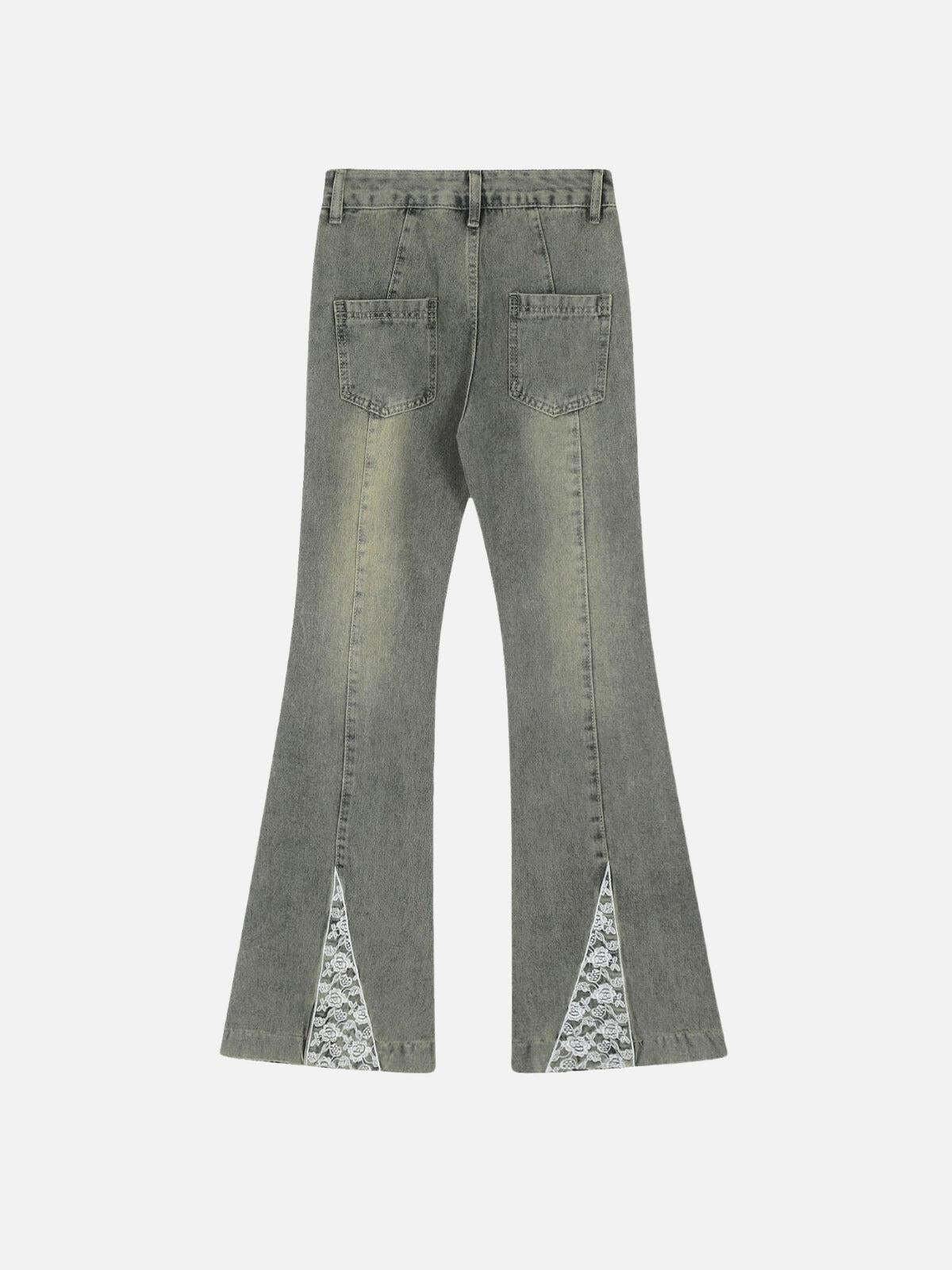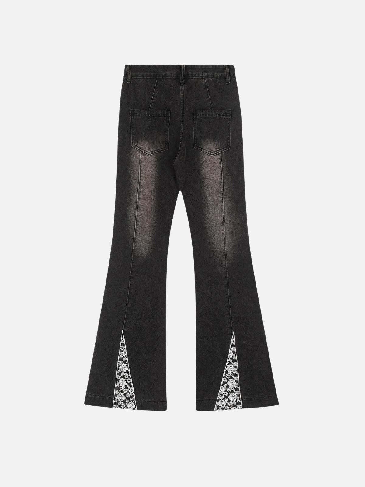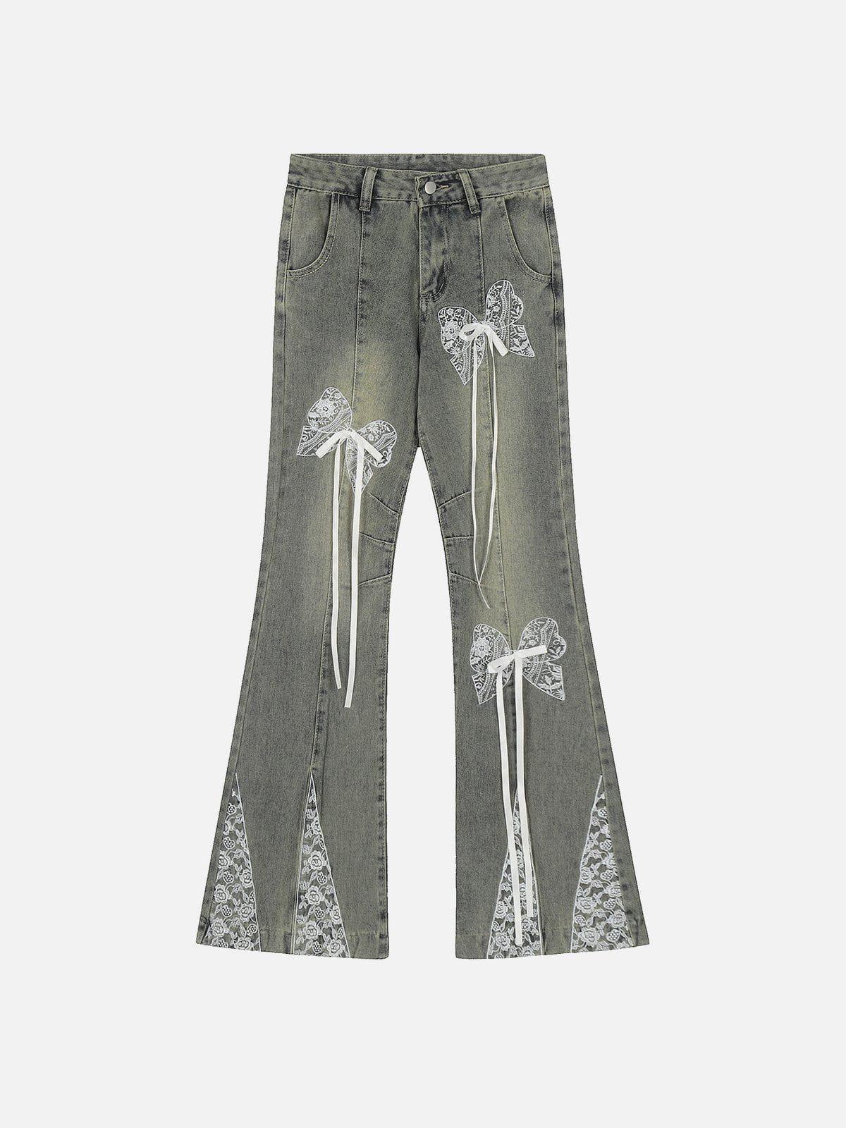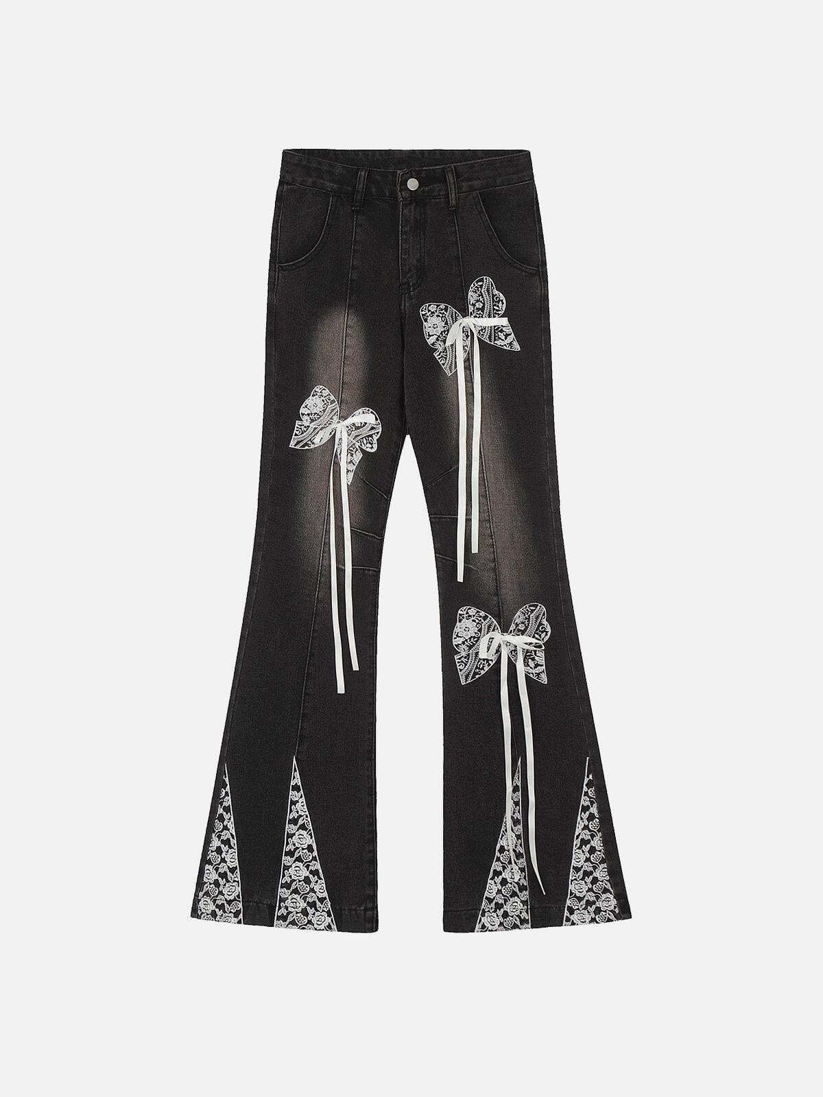 Redefine your streetwear fashion with these striking black flared jeans, where bold meets whimsical. The intricate lace bow details cascade elegantly down each leg, adding a playful twist to the edgy, washed-black denim. Designed in a versatile one-size fit, these jeans offer both comfort and style, perfect for those who love to mix modern flair with a hint of vintage vibe. Pair them with your favorite oversized hoodie or a sleek crop top to nail that effortlessly cool y2k look. Ready to turn heads? Slip into these and own the streets.