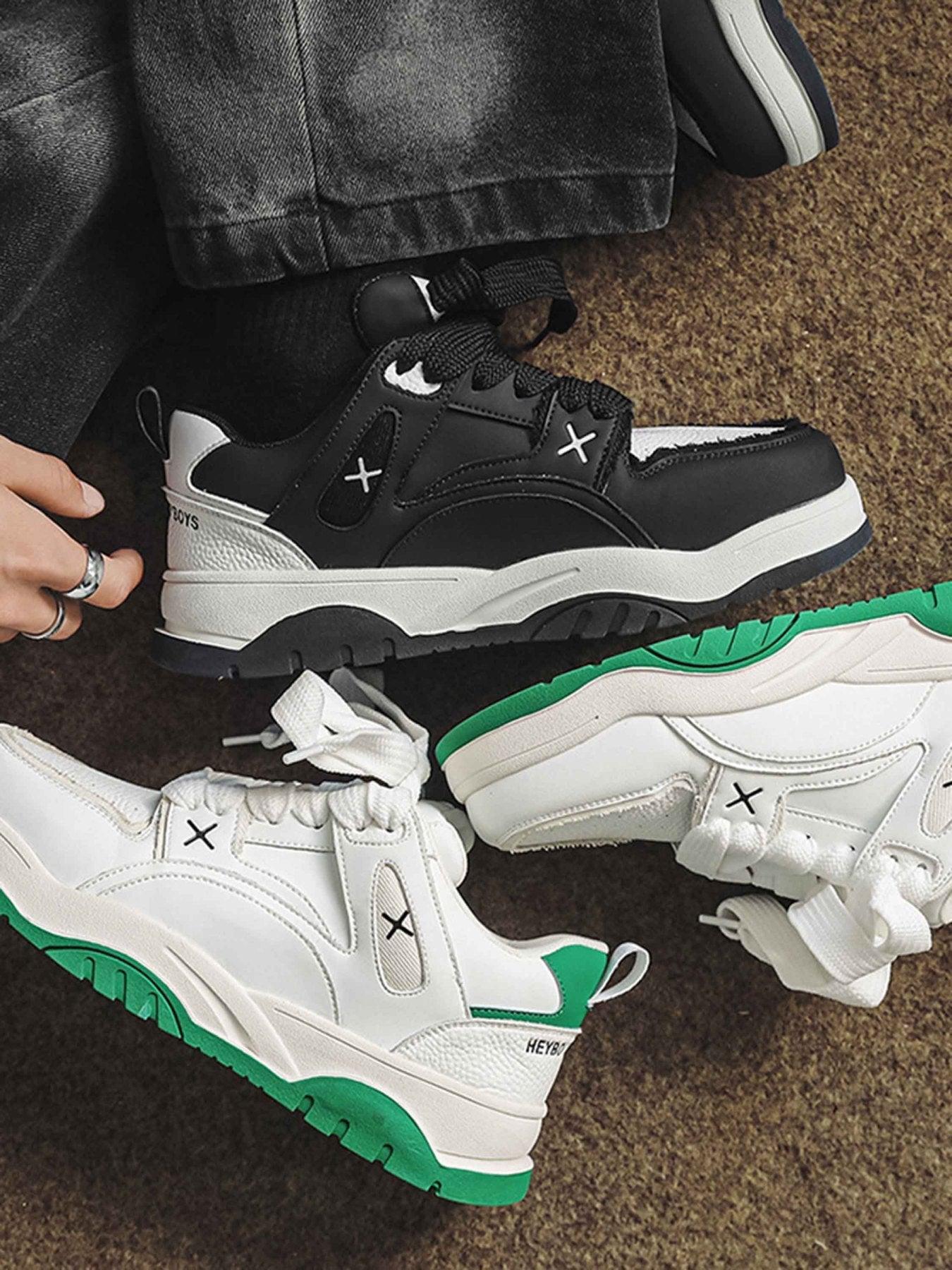 Dive into the urban jungle with these sleek kicks that effortlessly merge bold design with streetwear fashion. The crisp white leather is sharply contrasted by vibrant green accents, making these sneakers the perfect choice for anyone ready to step up their game. The chunky, padded soles offer unparalleled comfort, while the intricate detailing, like the subtle black ‘X’ stitches, adds a hint of rebellious flair. Available in sizes 38 to 44, these sneakers fit like a dream, giving you the confidence to conquer the streets. Pair them with your favorite y2k outfits or mix them into your outfit ideas for a fresh twist. Ready to make these your new go-to?