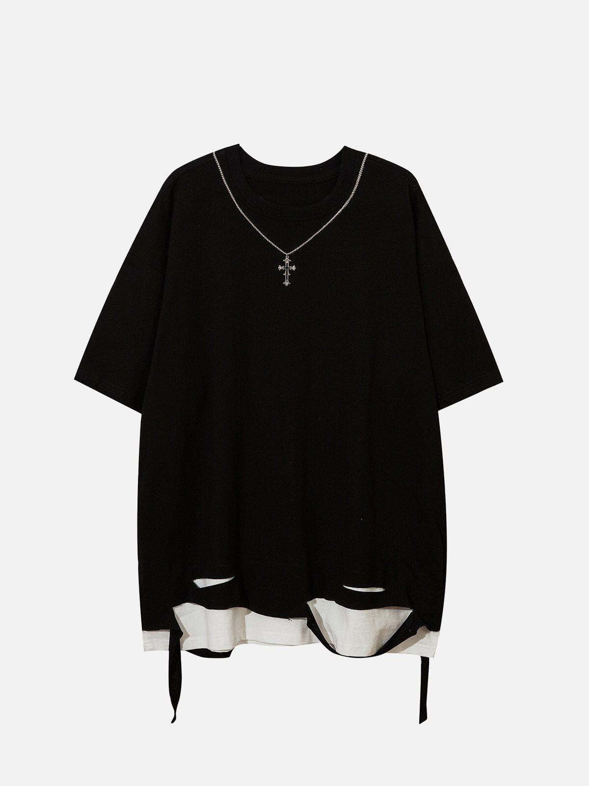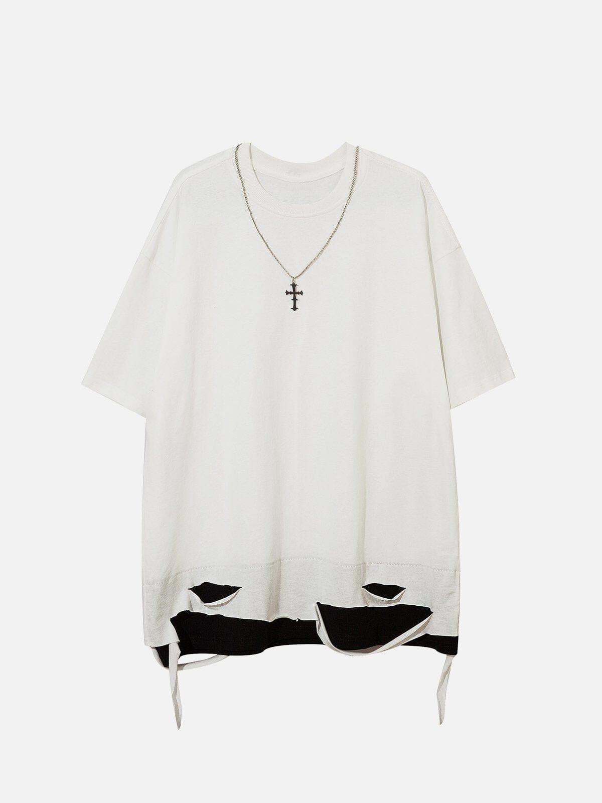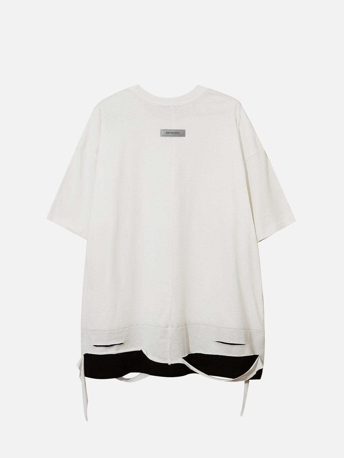 Embrace the art of contrast with this effortlessly cool piece, where the crisp white canvas meets bold black accents for a look that’s pure urban edge. The oversized fit ensures comfort and swagger, making it an essential for those who dare to redefine summer style. Intricate slashes add a rebellious touch, while the unique layered hem creates movement and flair. Whether you sport it in S, M, L, or XL, this versatile piece pairs seamlessly with your favorite kicks or distressed denim. Dive into summer fashion and let your wardrobe speak volumes.
