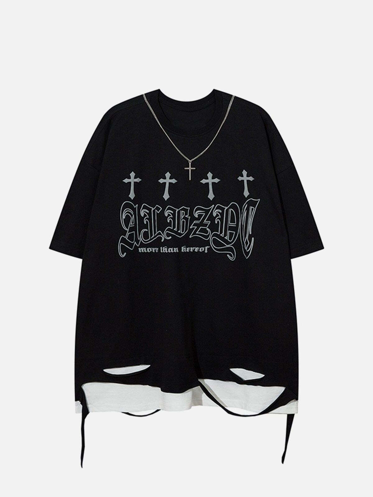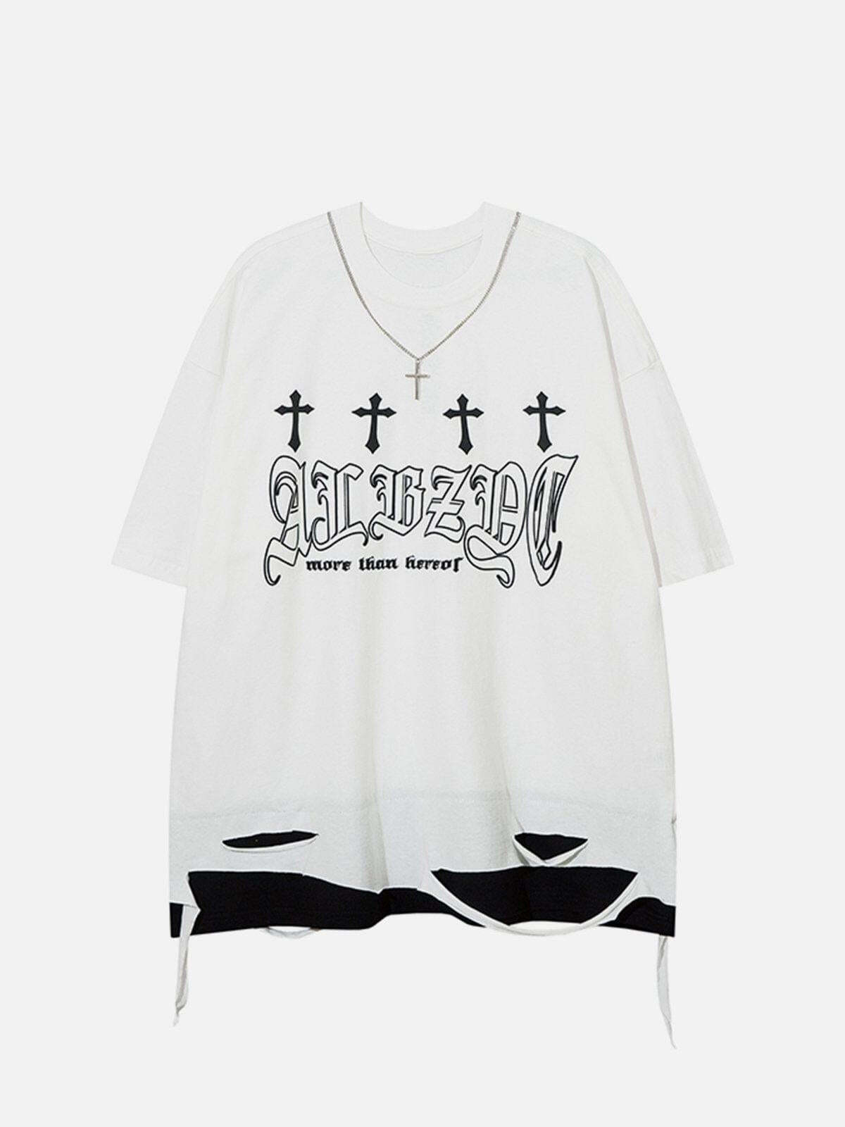 Dive into the bold with this oversized tee that marries edgy street vibes with distinct urban flair. Its striking white backdrop is the perfect canvas for the gothic-inspired lettering and cross motifs, creating a look that’s unapologetically fierce. The distressed hem adds a rebellious touch, while the relaxed fit ensures comfort across all sizes, from S to XL. Whether you’re rocking it in classic black or crisp white, pair it with ripped jeans or shorts for the ultimate summer style. Elevate your wardrobe with a piece that speaks volumes without saying a word.