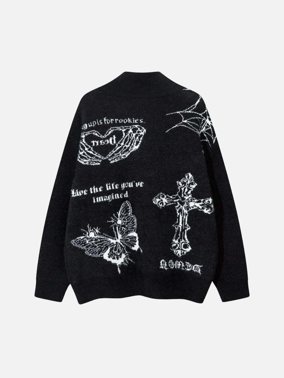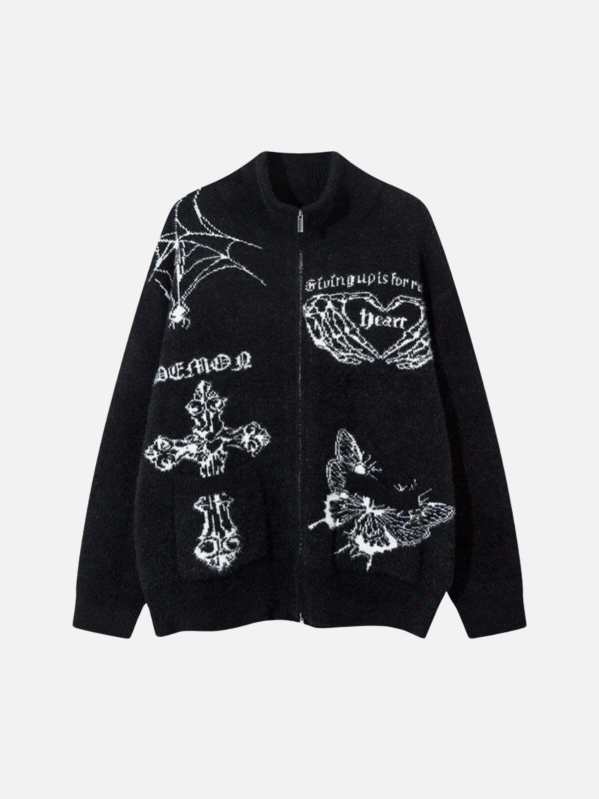 Unearth your boldest self with this striking black and white zip-up jacket, where gothic designs meet streetwear fashion. Intricately woven patterns featuring edgy cross motifs and winged creatures transform this piece into a canvas of rebellion and creativity. The texture is luxuriously soft, wrapping you in comfort while maintaining an effortlessly cool silhouette. Available in sizes ranging from S to XL, this jacket is designed to fit your individual style needs perfectly. Whether paired with your go-to denim or layered over a crisp tee, it’s an essential for those who dare to redefine their wardrobe. Slip into this urban masterpiece and let your outfit speak volumes.
