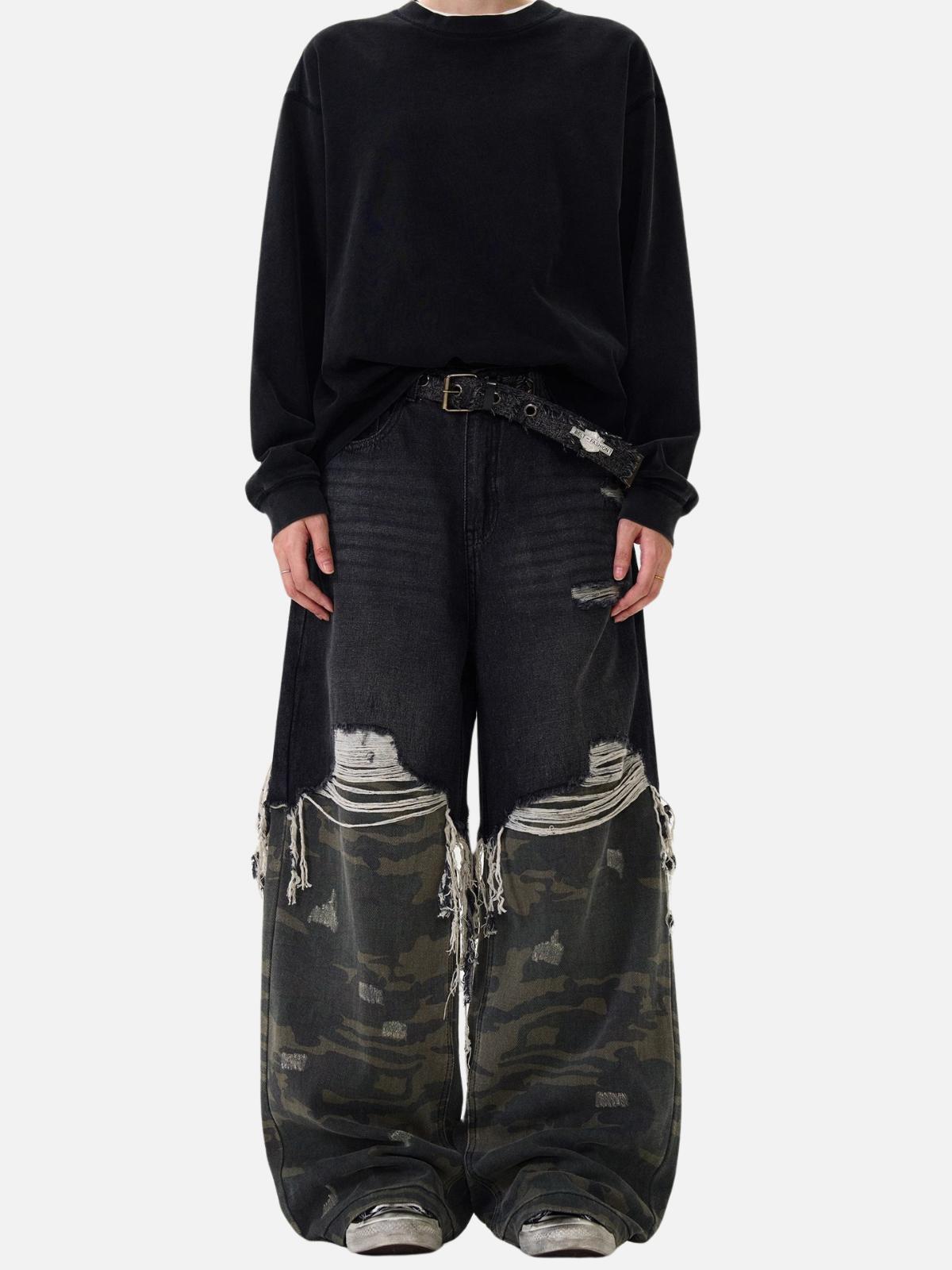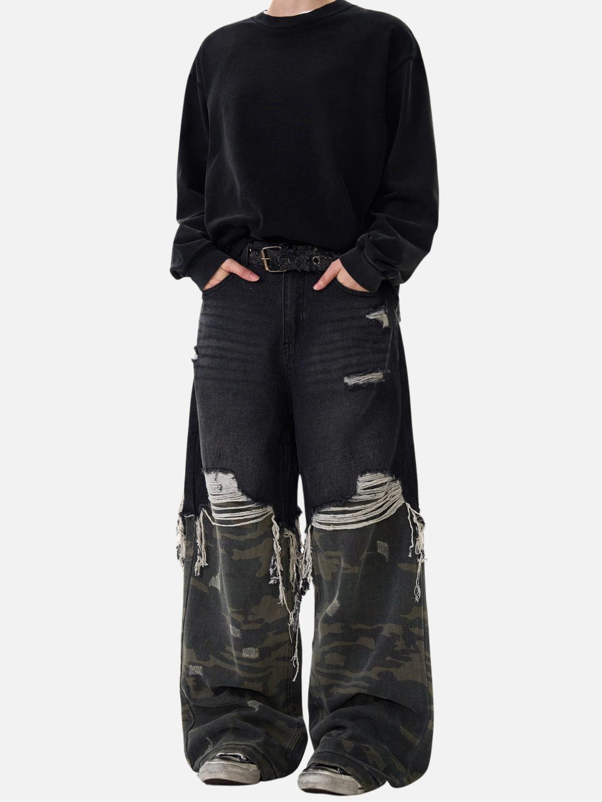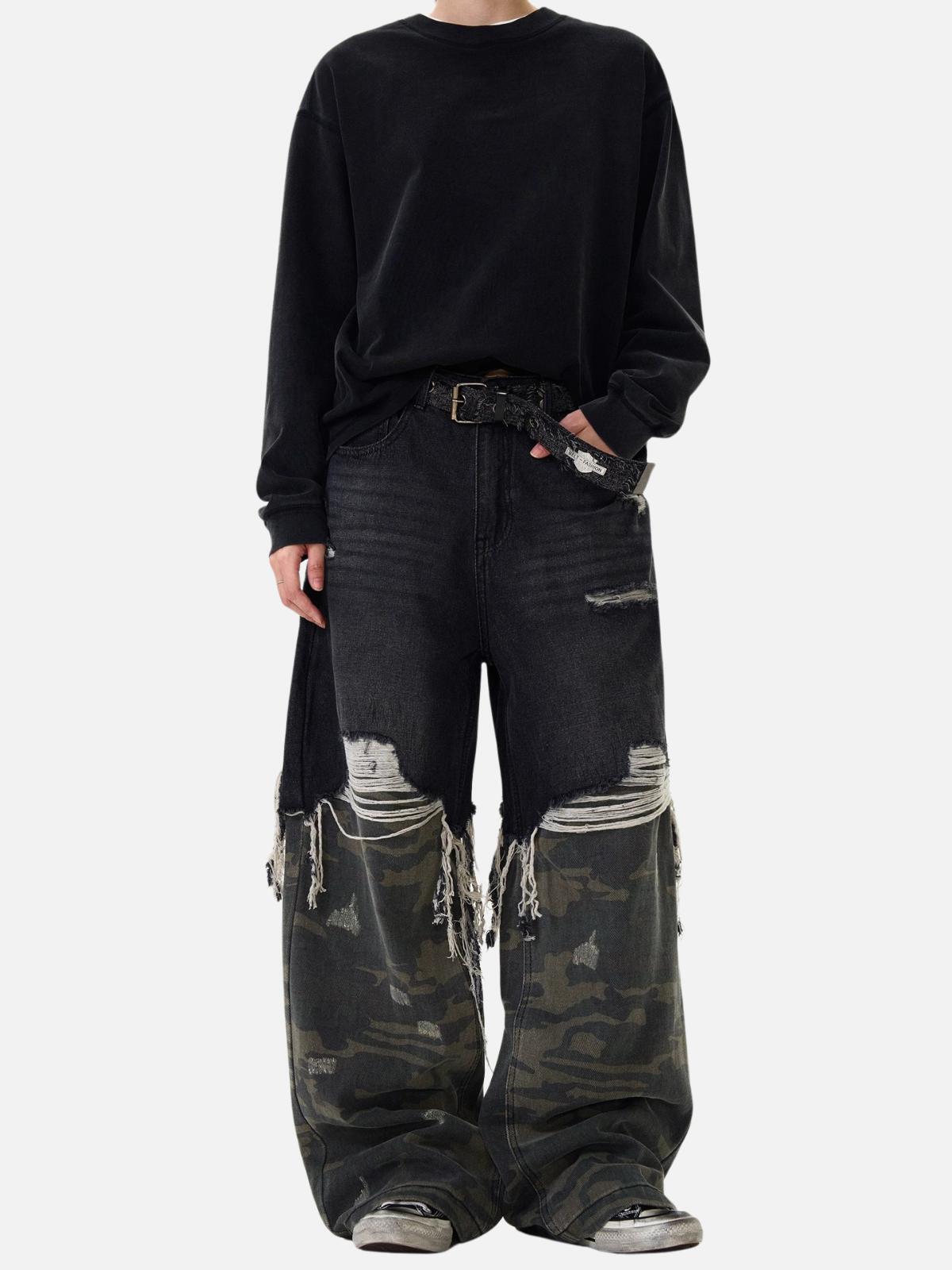 Embrace the edgy allure of urban rebellion with these black, oversized pants that redefine streetwear fashion. The distressed textures, featuring bold rips and a unique blend of dark denim and camo patterns, create an audacious look that’s both raw and refined. Designed in a versatile one-size fit, these pants drape effortlessly, offering a relaxed silhouette perfect for showcasing your individuality. Pair them with your favorite oversized top for ultimate outfit inspo that commands attention on city streets. Dive into the world of y2k outfits and make these your go-to piece for an unapologetically bold style.
