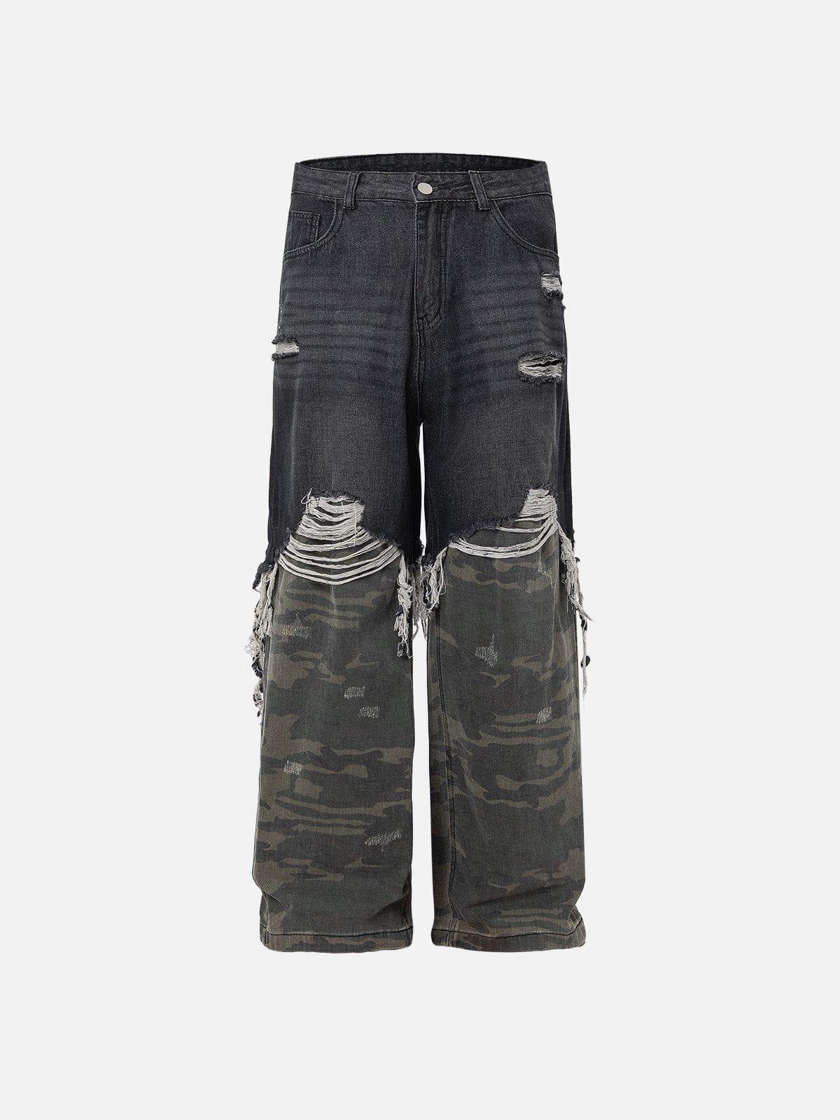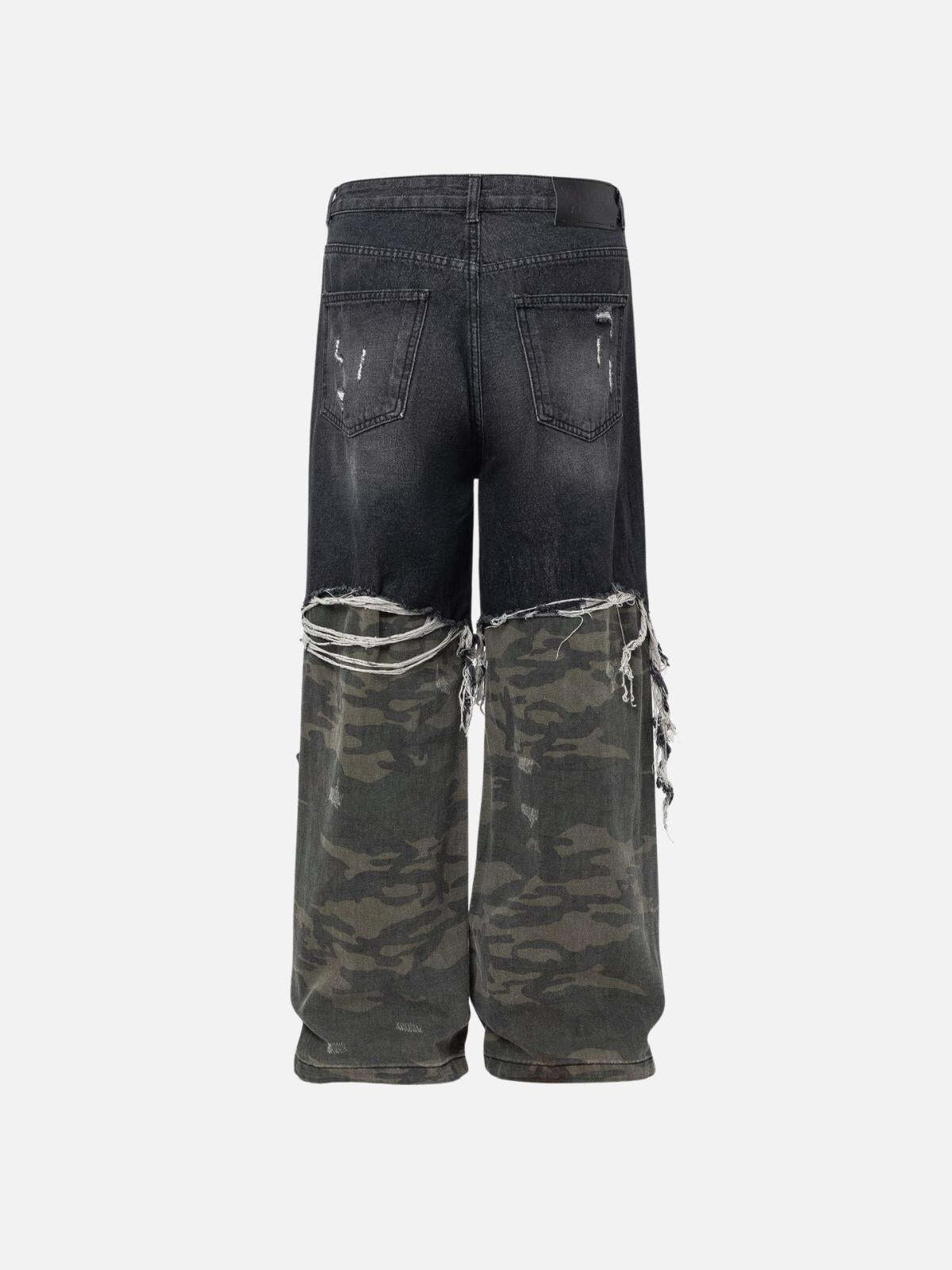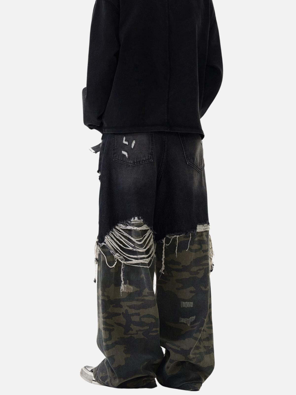 Embrace the edgy allure of urban rebellion with these black, oversized pants that redefine streetwear fashion. The distressed textures, featuring bold rips and a unique blend of dark denim and camo patterns, create an audacious look that’s both raw and refined. Designed in a versatile one-size fit, these pants drape effortlessly, offering a relaxed silhouette perfect for showcasing your individuality. Pair them with your favorite oversized top for ultimate outfit inspo that commands attention on city streets. Dive into the world of y2k outfits and make these your go-to piece for an unapologetically bold style.