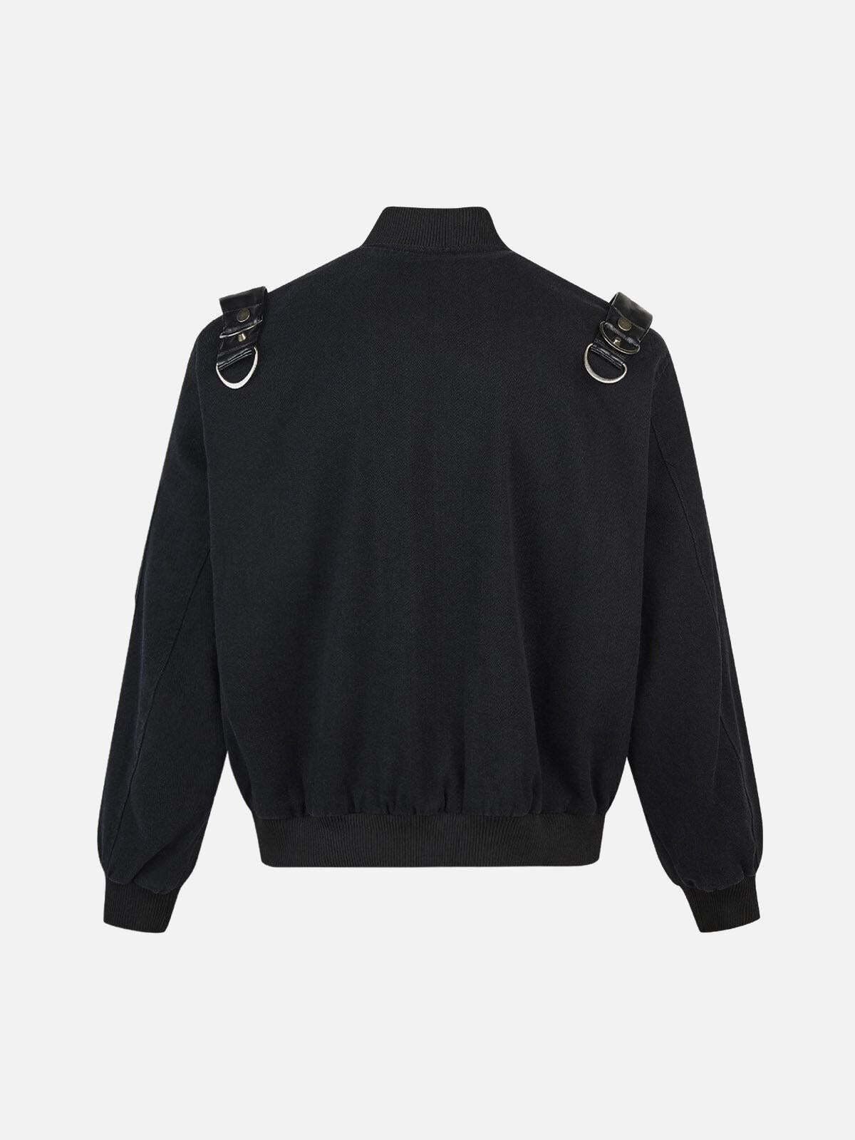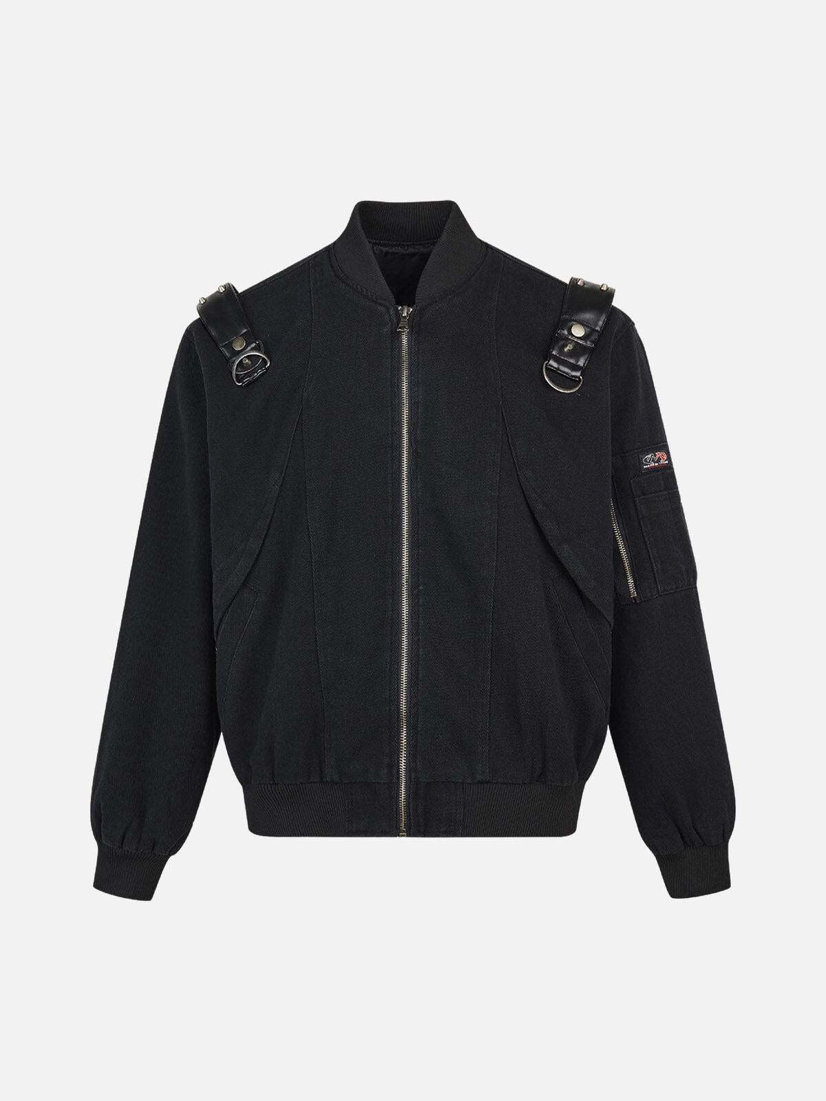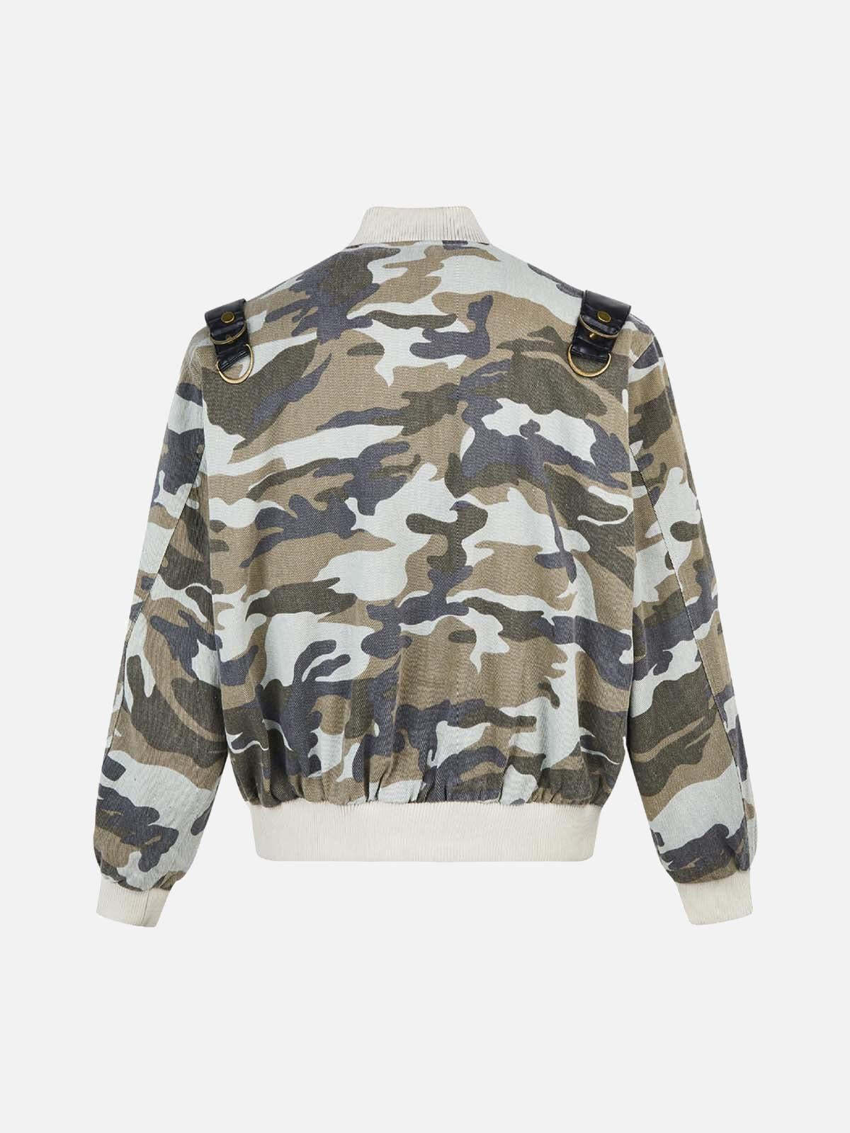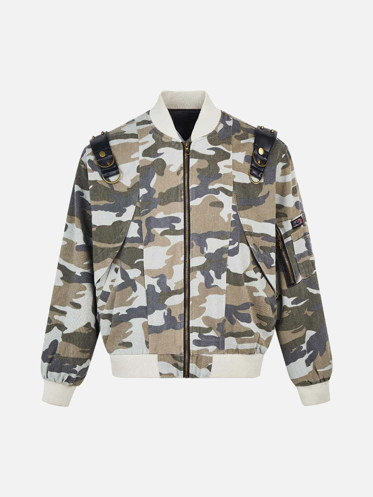 Transform your urban look with this bold camouflage jacket, where rugged meets refined. The intricate camo pattern, accented by sleek black leather straps, merges streetwear fashion with a touch of rebellion. Designed for a confident fit, this piece offers effortless versatility in sizes from M to 2XL. The bomber’s textured fabric and robust zippers add an edge to any y2k outfit, whether you’re hitting the streets or the scene. Available in both classic black and daring camouflage, this jacket is your new go-to for standout style. Elevate your outfit ideas and make every moment count with this essential piece.
