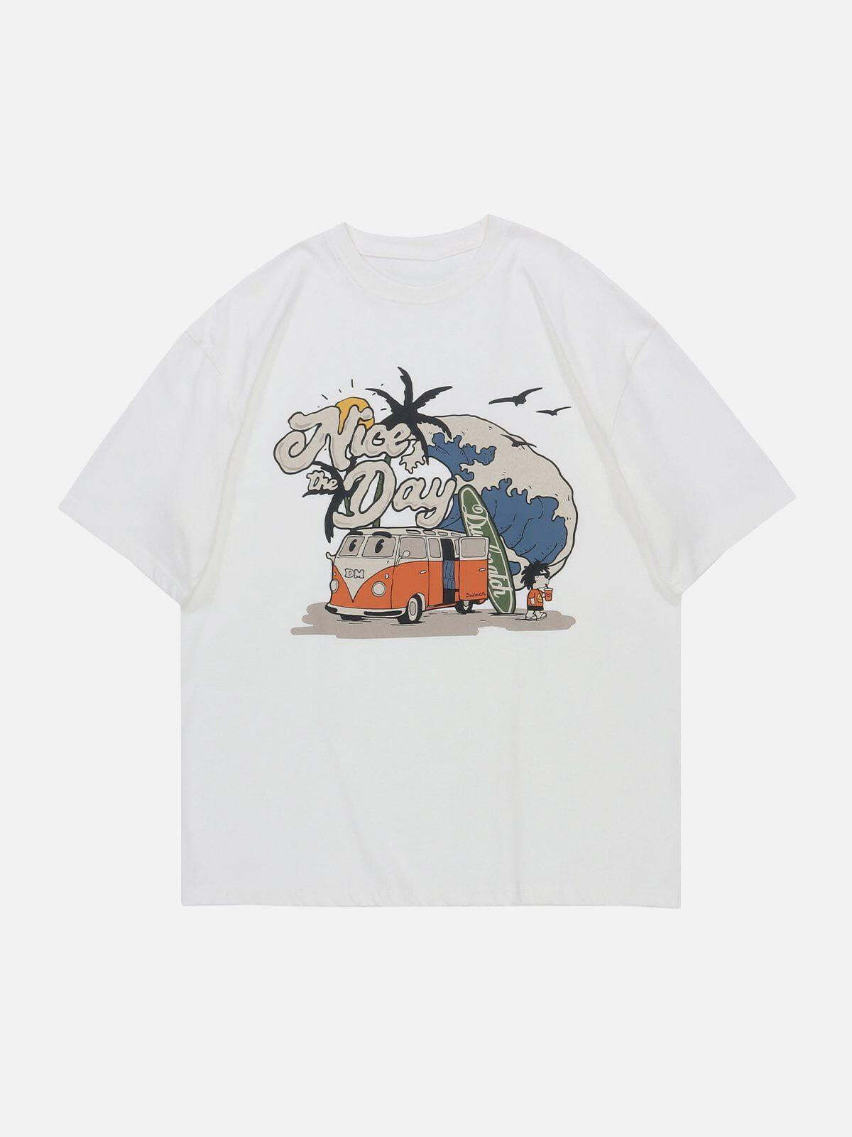 Ride the wave of endless summer vibes with this bold tee, where vibrant graphics of surfboards, beach scenes, and retro vans splash across the crisp white canvas. The smooth, breathable texture offers a relaxed fit, making it an ideal pick for those laid-back afternoons or spontaneous beach getaways. Available in sizes from S to XL, this shirt ensures everyone can embrace their inner adventurer, whether you’re chilling by the waves or cruising the city streets. Slip into this tee for a fresh injection of summer style and let your wardrobe catch the breeze.