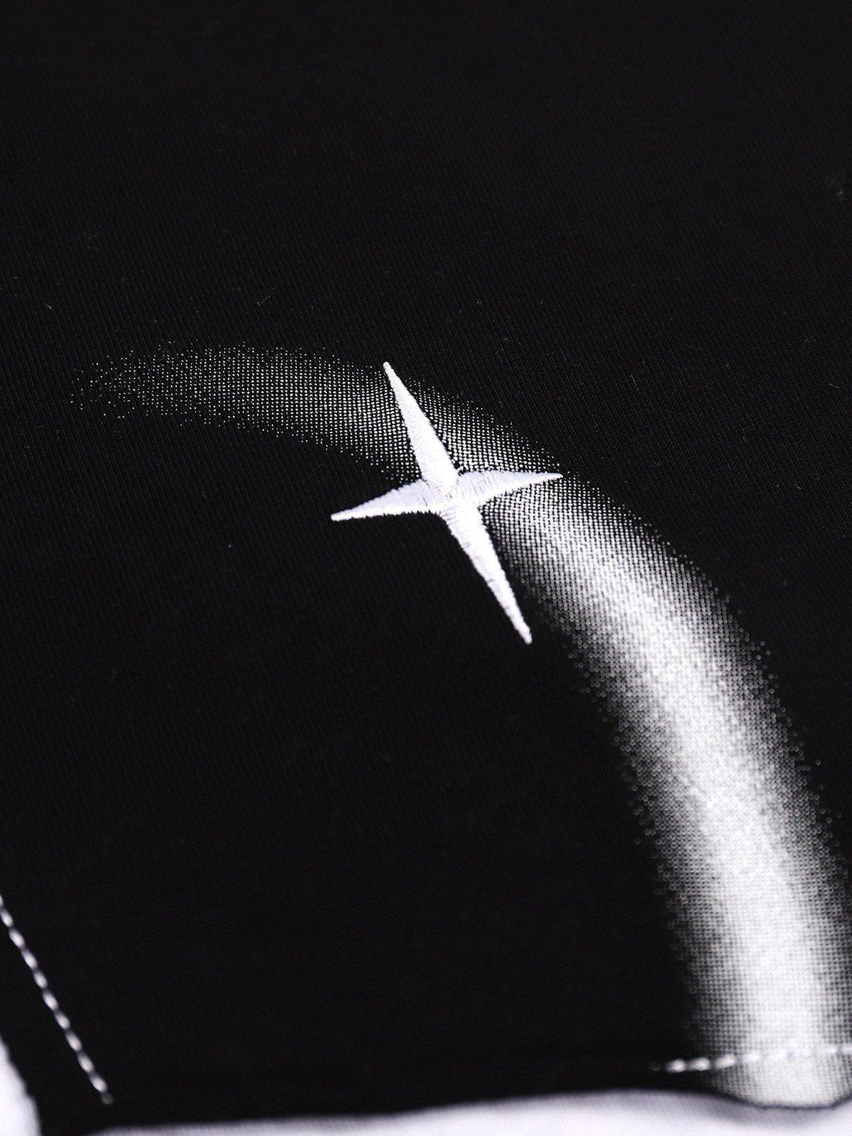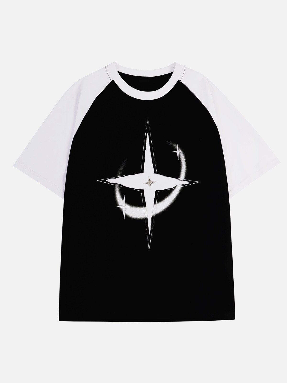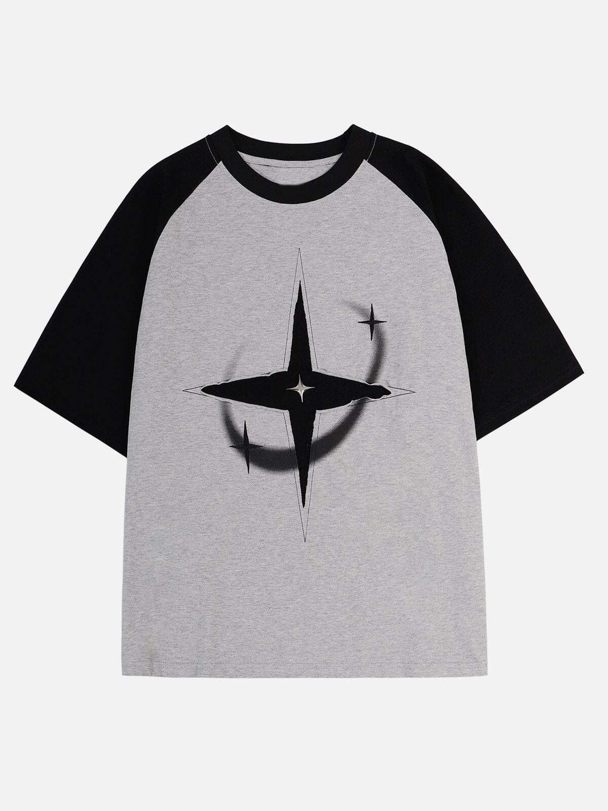 Infuse your summer style with a touch of cosmic energy with this striking tee, featuring a bold star graphic that commands the center stage. The contrasting black body and sleek white sleeves create a dynamic look that’s both edgy and versatile. Crafted for comfort and available in sizes S to XL, it effortlessly fits into any wardrobe, whether you’re hitting the streets in black, gray, or white. Pair it with your favorite kicks for a look that’s pure summer fashion inspo. Ready to redefine your casual game?
