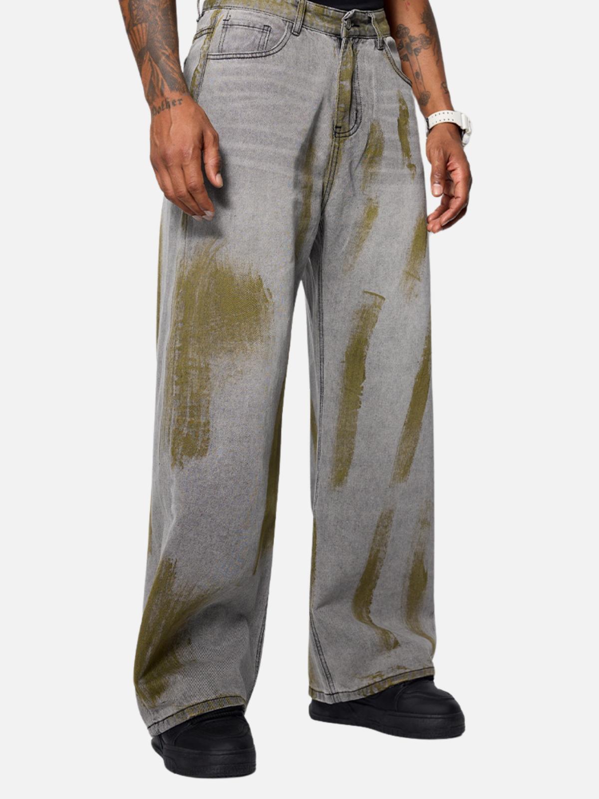 Embrace the artful clash of style and rebellion with these striking pants, where urban grit meets avant-garde flair. The bold strokes of olive on a gray canvas create a raw, dynamic texture that stands out in the streetwear fashion scene. Designed in a relaxed, one-size fit, these pants offer a comfortable yet edgy vibe, perfect for those chasing the ultimate y2k outfits. Whether you’re heading to a gallery opening or just owning the sidewalk, pair them with a sleek black tee for effortless outfit inspo. Slip into these head-turners and redefine your wardrobe.