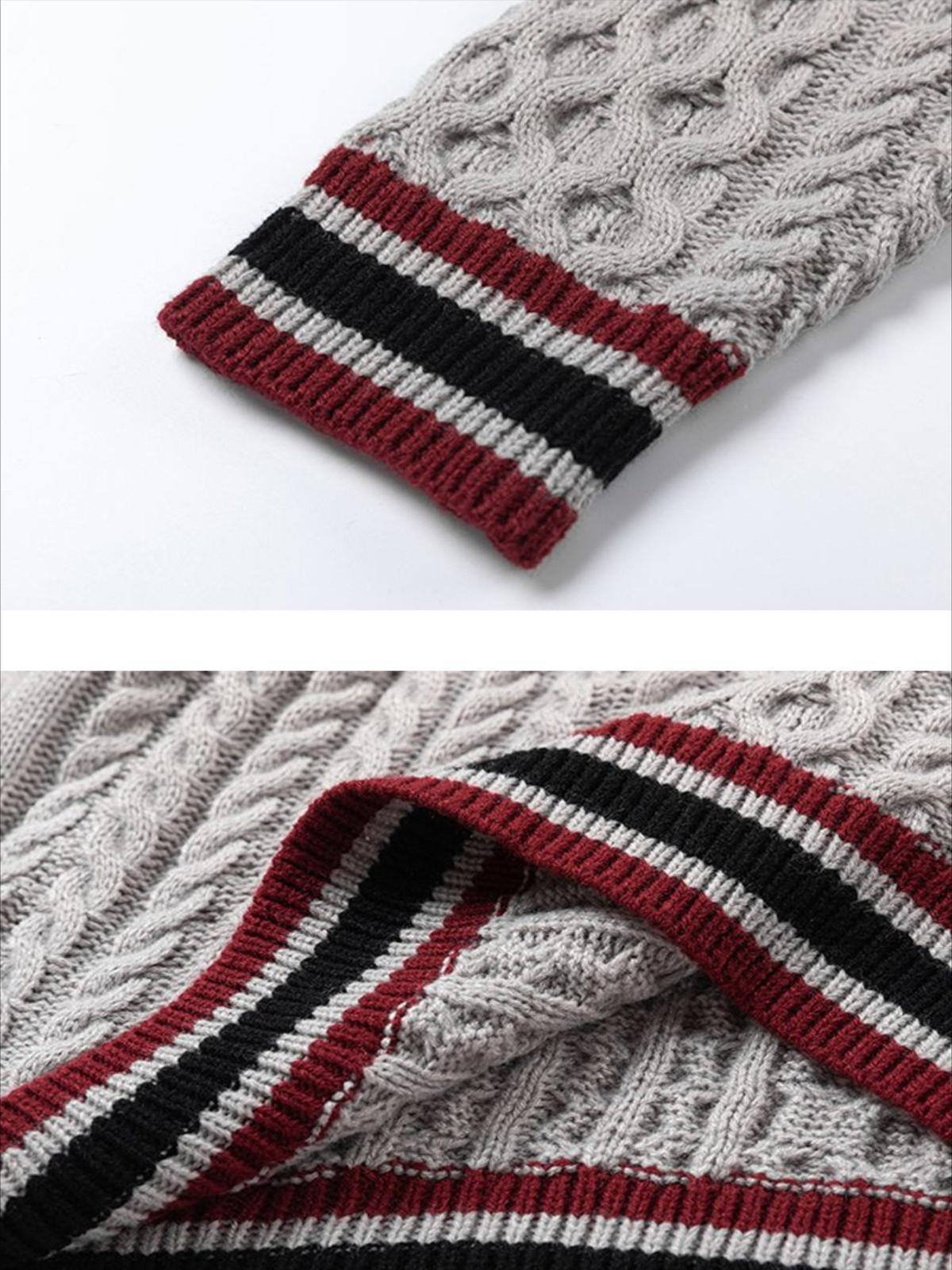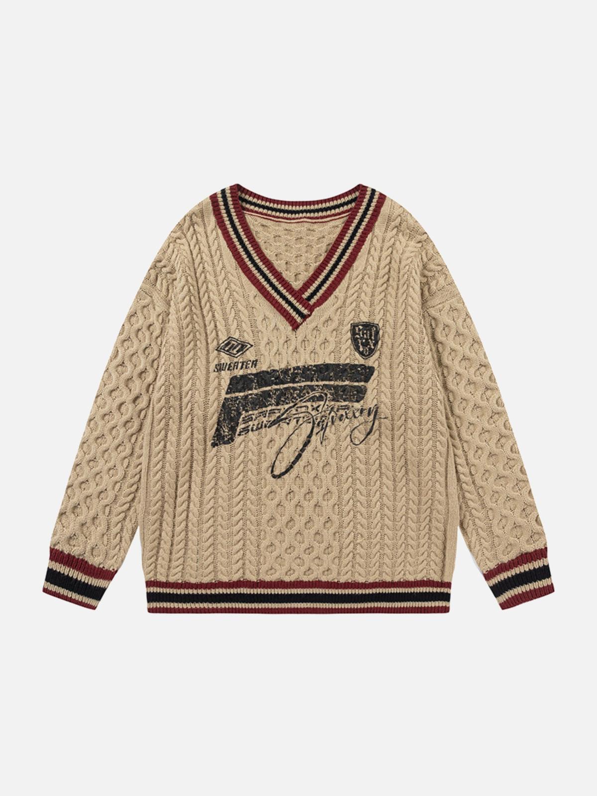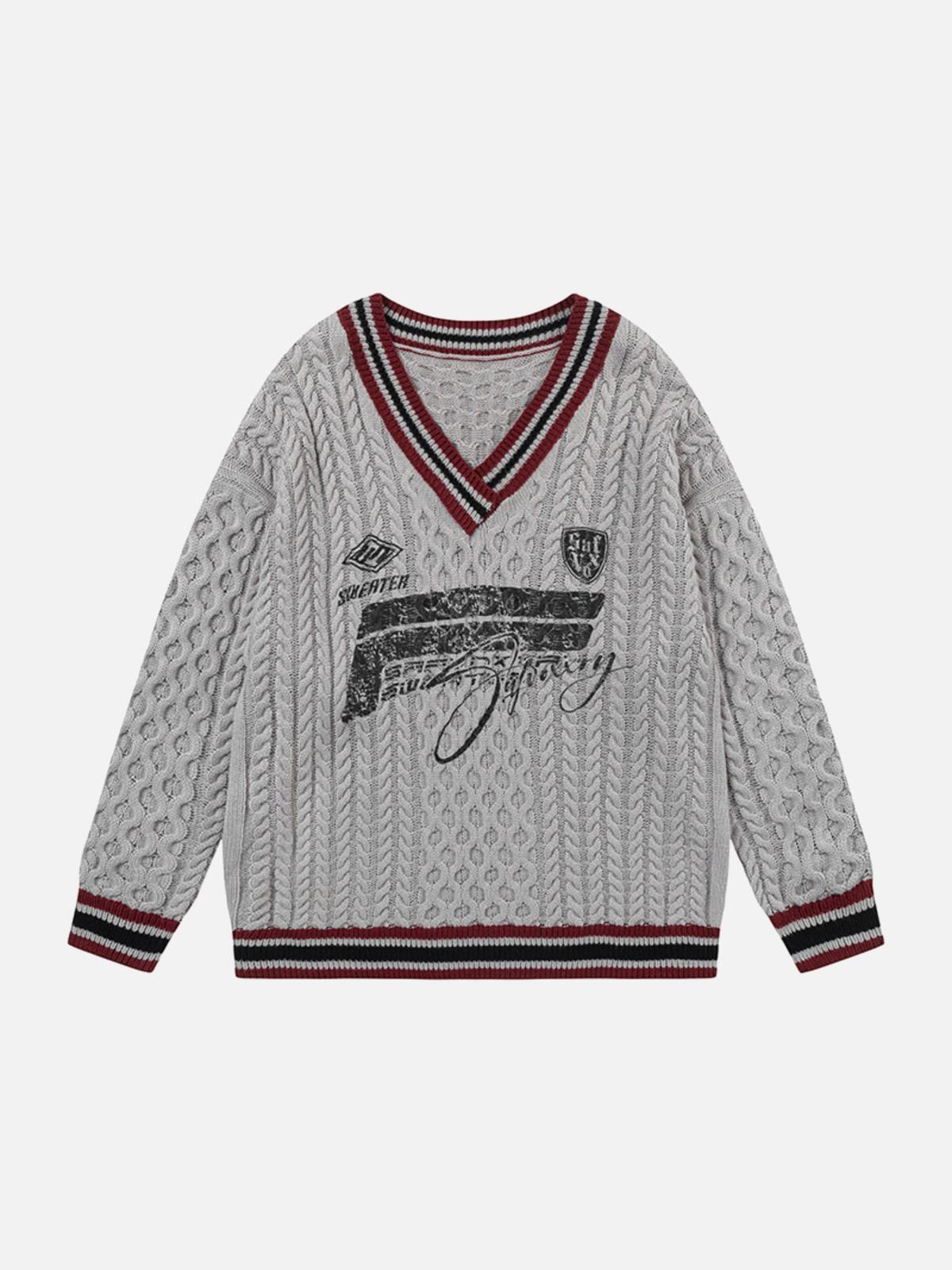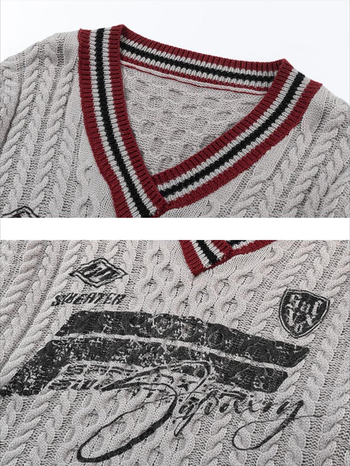 Redefine your streetwear game with this knit masterpiece, boasting an intricate cable pattern that weaves together urban flair and classic comfort. The bold V-neckline is accentuated by striking maroon and black stripes, effortlessly merging with the contemporary graphic print that speaks volumes without saying a word. Available in versatile Gray and Khaki, this one-size piece ensures a relaxed fit that complements any Y2K-inspired outfit. Layer it over a crisp white tee or pair it with distressed jeans for outfit inspo that stands out. Dive into streetwear fashion with confidence.