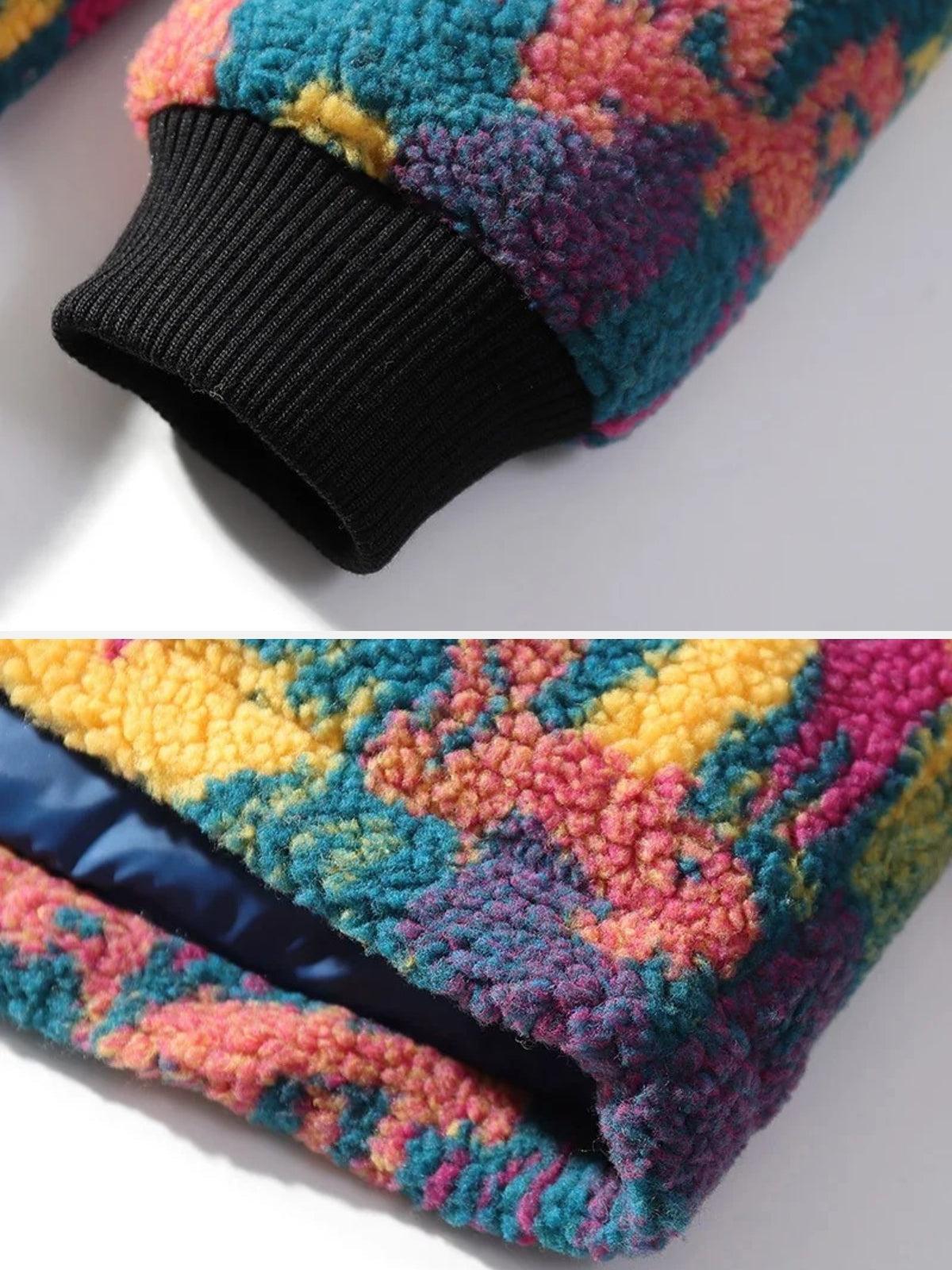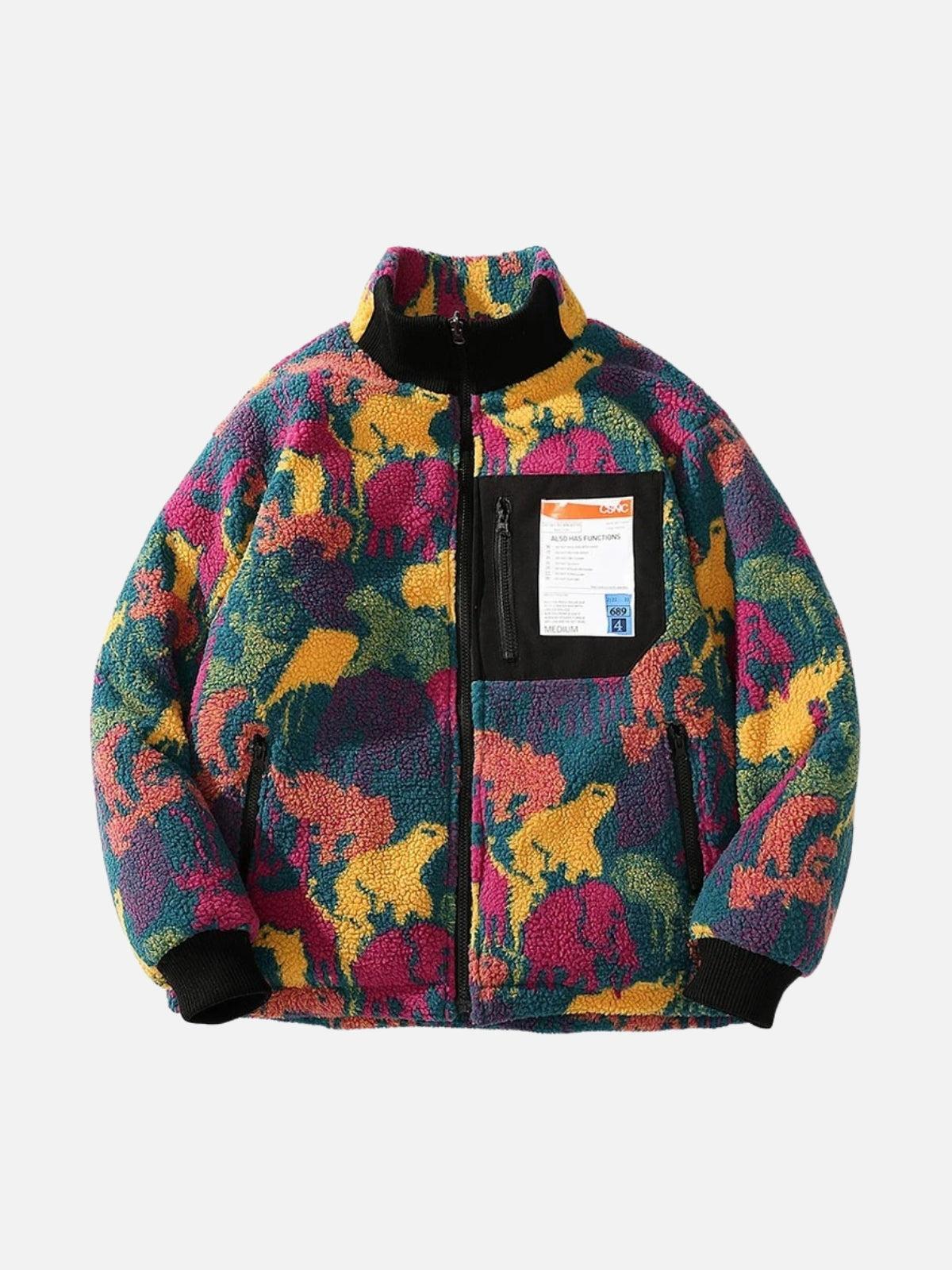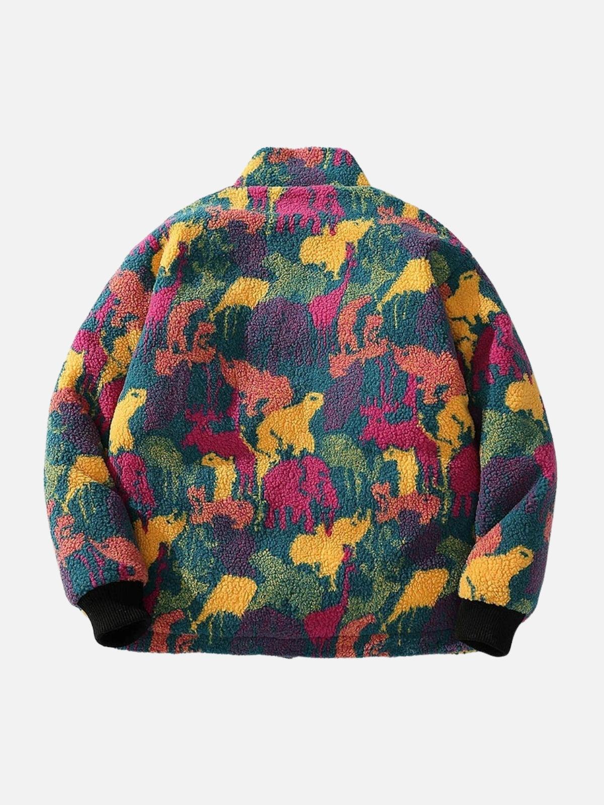 Dare to break the mold with this vibrant sherpa jacket, where bold hues of pink, yellow, and teal collide in an unapologetic dance of color and texture. The plush, tactile fabric wraps you in warmth, while the striking abstract animal print ensures you stand out in any urban jungle. Designed with a sleek black high collar and contrasting chest pocket, this piece effortlessly marries function and flair. Available in a versatile one-size-fits-all, it’s perfect for layering over your favorite y2k outfits or mixing into your streetwear fashion rotation. Embrace the unexpected and let your wardrobe roar with creativity.