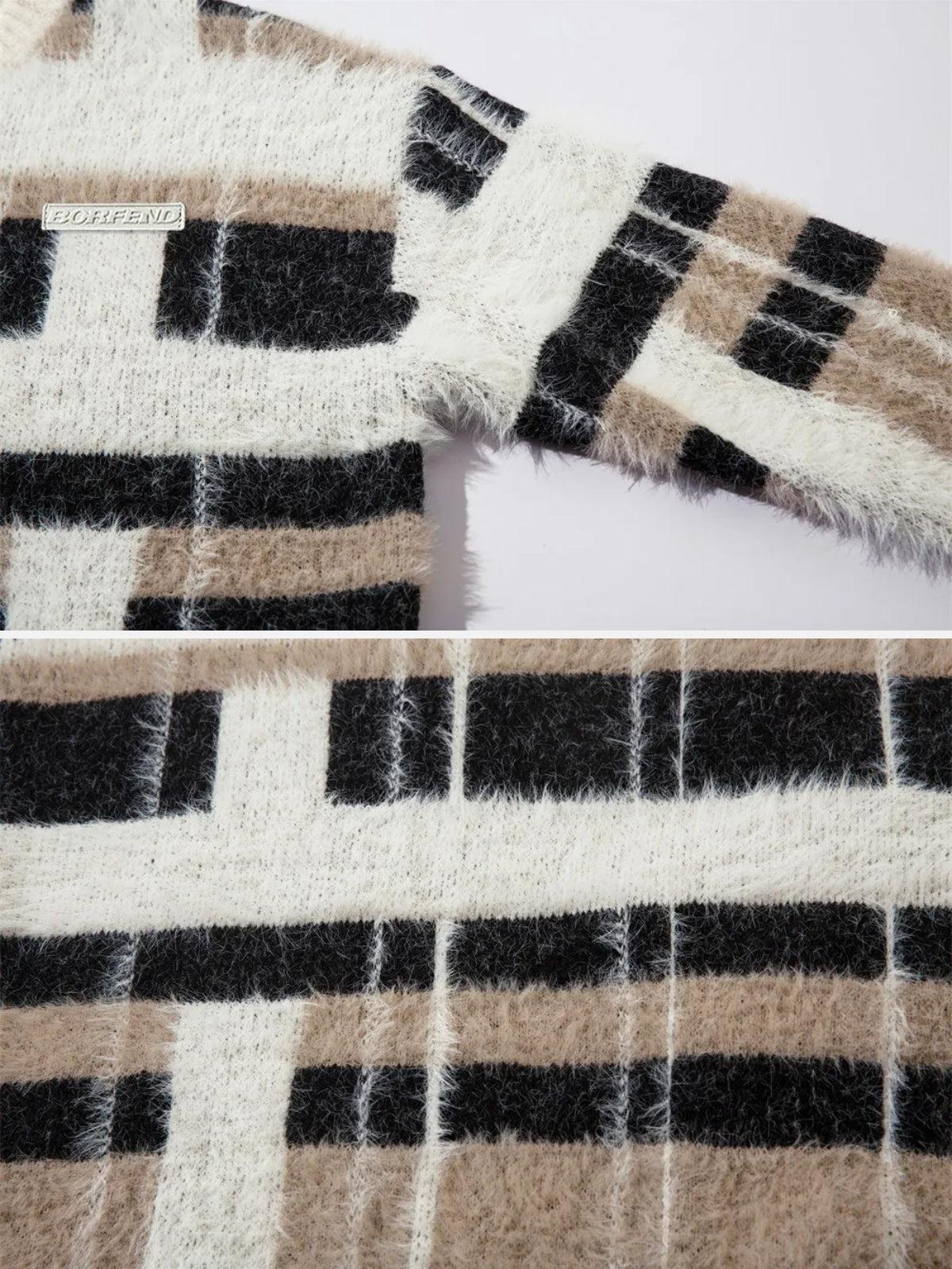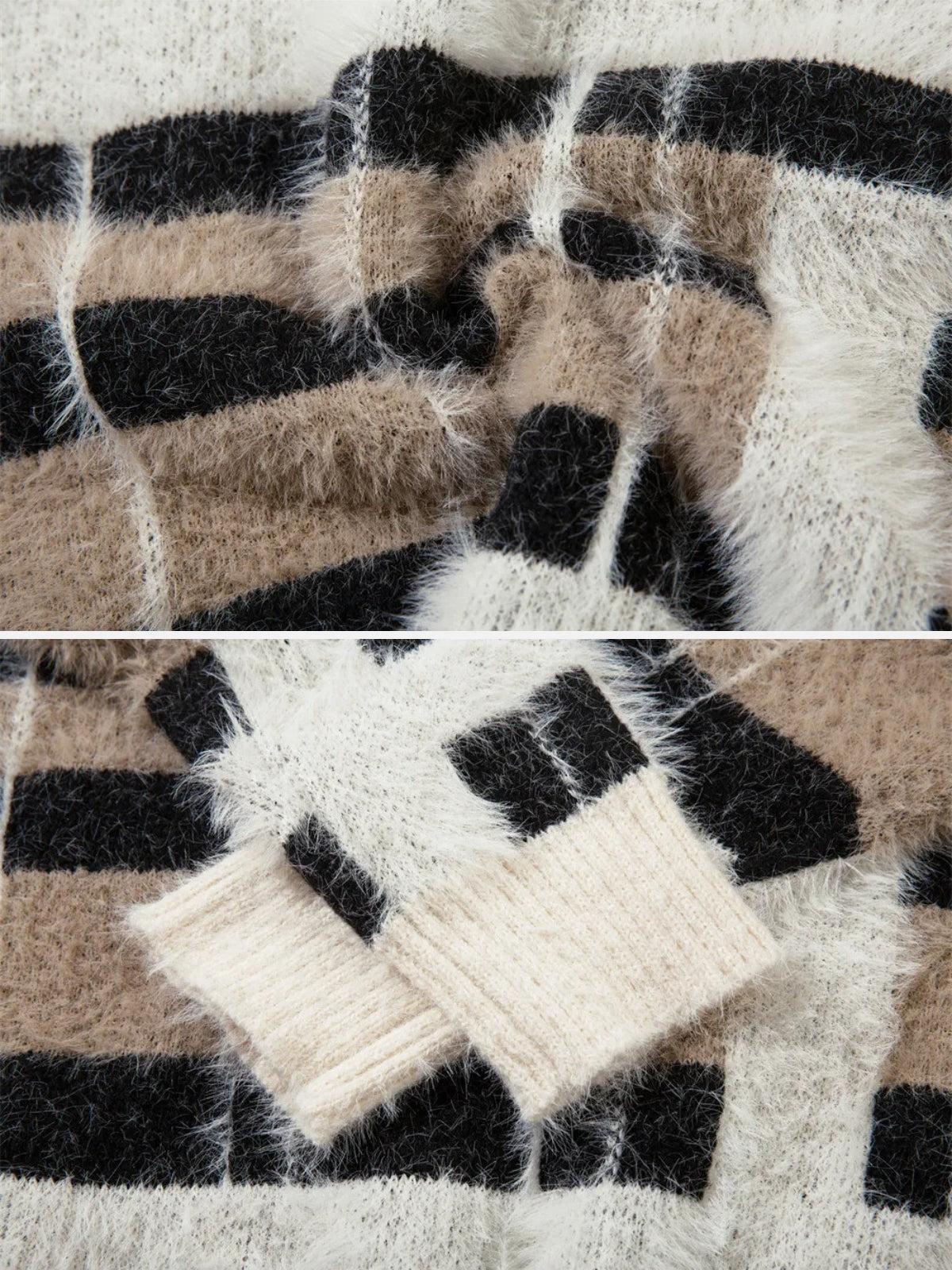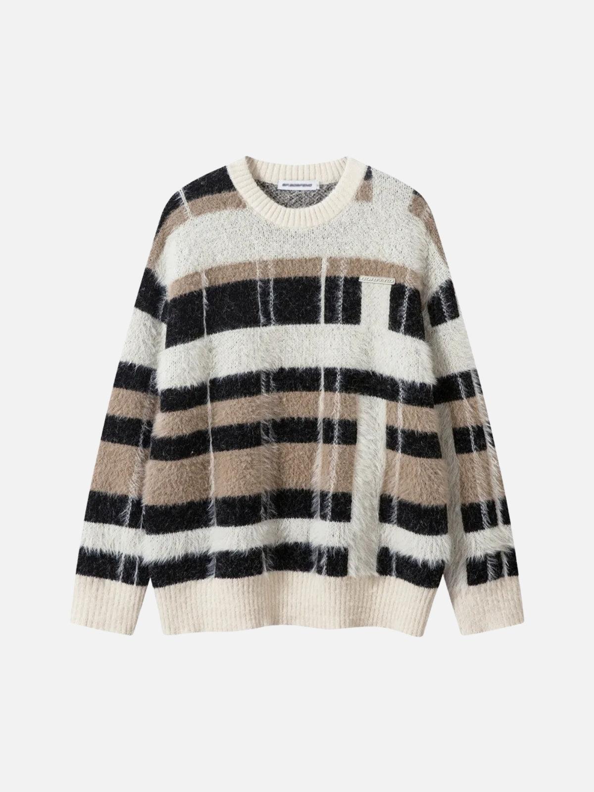 Embrace the urban rhythm with this bold sweater that intertwines geometric precision and soft textures, delivering a unique twist to streetwear fashion. The tactile allure of its thick, fuzzy knit is accentuated by striking black and tan stripes, seamlessly blending into a modern masterpiece that’s as comfortable as it is stylish. Available in both black and blue hues, this piece is designed to fit effortlessly into any wardrobe, with sizes ranging from S to XL ensuring the perfect fit. Pair it with your favorite denim or layer it over a crisp shirt for endless outfit inspo. Dive into the vibe and redefine your look effortlessly.