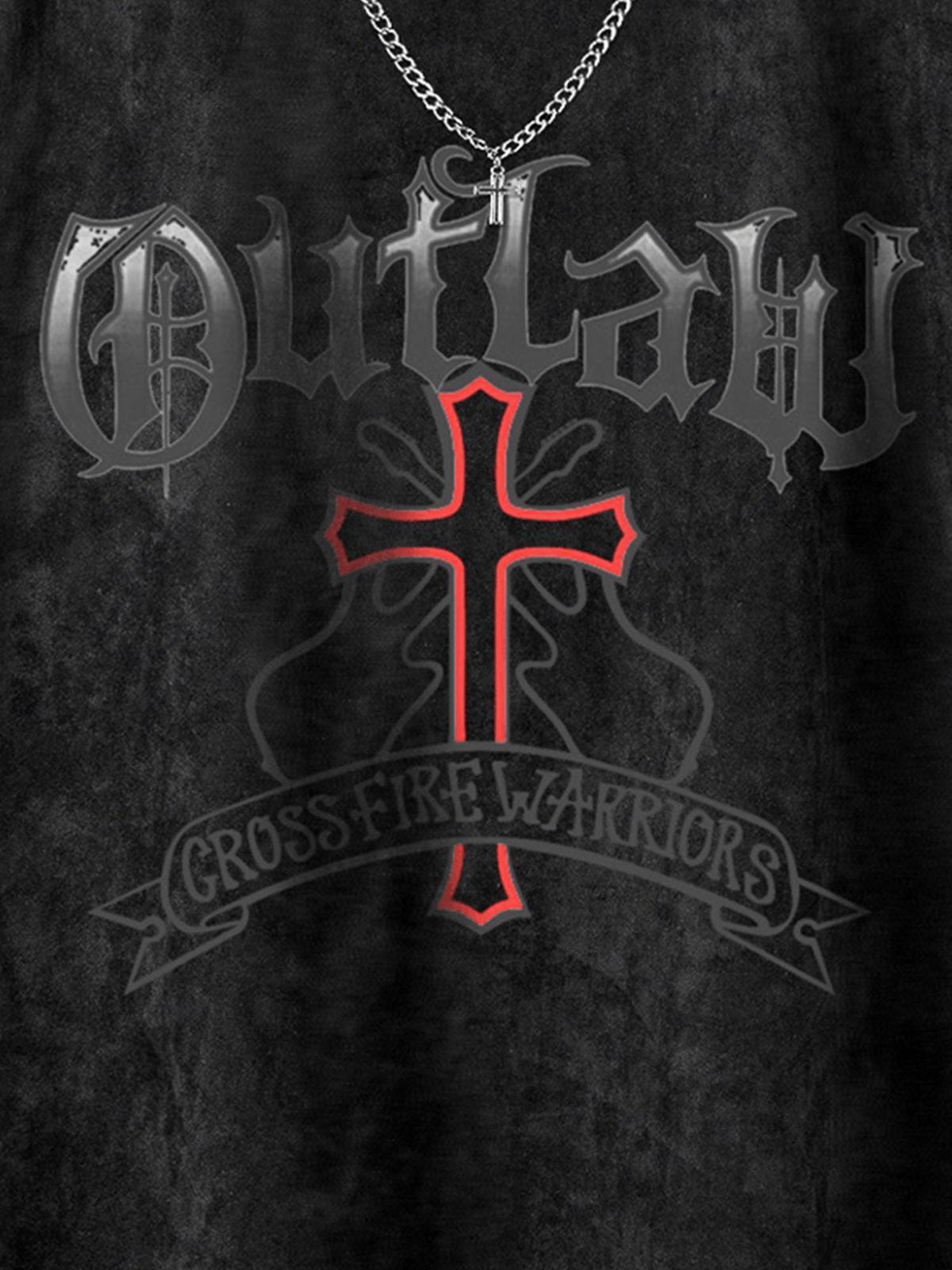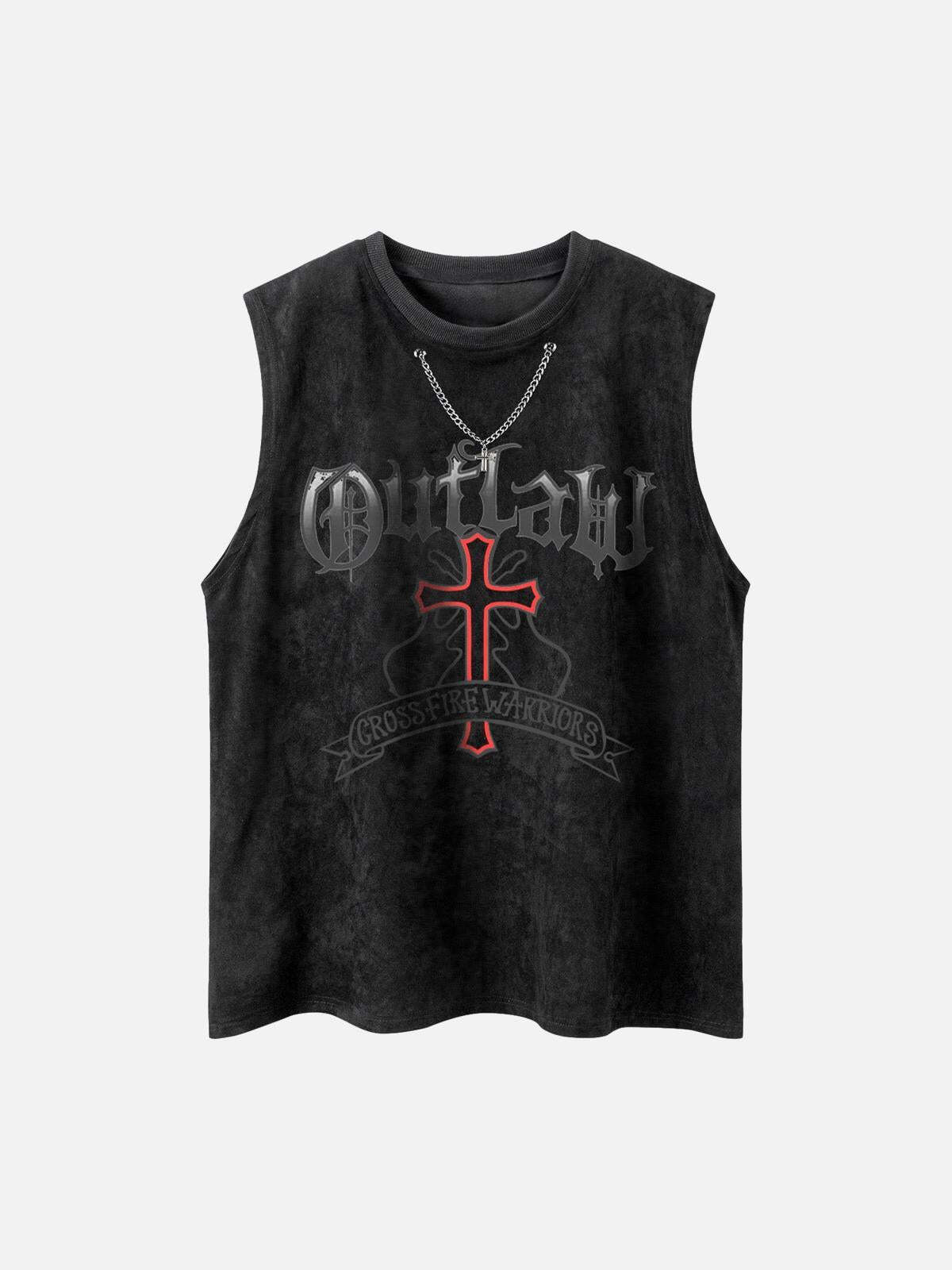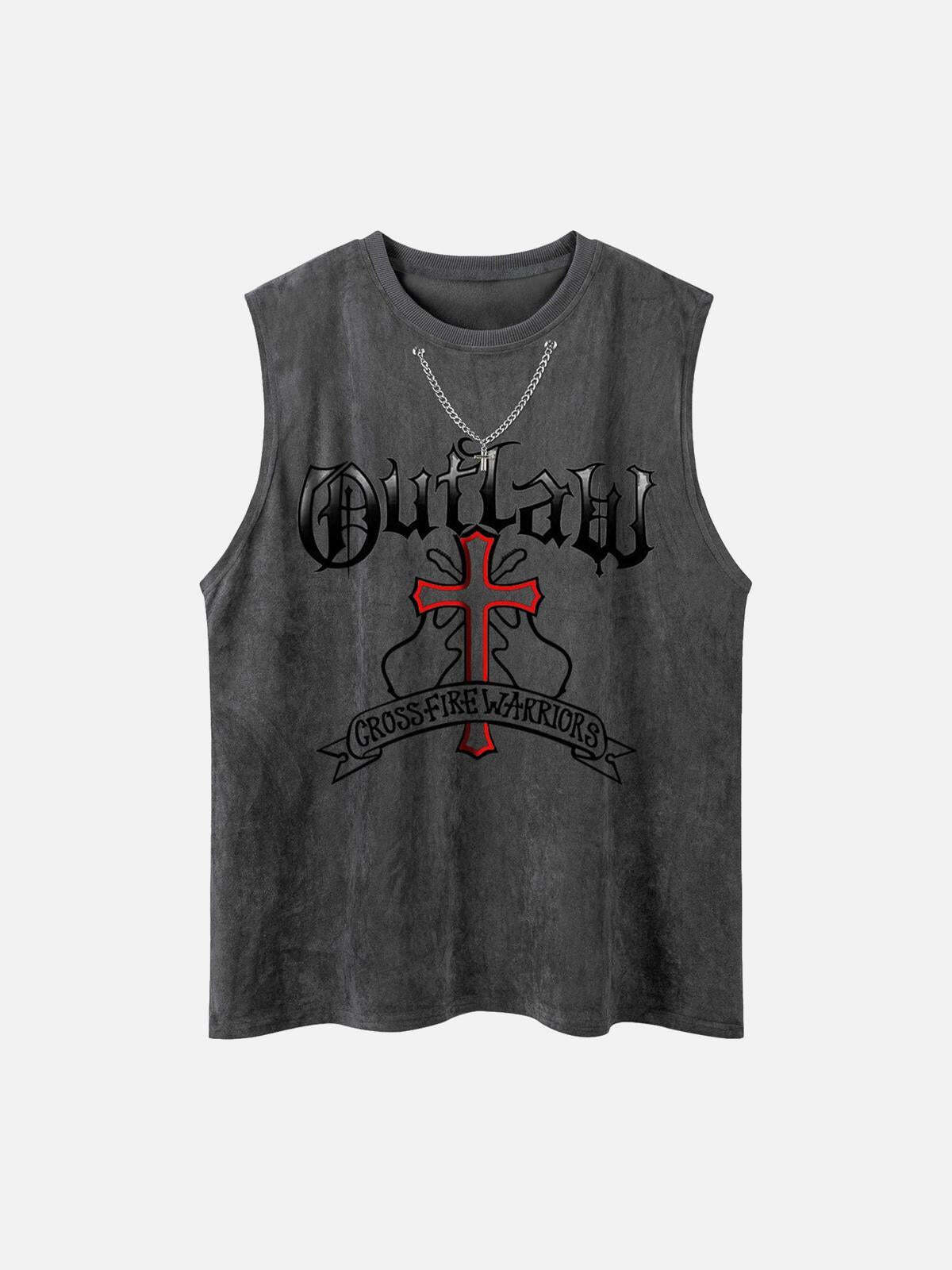 Break boundaries with a sleeveless tee that screams urban rebellion, featuring a bold ‘Outlaw’ graphic and a striking red cross design set against a textured dark gray backdrop. This top pushes the limits of streetwear fashion, effortlessly blending edgy aesthetics with versatile comfort. Whether you’re hitting the streets in Black or making a statement in Pink, each color choice offers its own vibe, while the relaxed fit provides the perfect canvas for layering up your y2k outfits. Available in sizes S through XL, it’s all about finding your perfect fit and embracing the warrior within. Pair it with your favorite distressed jeans or oversized shorts, and let your style do the talking.