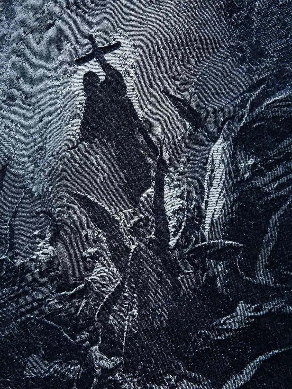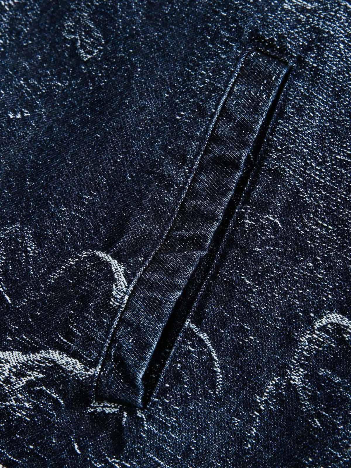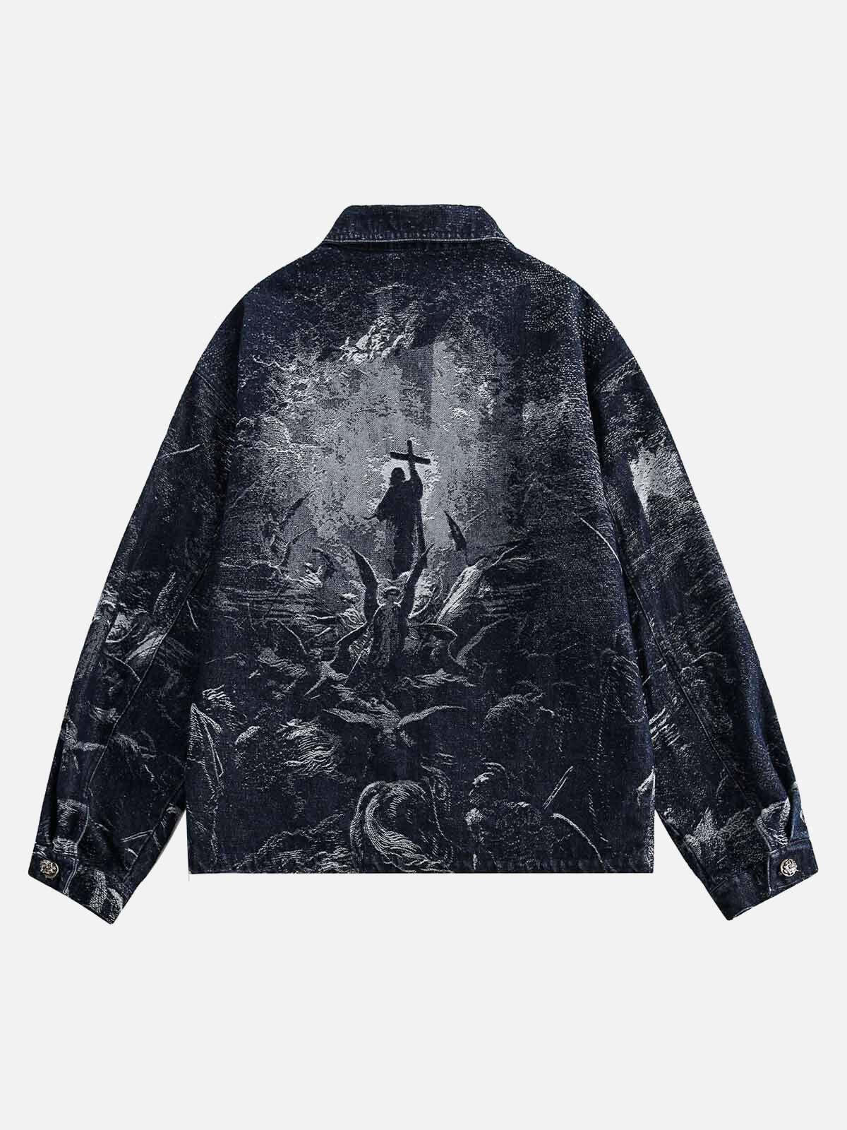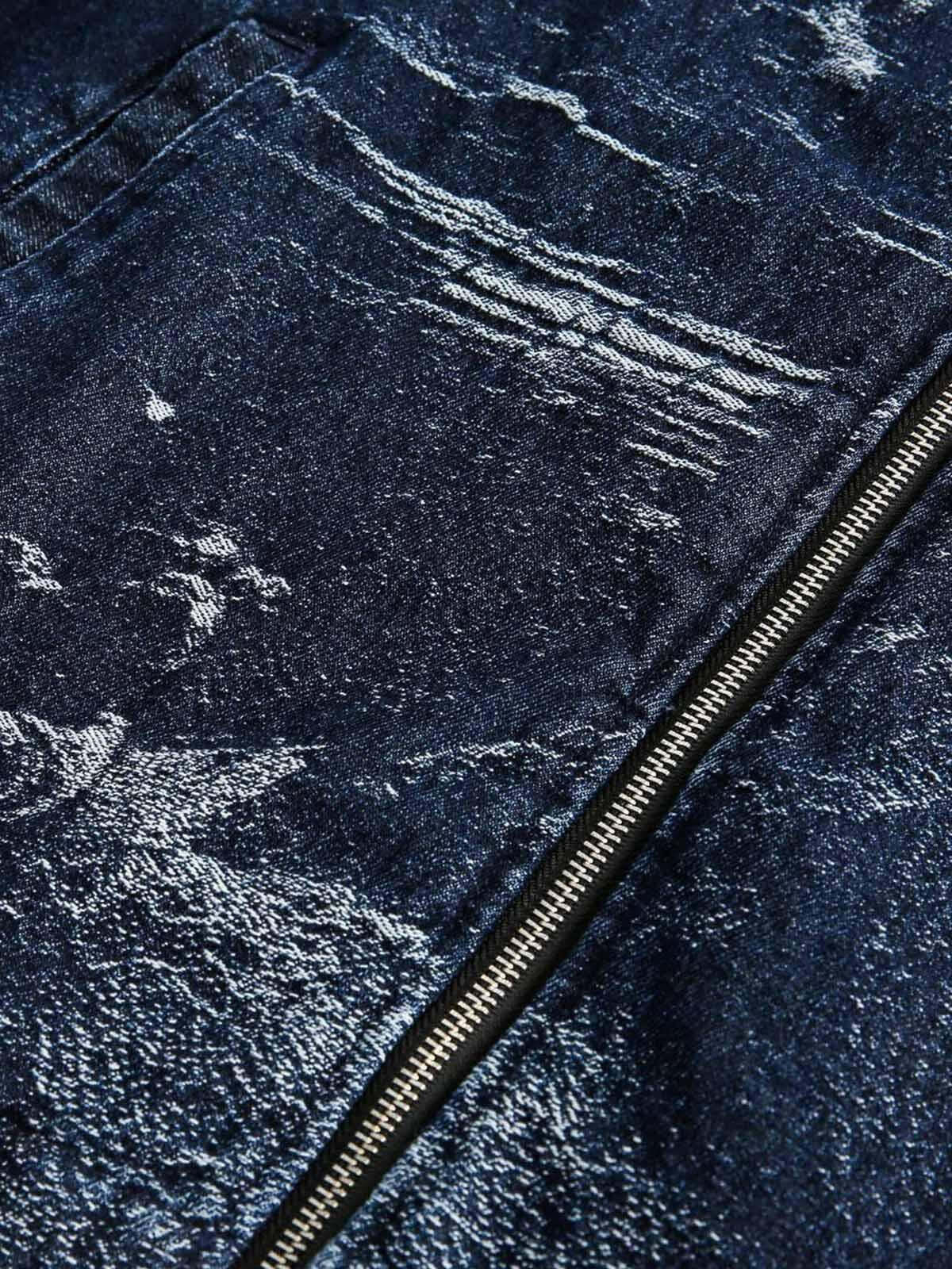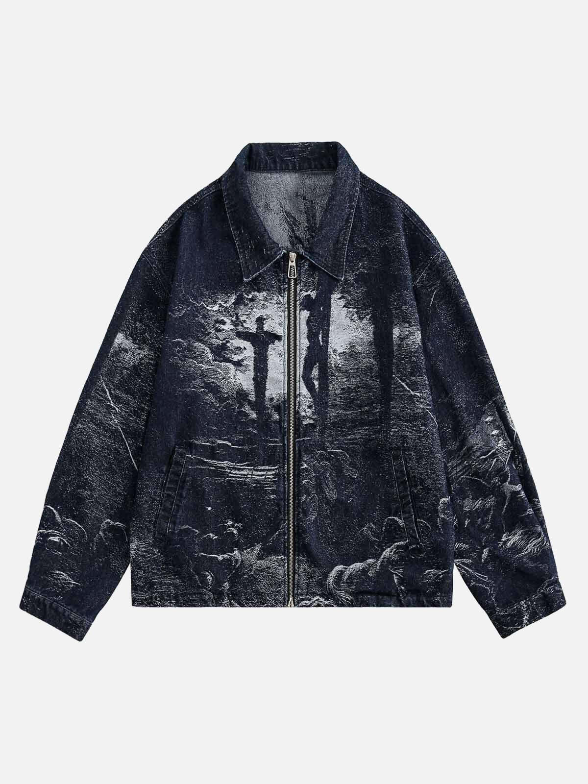 Stylish Concert Outfit: Cross Jacquard Zip-up Denim Jacket for Your Next Event