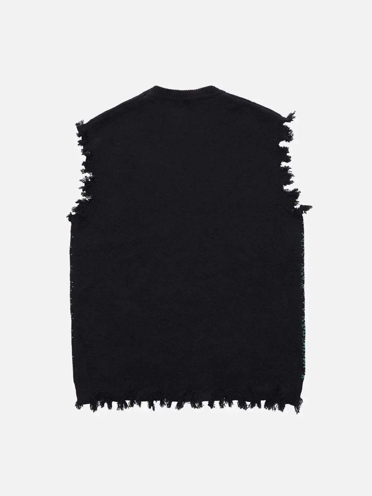 Step out with unapologetic edge in this striking sleeveless knit featuring a bold green graphic against a deep black canvas. The raw, distressed edges give it that rugged, street-ready vibe, perfectly balancing between modern streetwear fashion and the rebellious spirit of y2k outfits. Available in versatile shades of black and gray, and sizes from S to XL, it’s designed for those who dare to disrupt the norm. Pair it with your favorite cargos or layer it under a jacket for endless outfit ideas. Grab yours now and redefine your street style game.