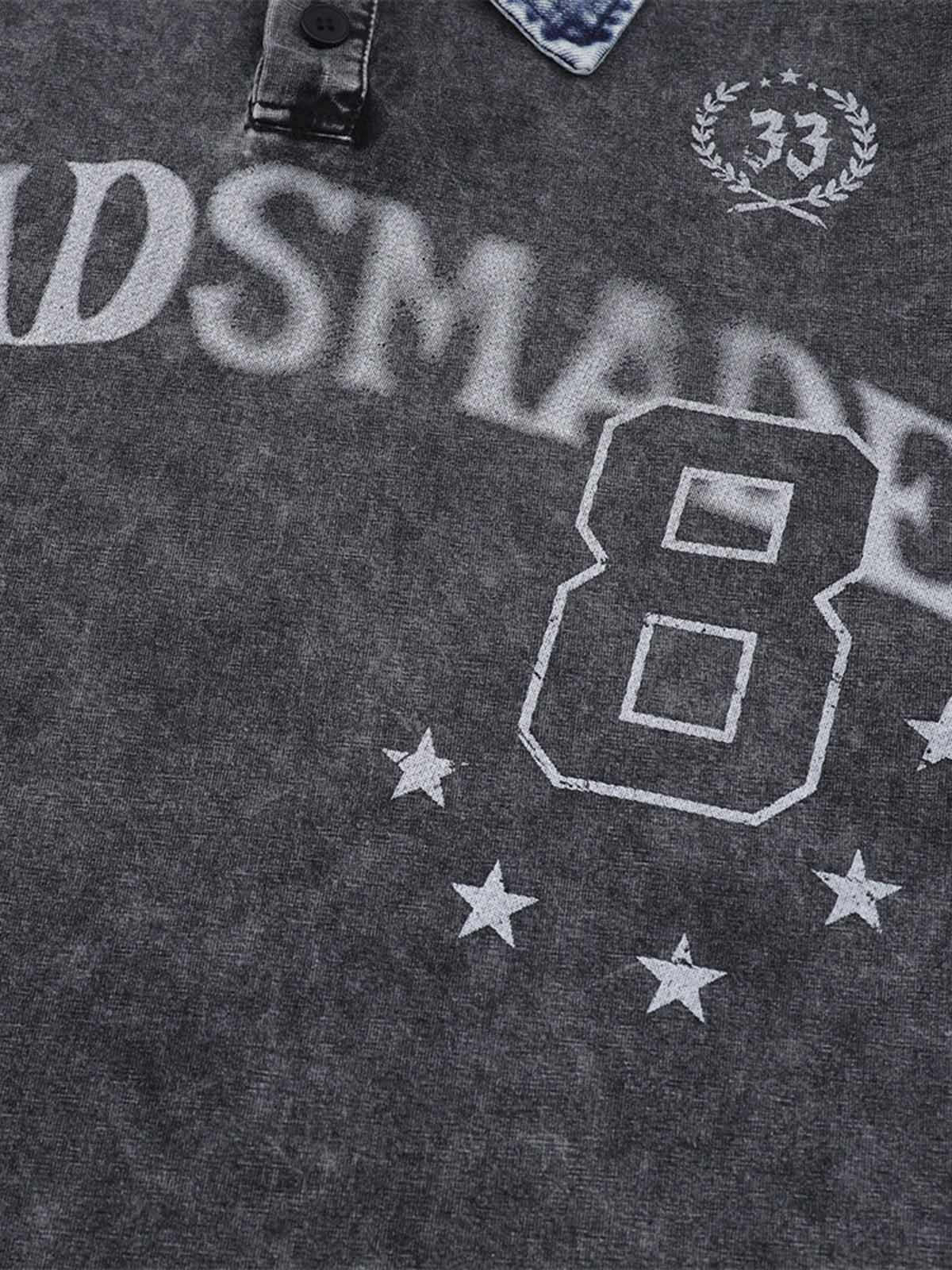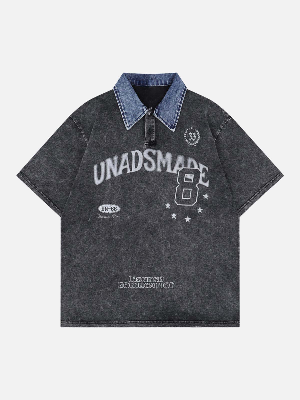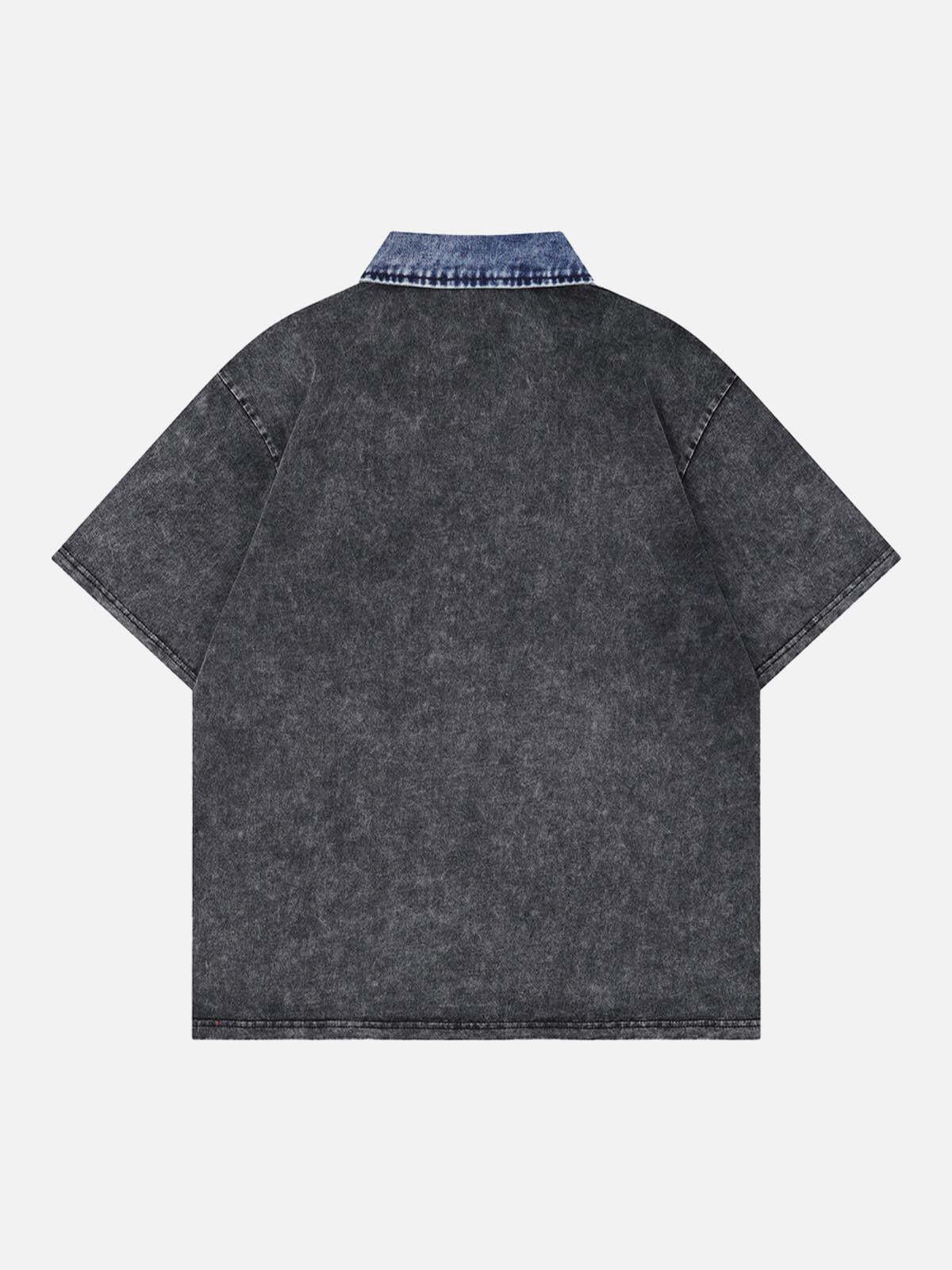 Break boundaries with a design that merges the essence of streetwear fashion and retro flair. This washed black tee boasts a bold graphic statement, accentuated by an unexpected denim collar that redefines casual cool. Crafted for a relaxed fit, it offers a versatile style that pairs effortlessly with your favorite y2k outfits. Available in sizes S to XL, this piece invites you to explore limitless outfit ideas. Embrace the vibe and redefine your wardrobe.