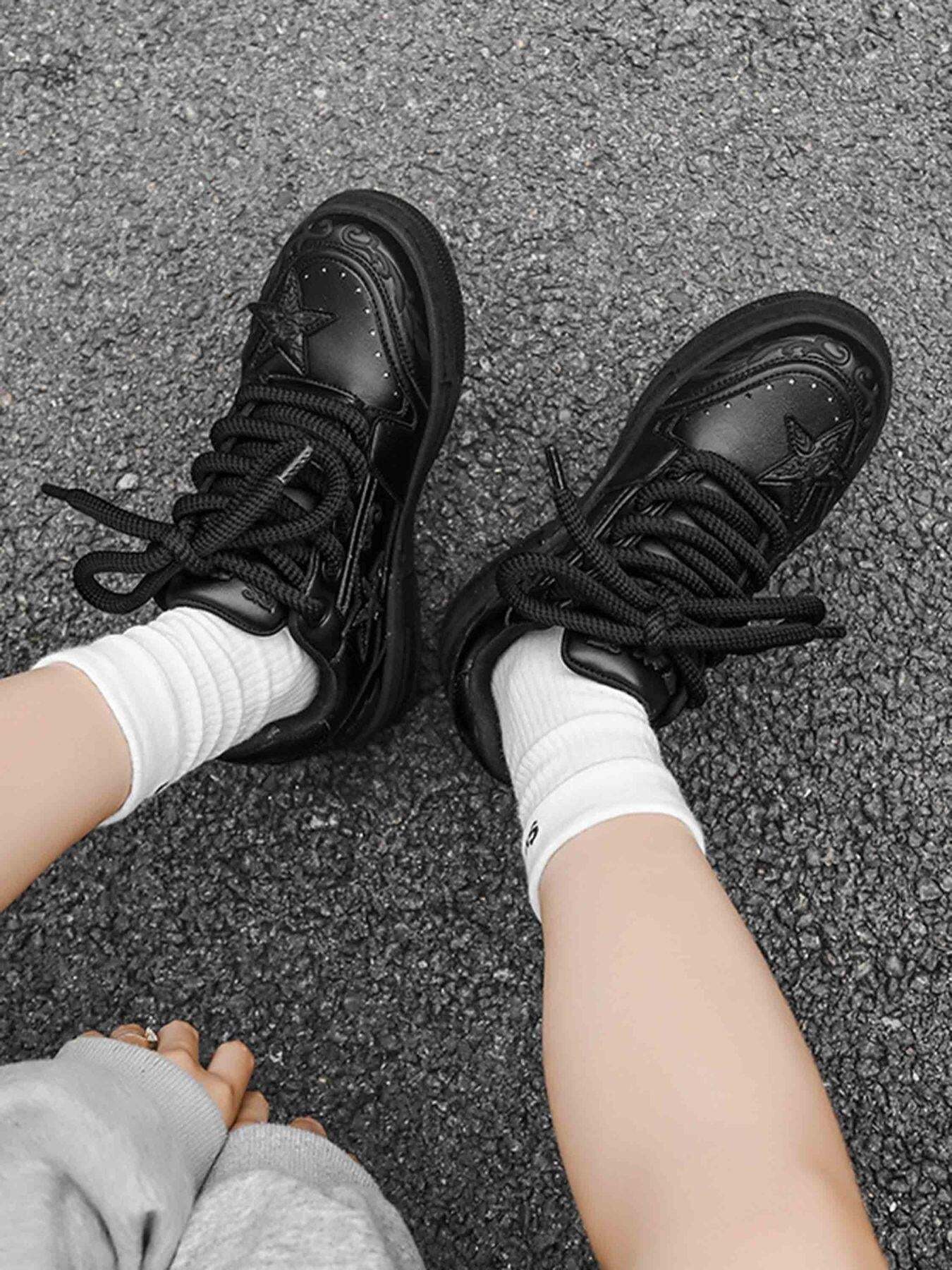 Stride into the future with these bold sneakers, where sleek black leather meets intricate star and swirl embossing, forging an unmistakable urban vibe. The textured design commands attention, offering a rugged yet stylish touch to your streetwear fashion lineup. Whether you’re pairing them with your favorite Y2K outfits or seeking fresh outfit inspo, these sneakers offer versatility and comfort with sizes ranging from 35 to 44. Available in both black and white, they’re the perfect fit for every look, every day. Step up your game and let your kicks do the talking.