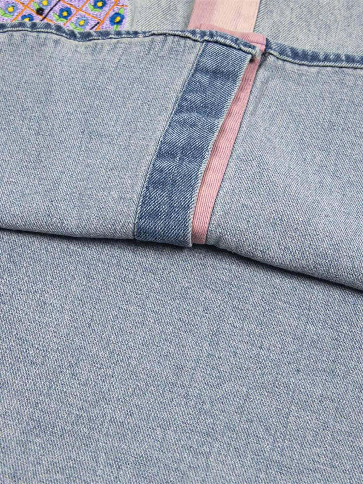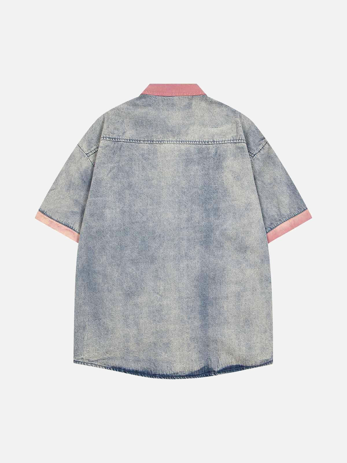 Embrace a playful vibe with this denim shirt, where whimsical embroidery meets urban style. The vibrant mix of colorful sweater patches and quirky details create a standout piece that breaks the mold of ordinary streetwear fashion. The faded blue denim is perfectly contrasted by a bold pink collar and cuffs, making it a versatile choice for both y2k outfits and modern street looks. Available in M, L, and XL, this shirt offers a relaxed fit that effortlessly pairs with your favorite jeans or cargos. Grab yours and let your wardrobe reflect your unique style.