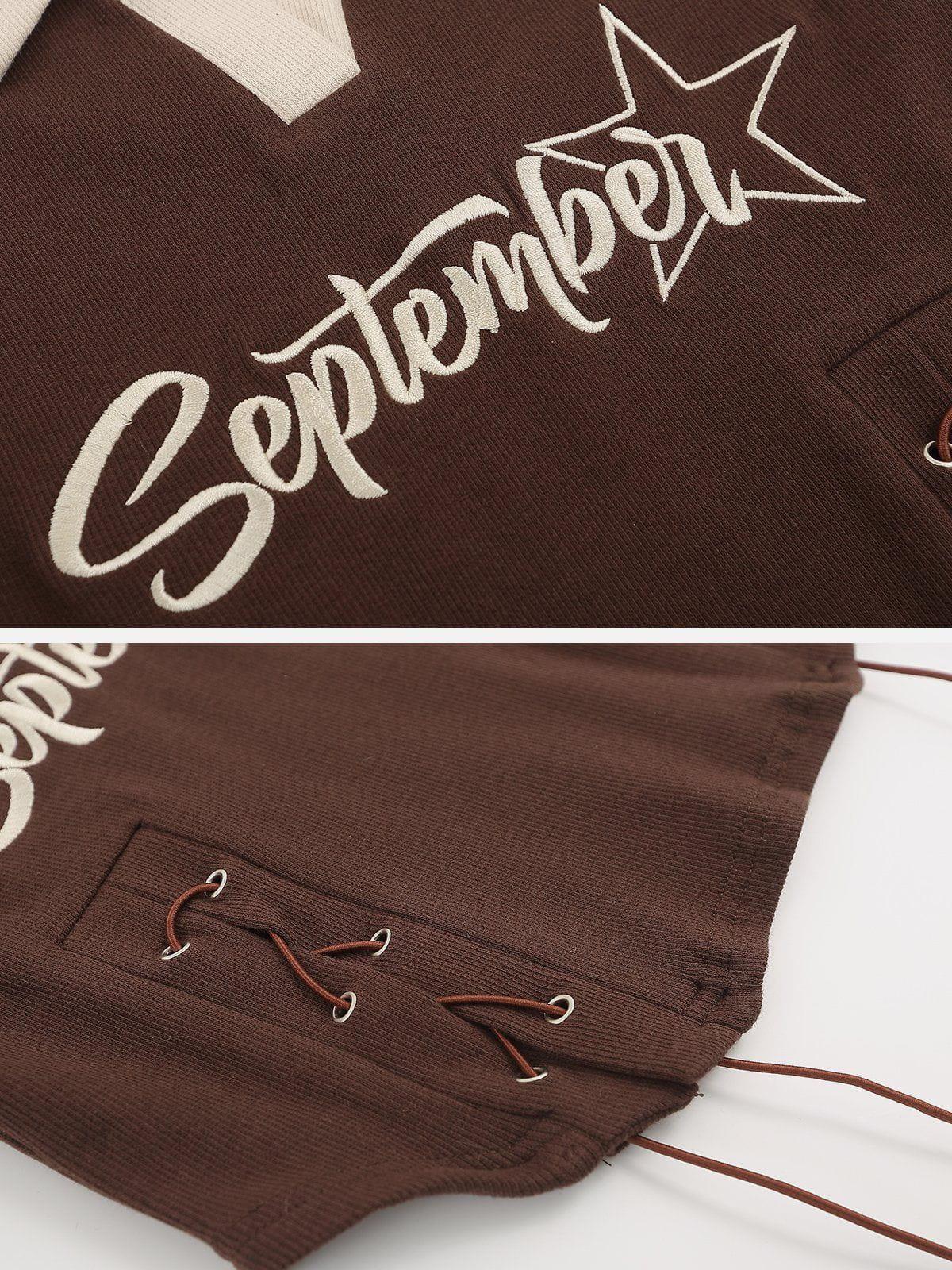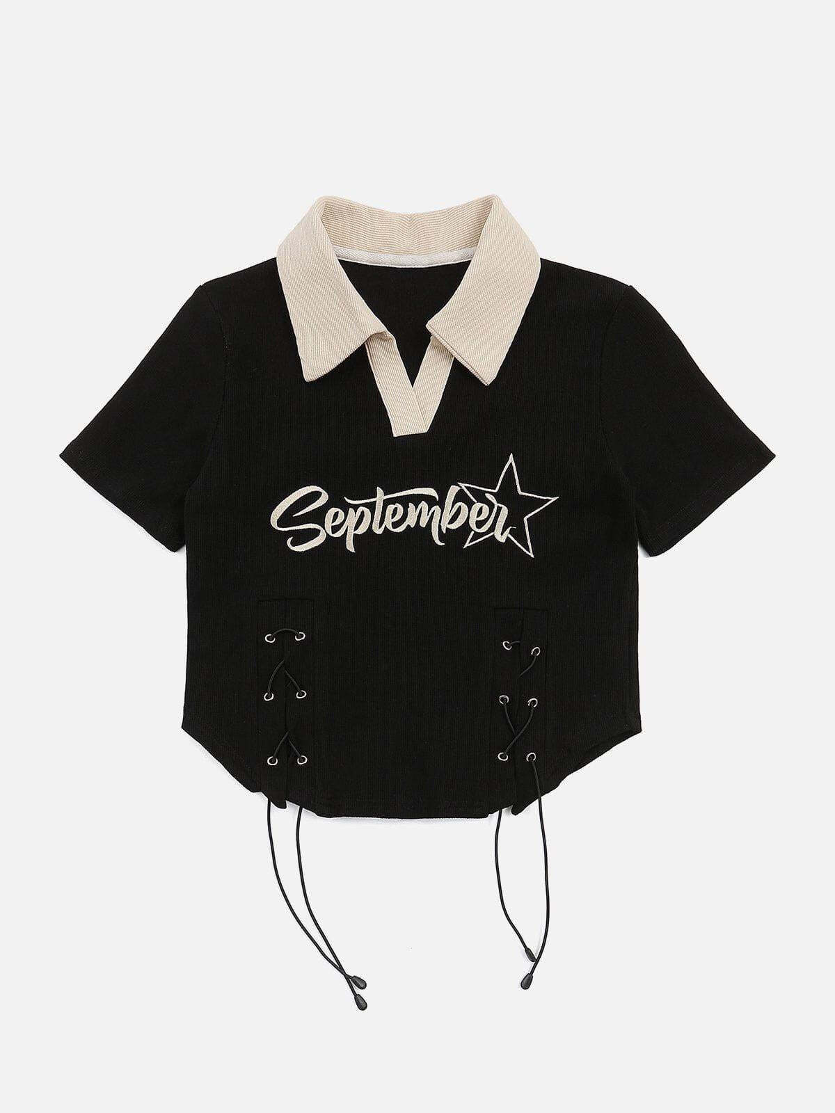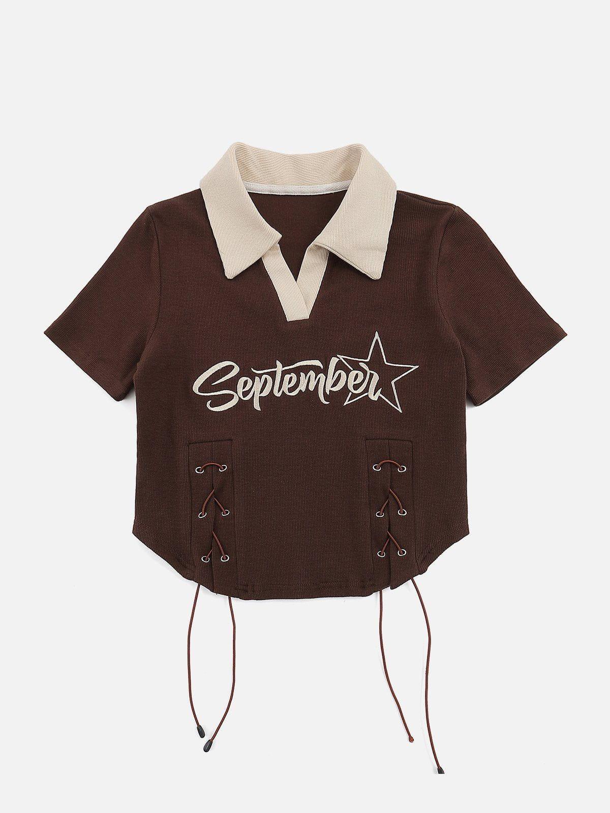 Turn heads with this daring, coffee-hued top, featuring a standout beige collar that screams urban sophistication. The bold ‘September’ graphic and star detail add a playful twist, perfectly complemented by the edgy lace-up sides that infuse a rebellious spirit. Designed for a relaxed fit, this piece is your go-to for effortless summer style, available in versatile sizes S and M. Pair it with your favorite denim or layer it up for that ultimate summer fashion inspo. Don’t let this season pass without it.