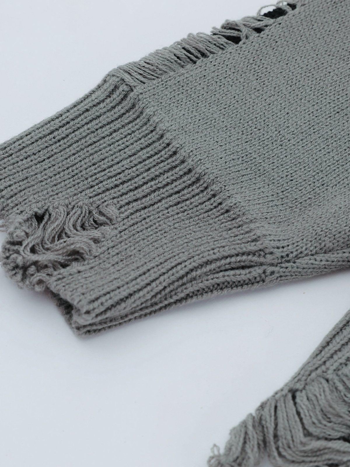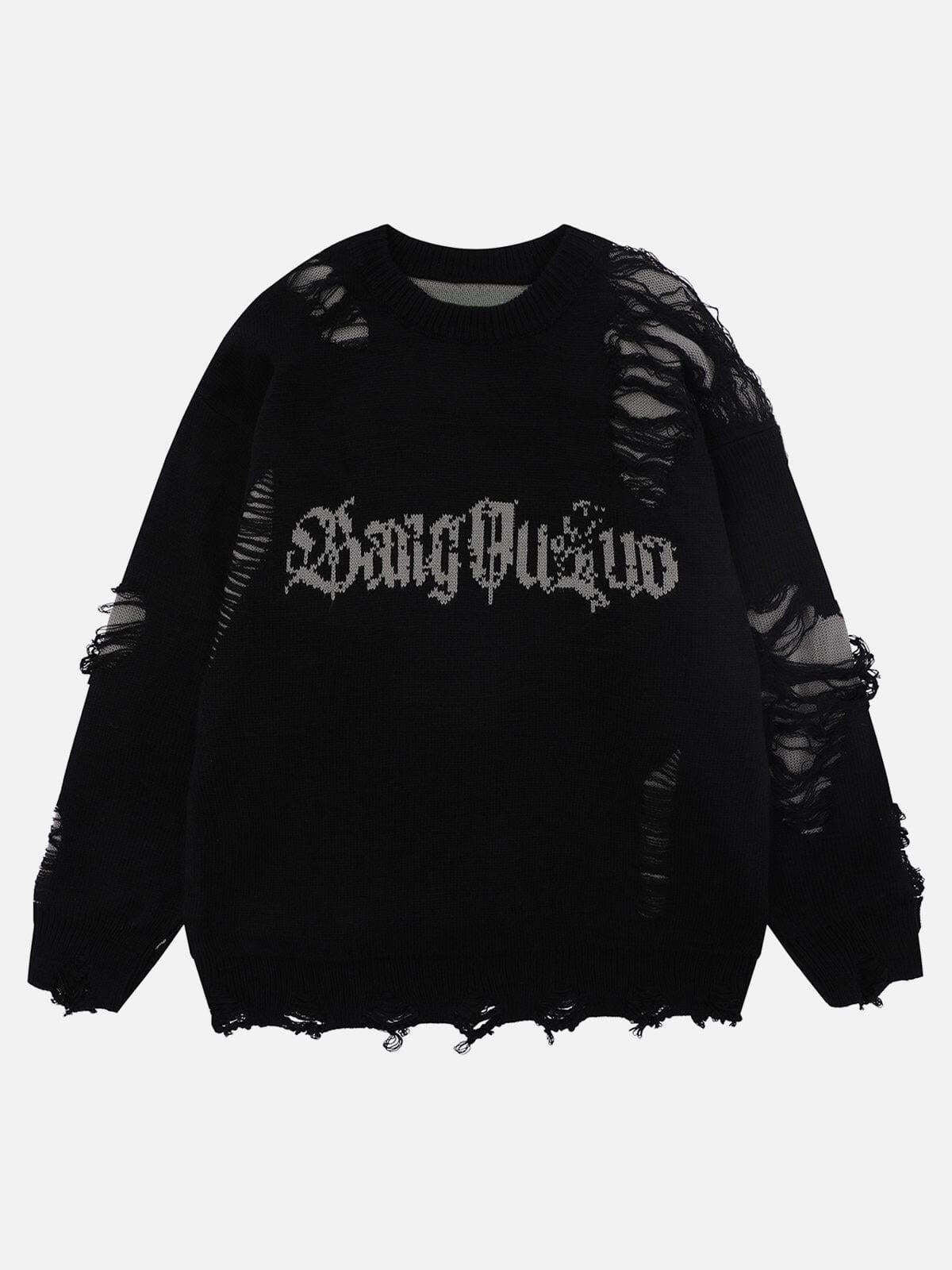 Embrace the unapologetic edge of modern streetwear with this distressed sweater that screams urban rebellion. The meticulously frayed edges and bold, gothic lettering across the chest create a raw texture that demands attention. Available in both a sleek black and a versatile gray, this piece offers size options from XS to L, ensuring the perfect fit for your unique style. Pair it with baggy jeans or layer it over a crisp tee for those ultimate y2k outfit vibes. Ready to redefine your streetwear fashion?