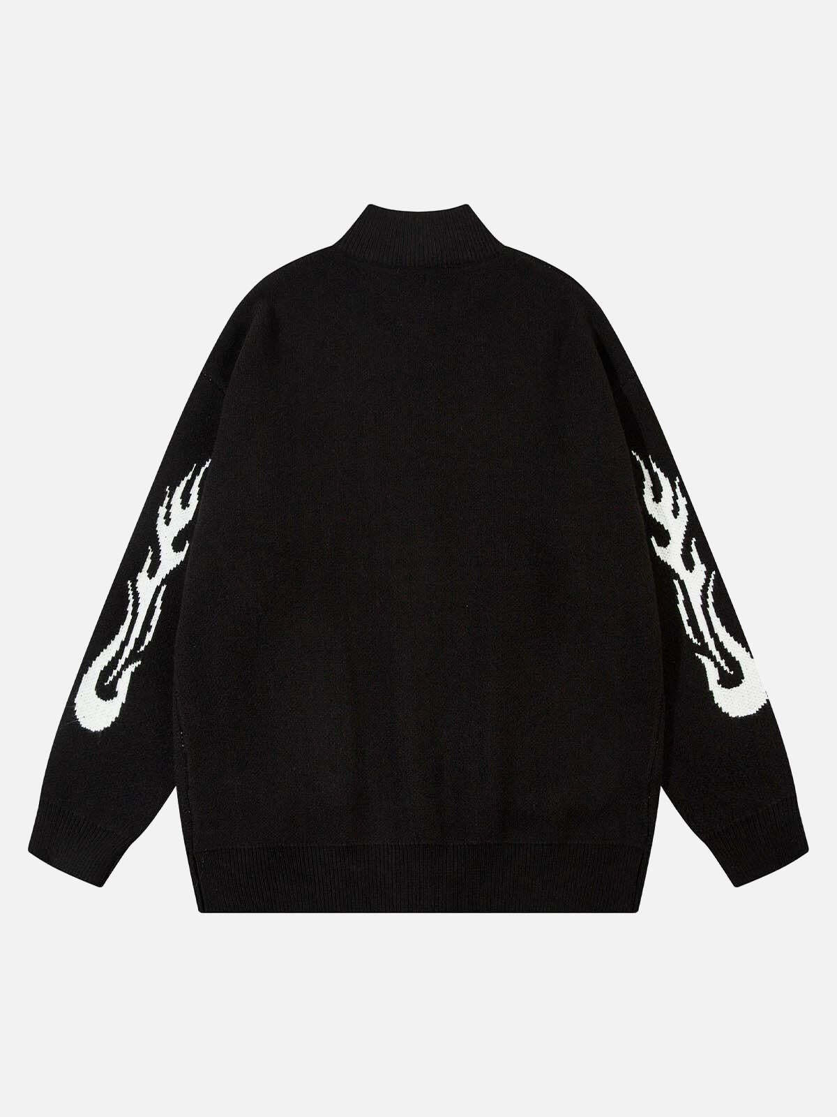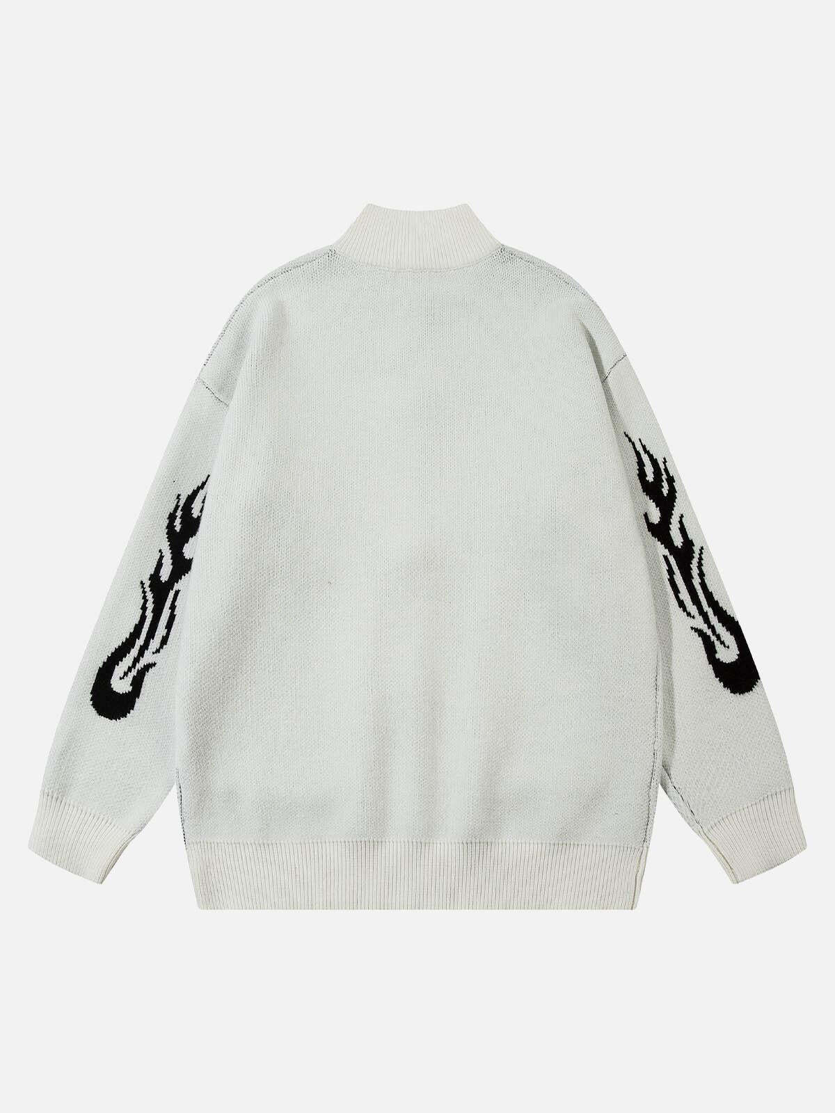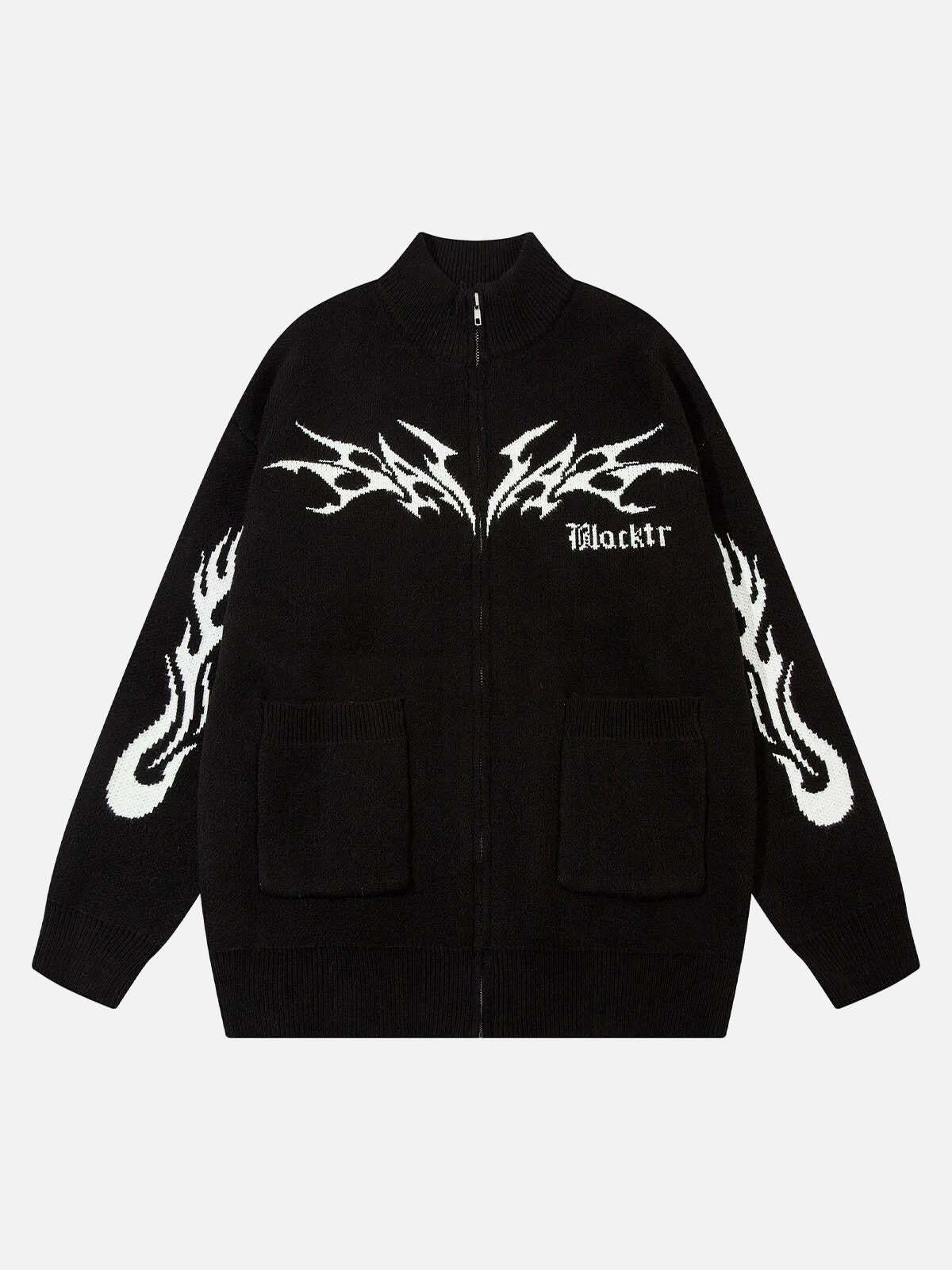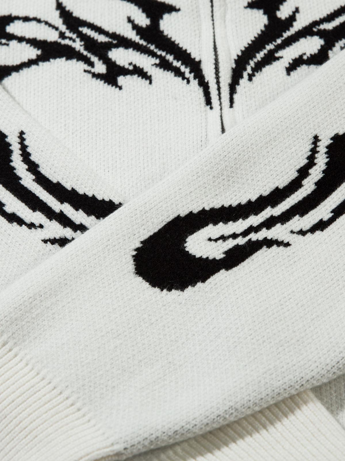 Rebel against the ordinary with this fierce, full-zip cardigan, where bold black tribal graphics ignite the pristine white backdrop, creating a striking contrast that commands urban streets. The chunky knit texture promises warmth and comfort, while the oversized fit, available in M, L, and XL, ensures effortless layering for those chilly nights. Ribbed cuffs and hem add a snug touch, and roomy front pockets keep your essentials close as you navigate the city. Whether you’re piecing together a killer y2k look or seeking fresh outfit ideas, this piece is your go-to for unapologetic style. Slip it on and redefine streetwear fashion.