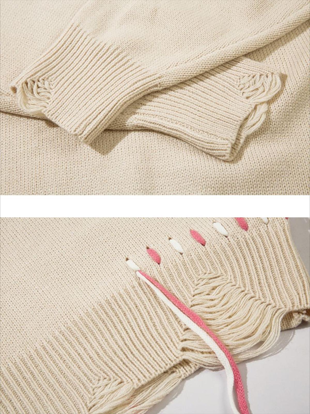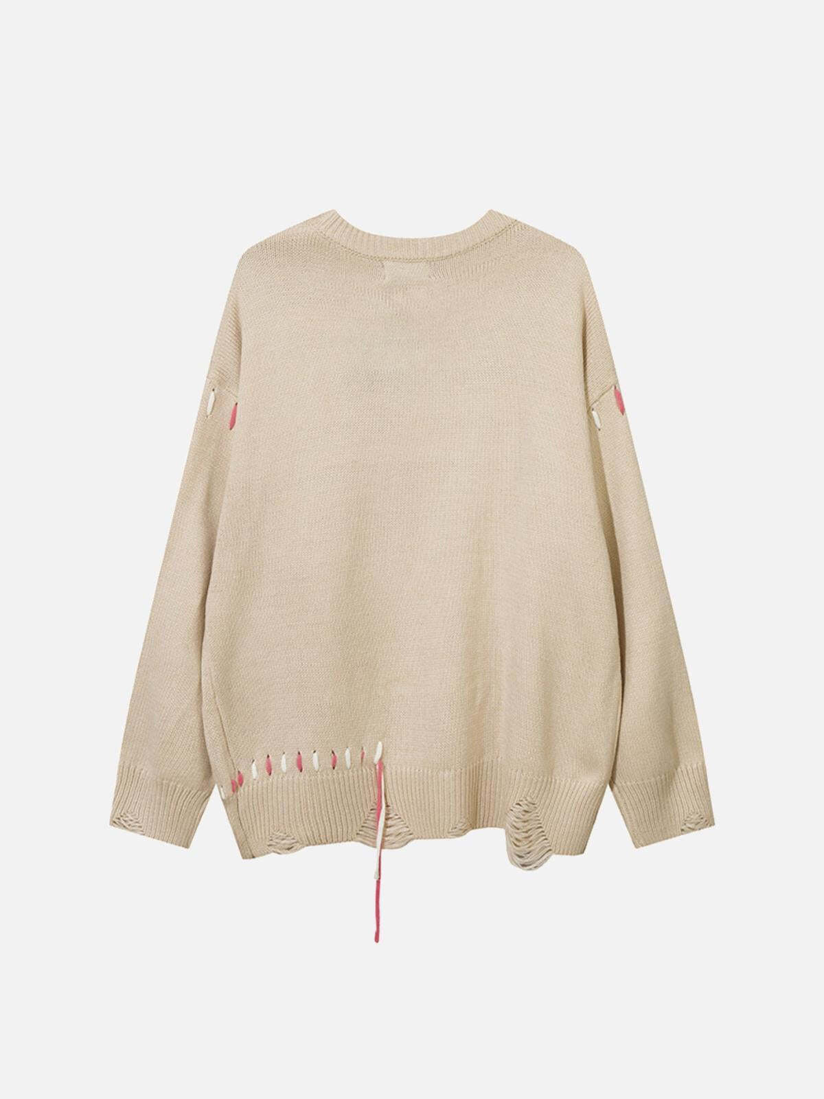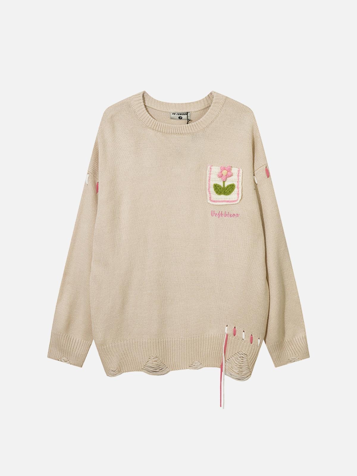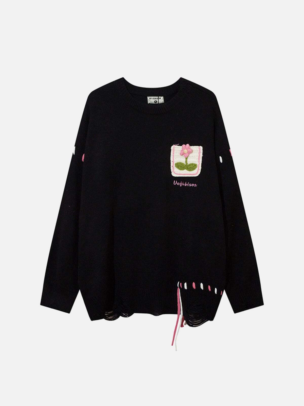 Break away from the ordinary with this edgy knit sweater, where intricate detailing meets urban flair. With its bold black canvas, accented by a playful pink and green floral patch, this piece effortlessly merges streetwear fashion with a touch of whimsy. The distressed hem and artful cutouts weave a narrative of rebellion, while the soft texture promises comfort in sizes ranging from M to XXL. Whether you opt for the sleek black, the understated rose, or the versatile beige, each colorway provides a unique canvas for your style story. Pair it with distressed jeans for that ultimate Y2K vibe or layer it over a crisp white tee for fresh outfit ideas. Embrace the bold and redefine your wardrobe today.