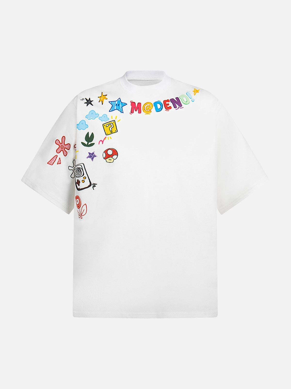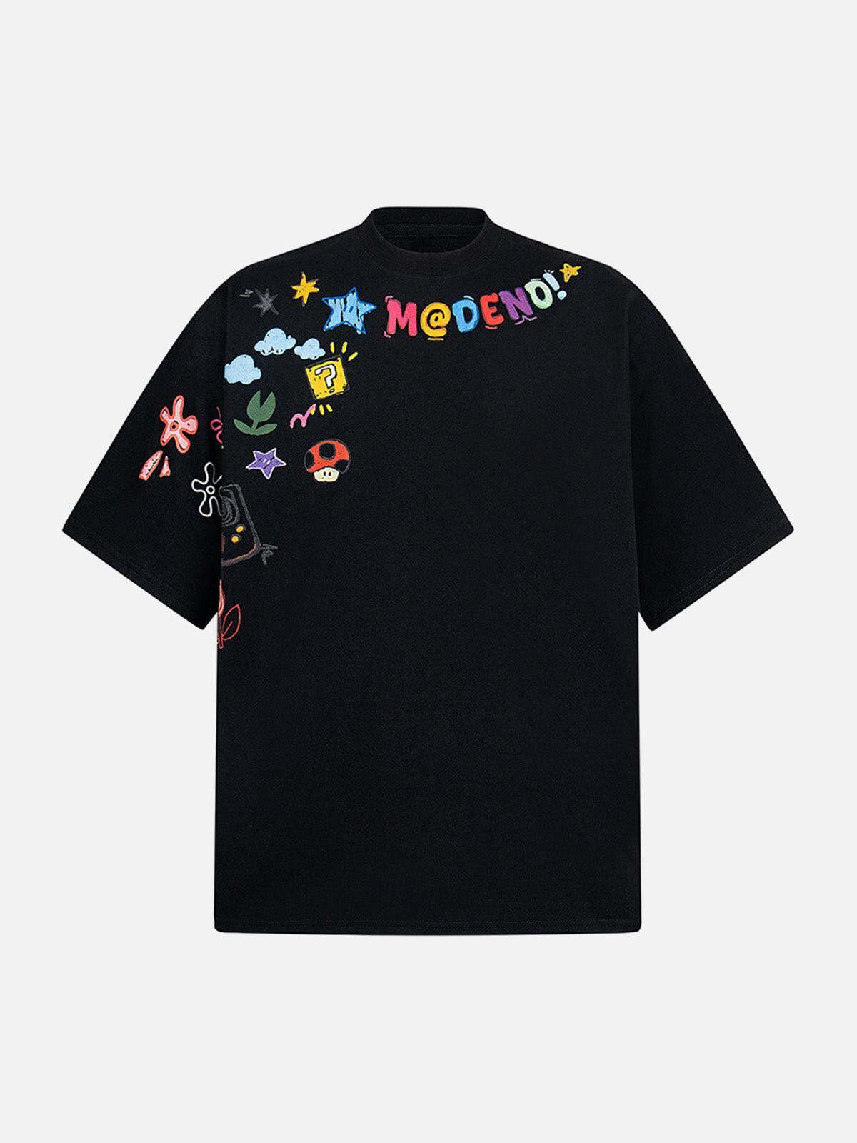 Dare to express your vibrant side with a tee that turns heads on every street corner. This black canvas is punctuated with playful, colorful graphics that bring an edgy twist to your summer fashion inspo. The soft fabric offers a relaxed fit, making it perfect for those who prioritize comfort without sacrificing style. Available in versatile shades of black, gray, and white, and sizes M, L, and XL, it’s designed to complement any summer outfit effortlessly. Pair it with your favorite jeans or shorts for a look that speaks volumes. Grab yours now and redefine your summer style game.