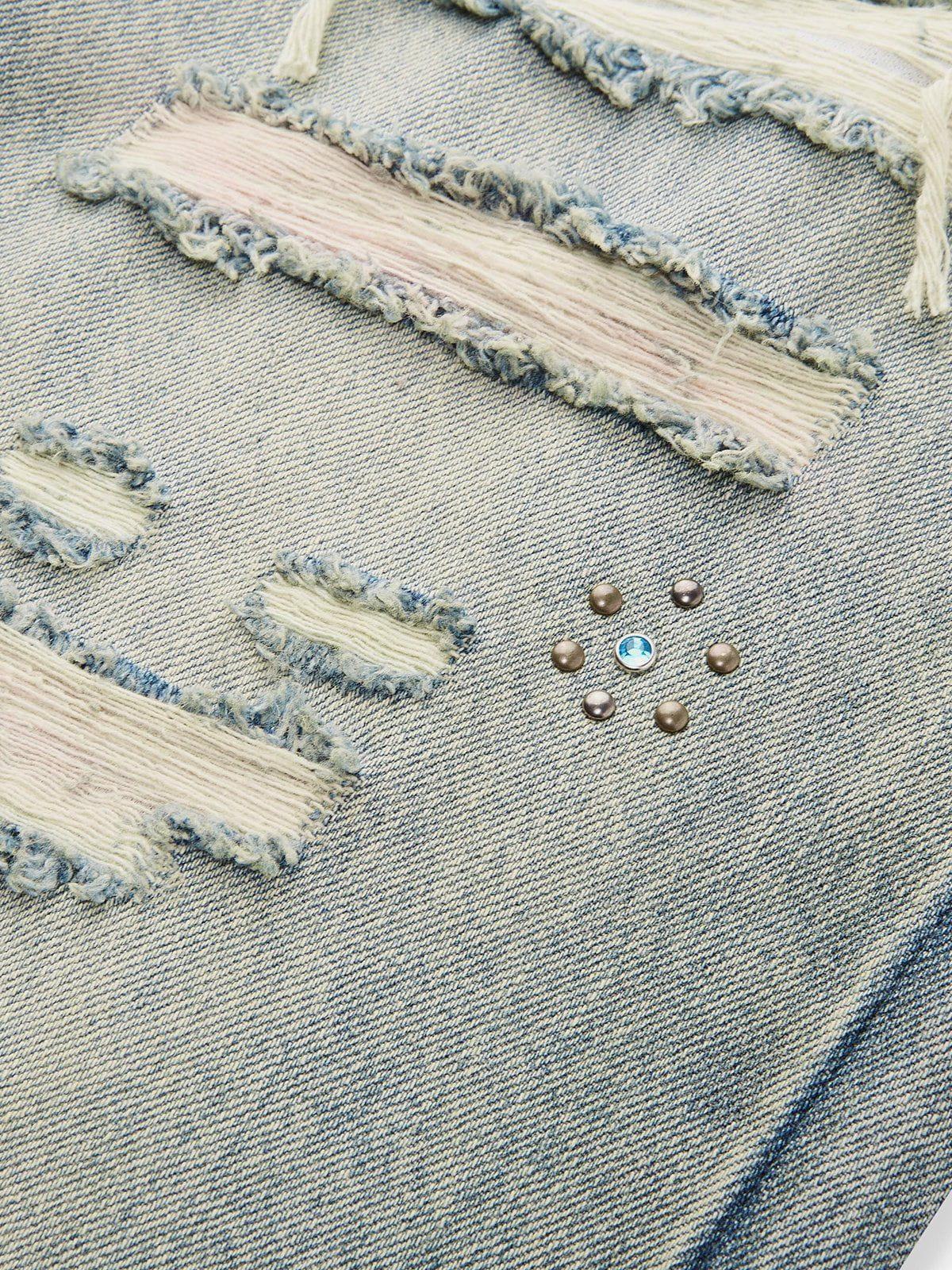 Embrace the raw edge of style with these audacious distressed jeans, where every rip tells a story of urban rebellion. The striking blue denim is artfully faded, revealing layers of muted pastels that add a dynamic twist to the classic streetwear fashion. Designed to be effortlessly bold, the wide-leg fit offers comfort and freedom, making it the perfect canvas for your next y2k-inspired outfit. Available in a versatile one size, these jeans redefine adaptability, fitting seamlessly into any wardrobe rotation. Pair them with your favorite oversized tee or a sleek jacket to craft outfit ideas that turn sidewalks into runways.