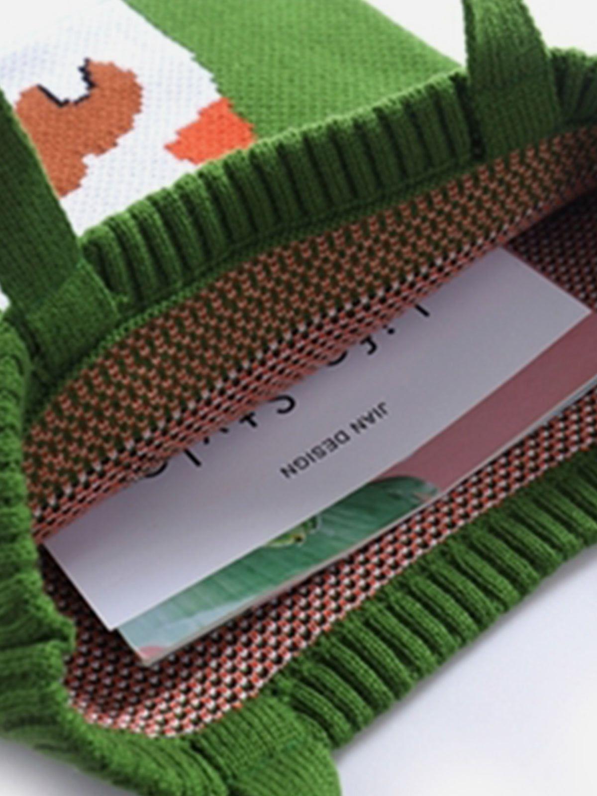 Infuse your ensemble with playful vibes through this bold green tote, featuring a whimsical cat strumming a guitar—a nod to quirky streetwear fashion. The textured knit finish adds depth and character, making it the perfect companion for urban adventures or casual outings. With its versatile one-size fit, this bag effortlessly complements a variety of y2k outfits, offering both style and function. Elevate your accessory game with this unique piece that’s as practical as it is eye-catching.