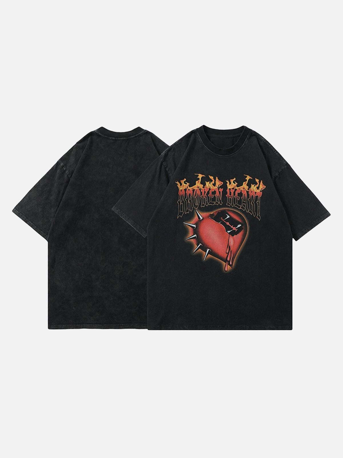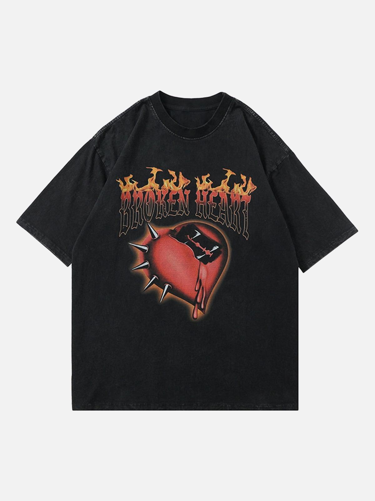 Embrace the rebellious spirit of urban streetwear with this bold graphic tee featuring a striking flaming ‘Broken Heart’ design that sets you apart. The deep black fabric provides a perfect backdrop, allowing the fiery hues and edgy artwork to take center stage, while its relaxed fit ensures comfort in every size from M to 2XL. Ideal for a summer outfit, this tee pairs effortlessly with distressed denim or cargo pants, making it a versatile addition to your wardrobe. Whether you’re hitting the streets or chilling with friends, this tee challenges the norm—grab yours and define your summer style.