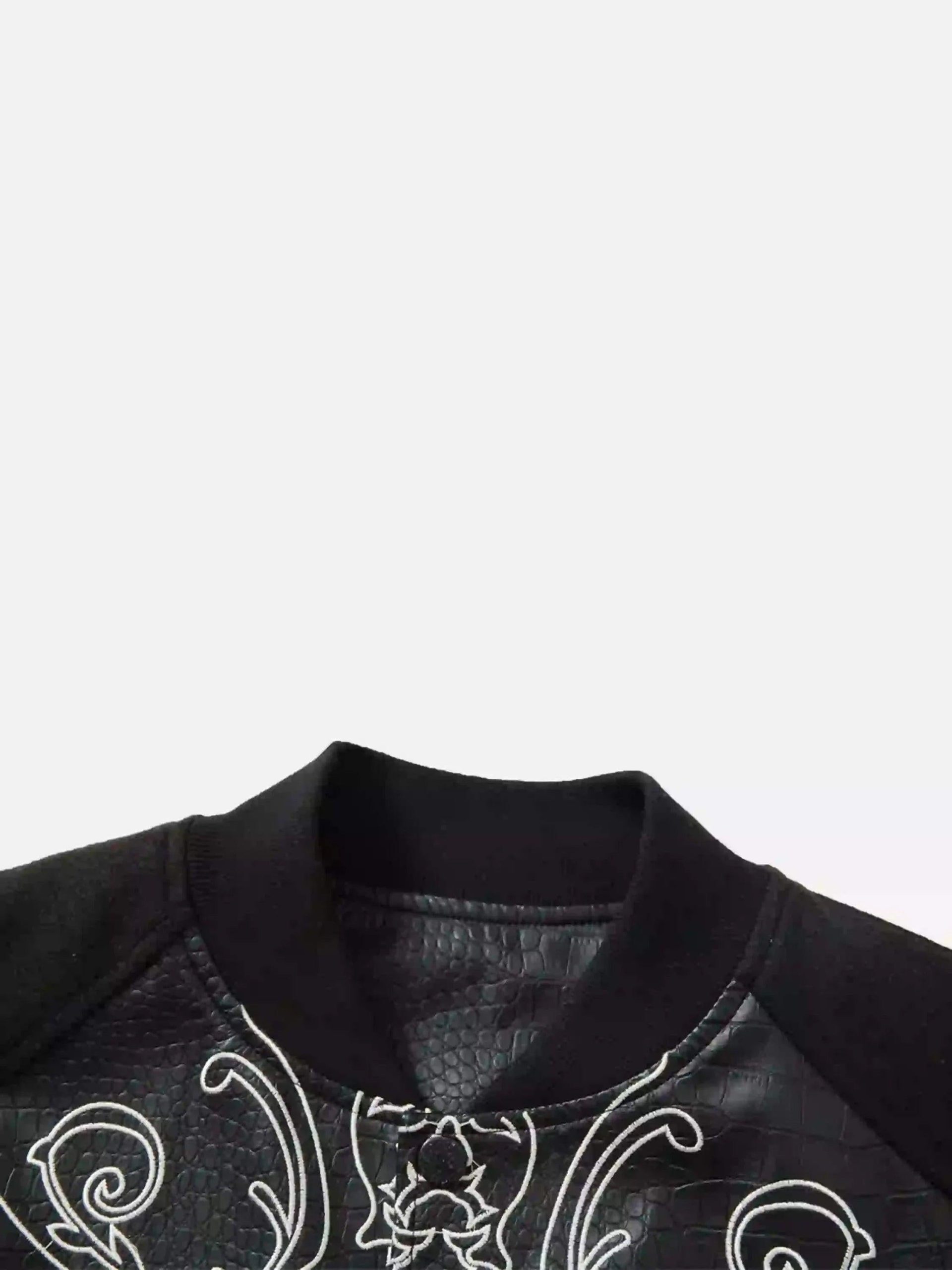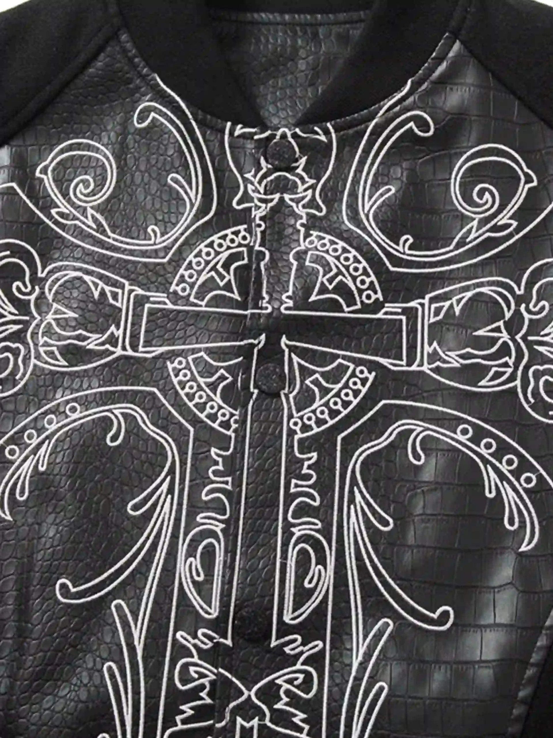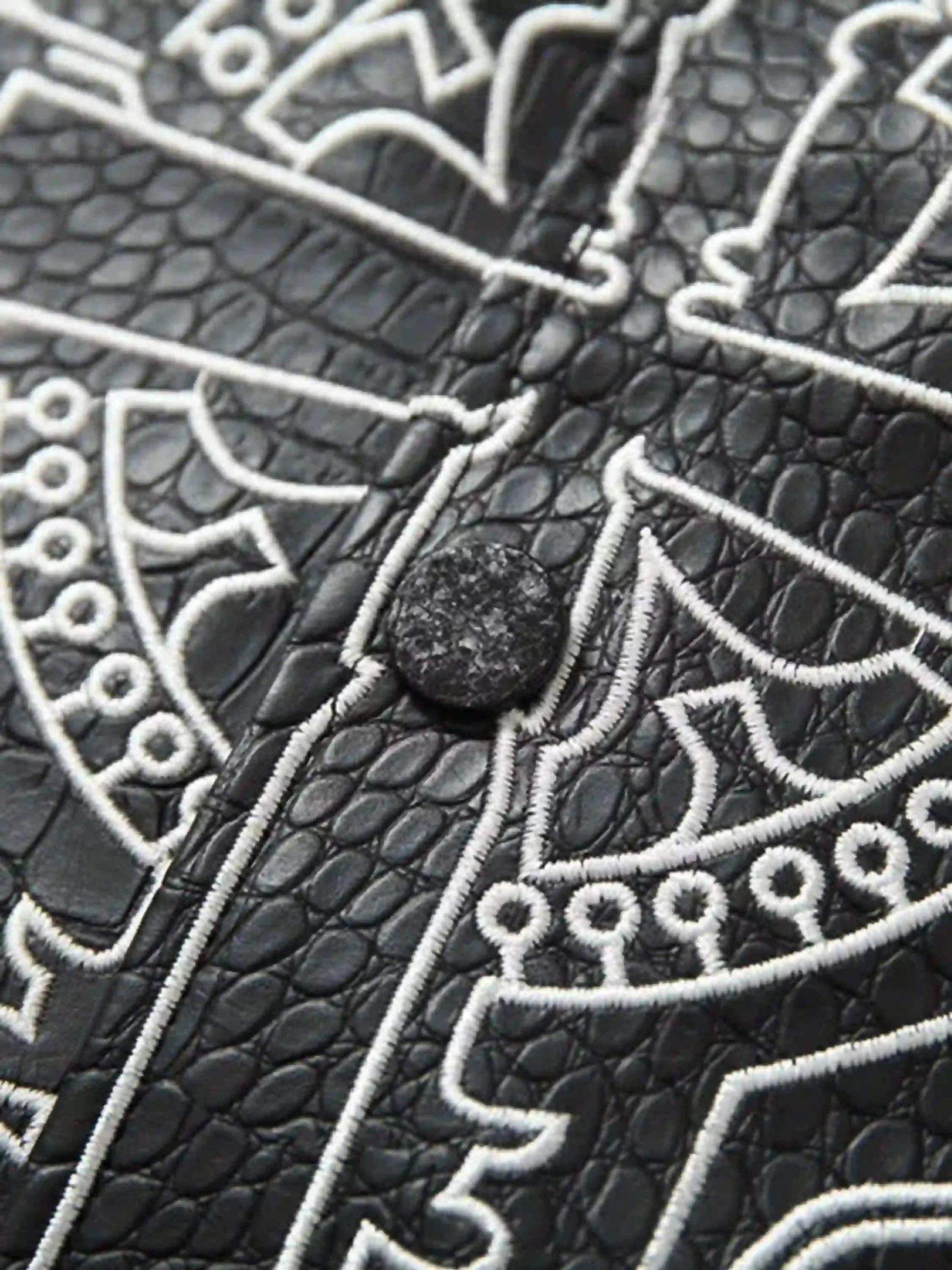 Embrace the raw edge of urban style with this striking jacket, where bold black contrasts meet intricately detailed white embroidery that demands attention. The sleek faux leather texture adds a touch of sophistication, effortlessly blending with the classic monochrome palette. Its relaxed fit ensures comfort across sizes from M to XXL, making it a versatile choice for any streetwear fashion enthusiast. Pair it with your favorite kicks and jeans for a look that resonates with the vibe of the city. Own the streets with confidence.