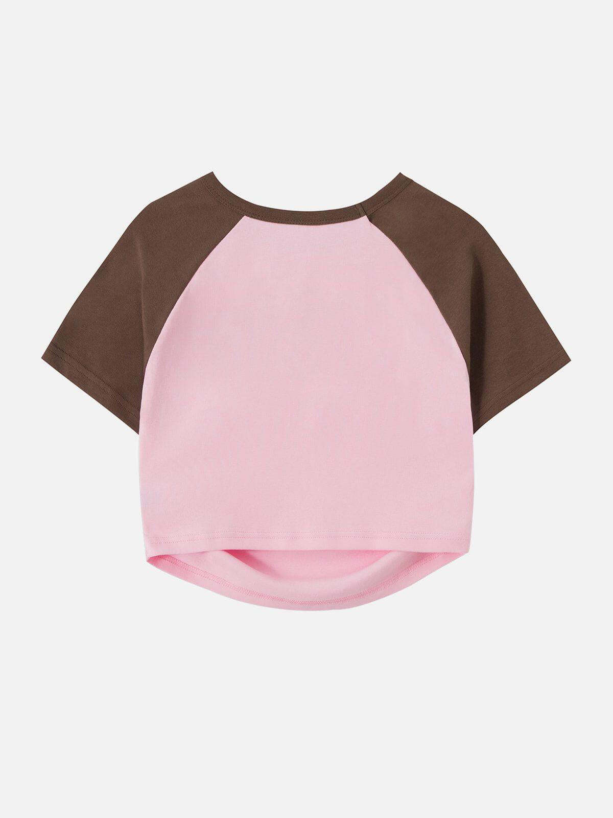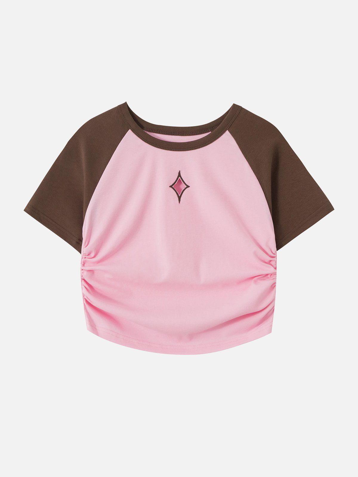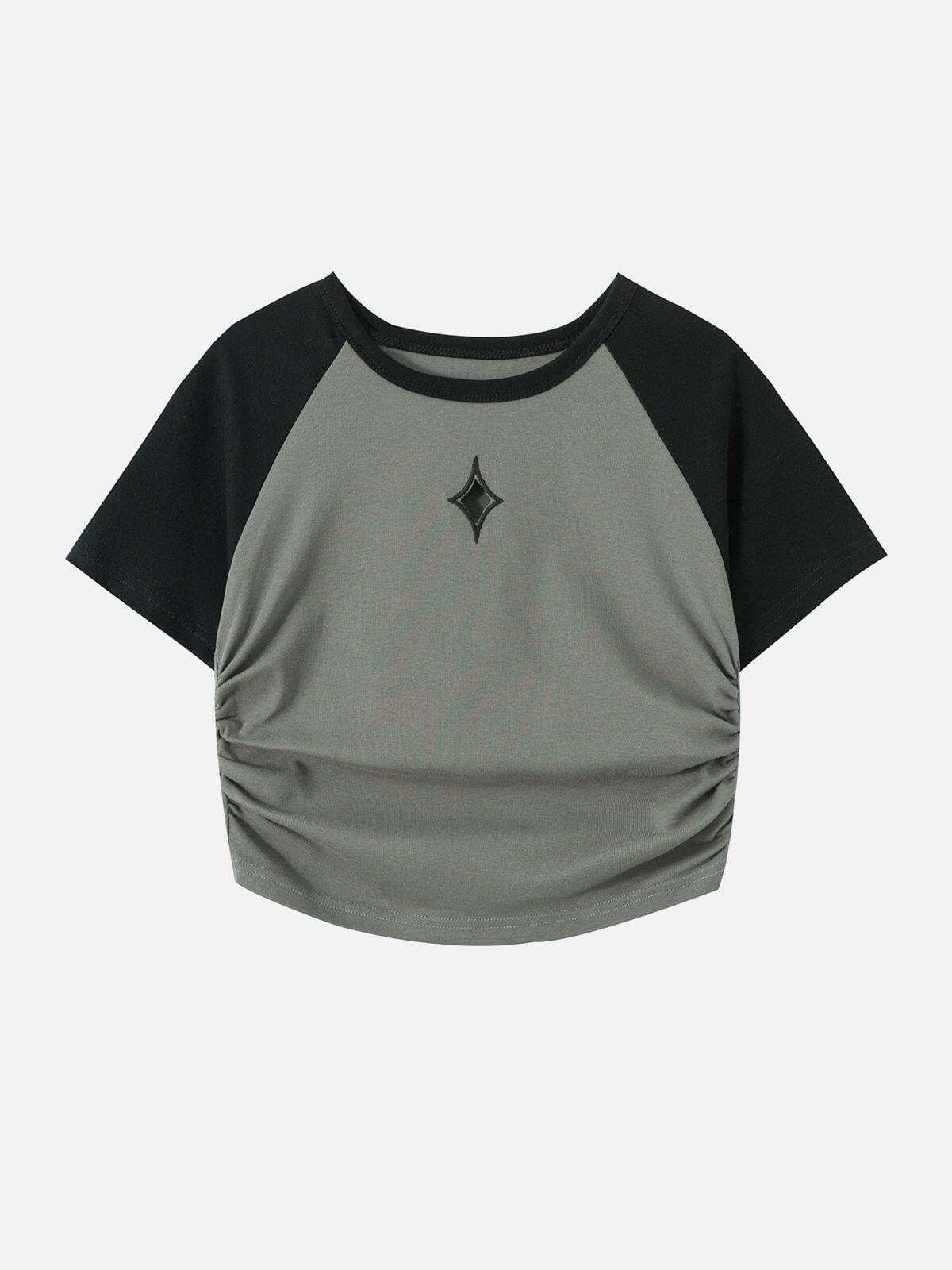 Dare to redefine your summer style with this cropped tee that merges bold contrasts and urban edge effortlessly. The dynamic interplay of rich gray and sleek black creates an eye-catching look, accentuated by the unique diamond emblem at the center. Designed with a flattering fit, the side ruching adds a touch of texture and sophistication, making it perfect for pairing with your favorite high-waisted jeans or shorts. Available in sizes S and M, this tee is your go-to piece for summer fashion inspo, whether you’re hitting the streets or the beach. Elevate your wardrobe with this piece that promises to turn heads.