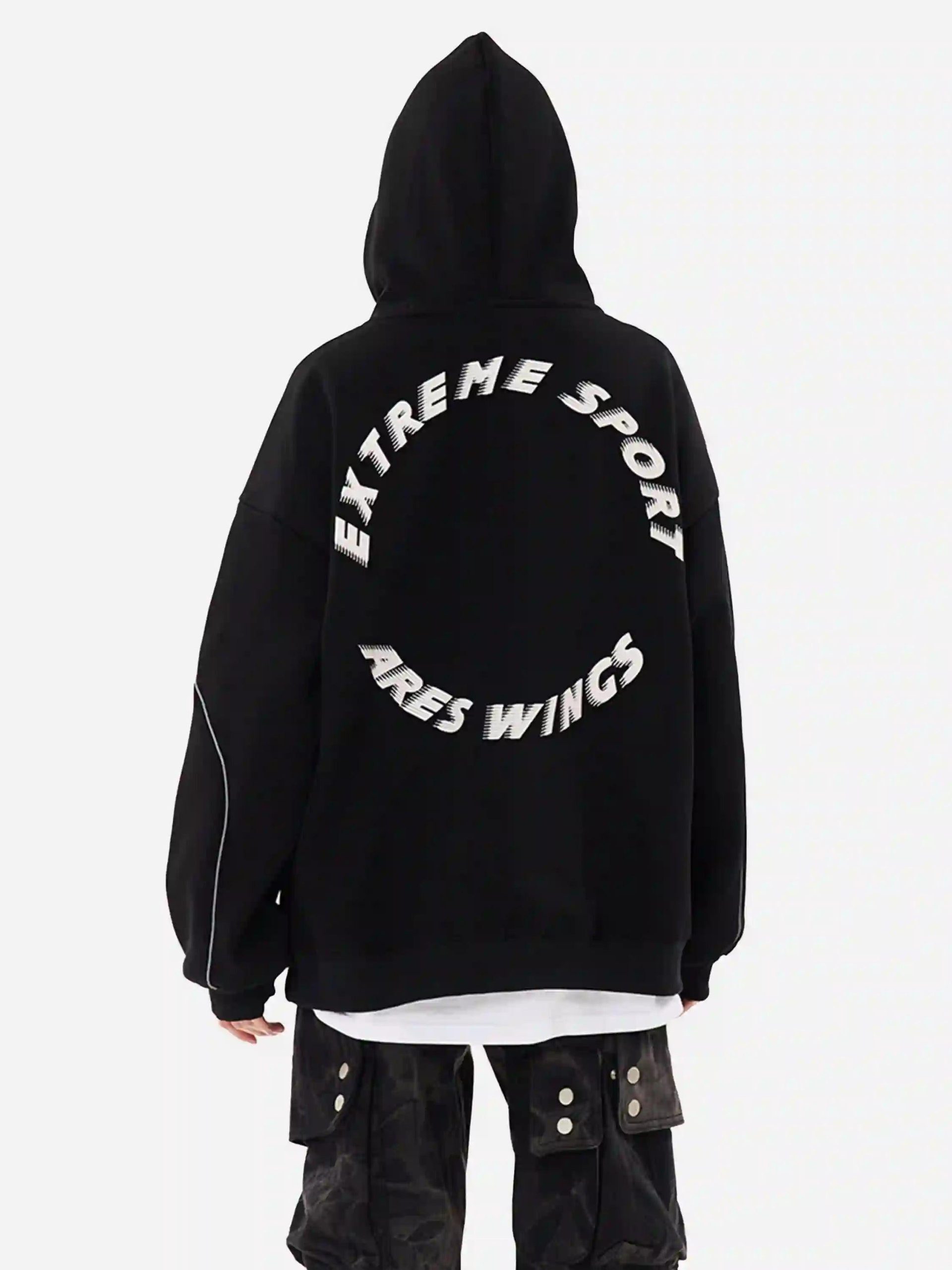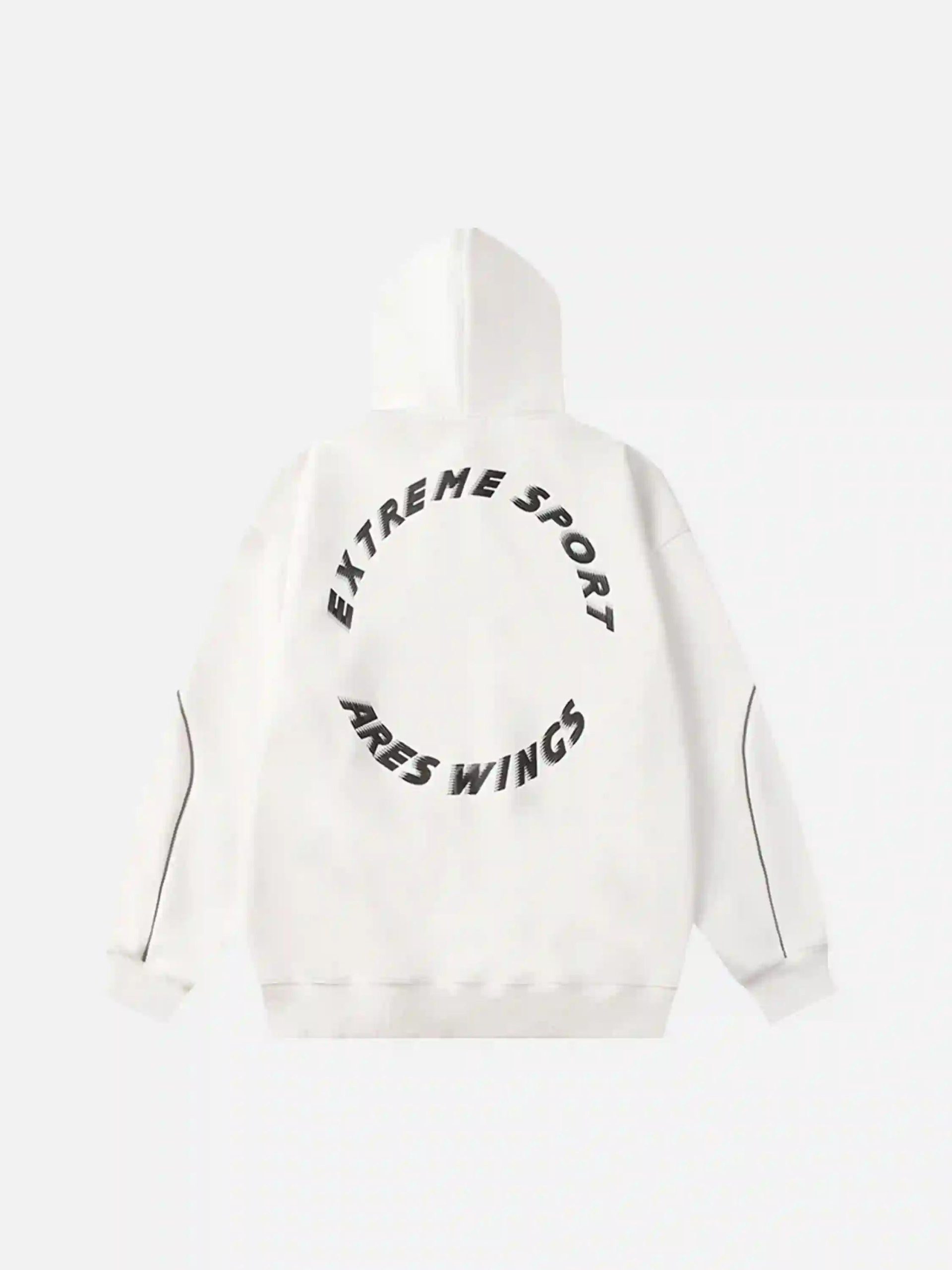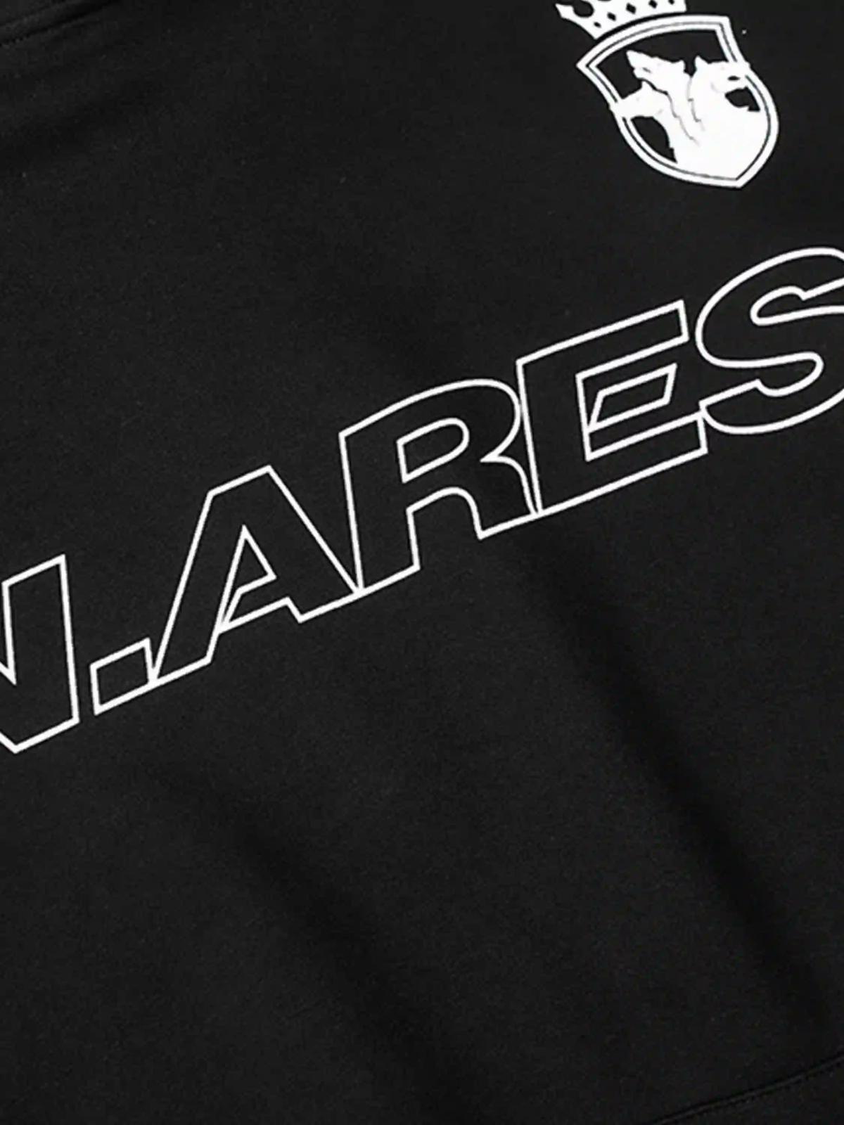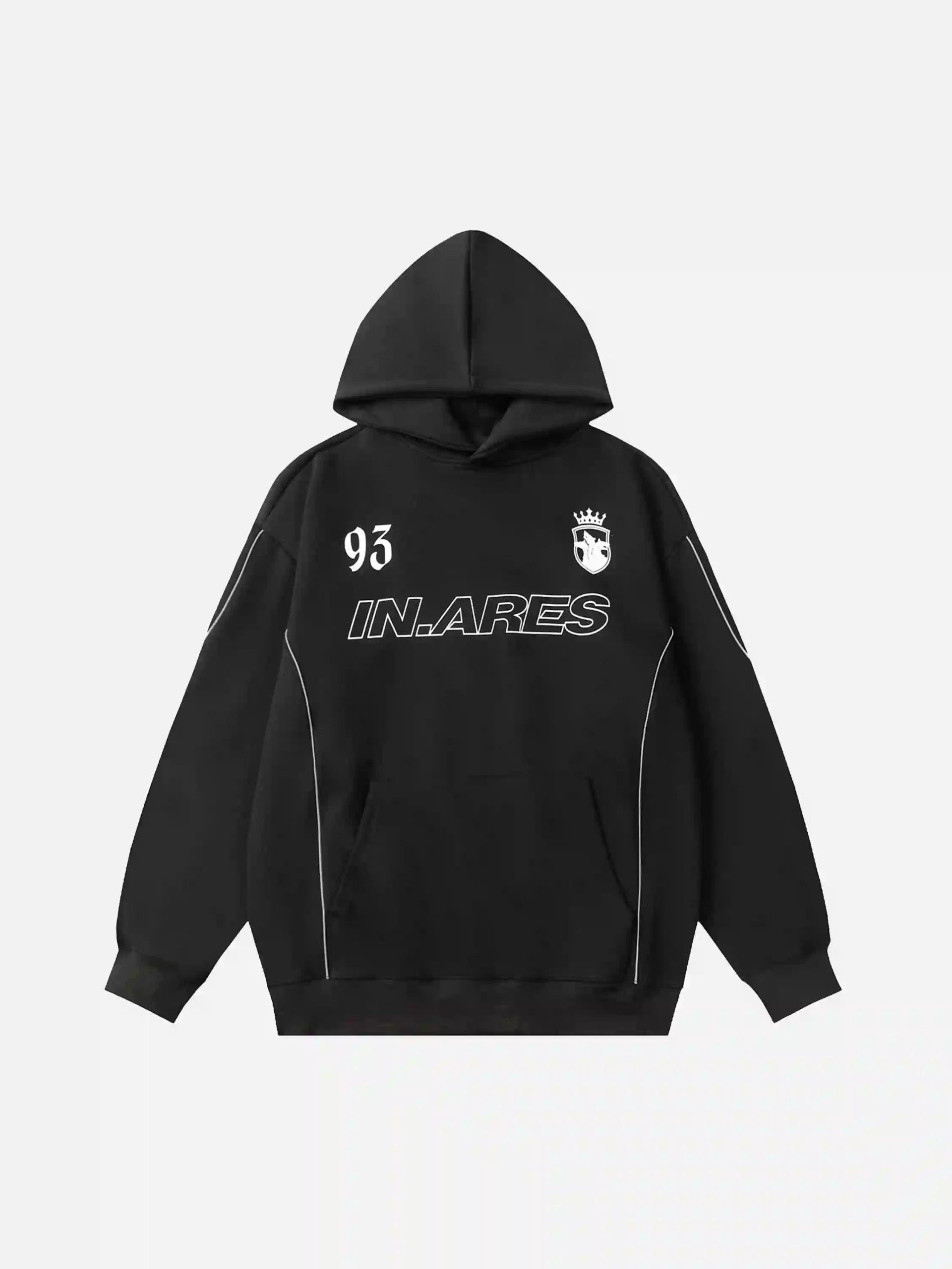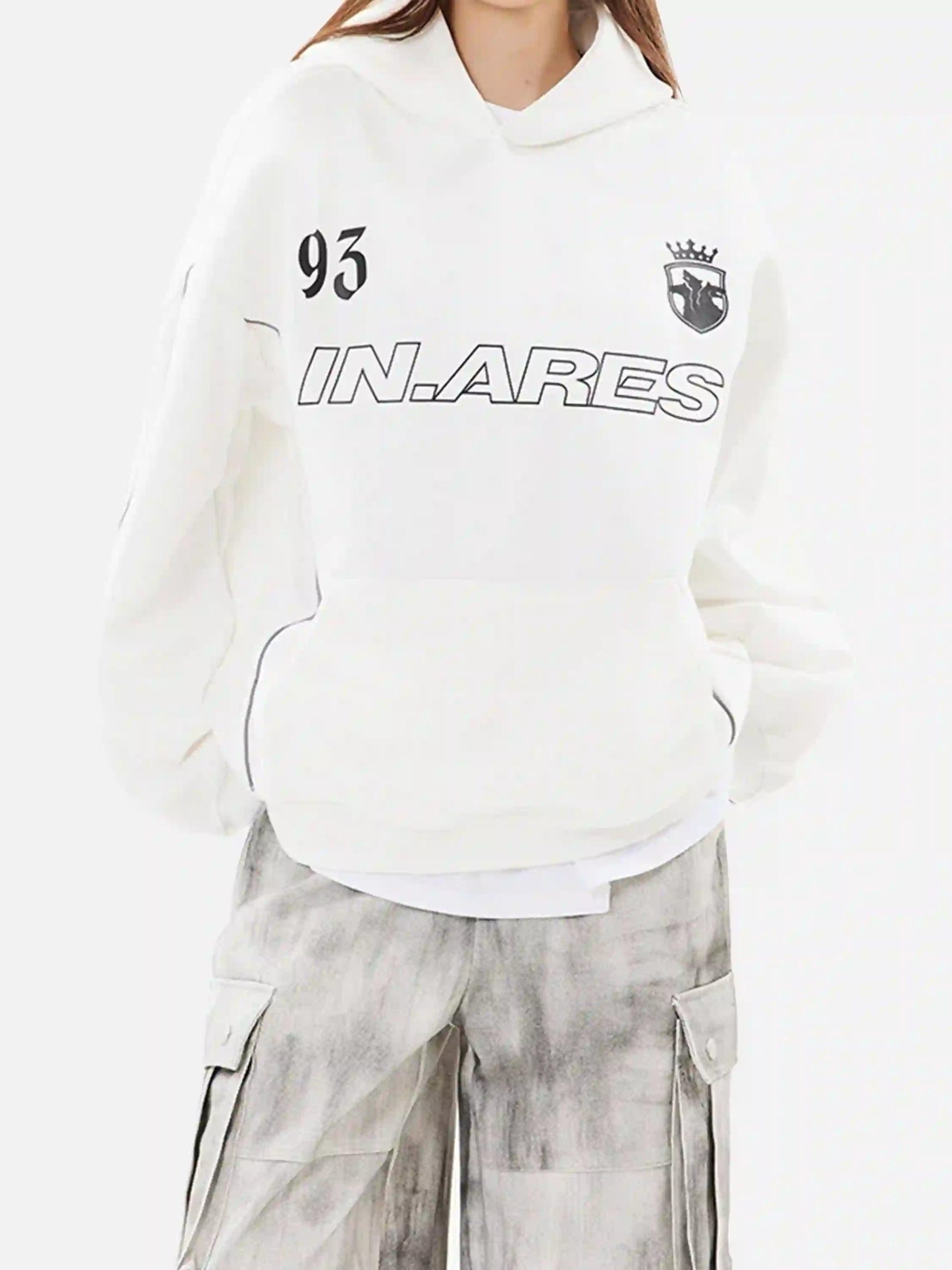 Striking a perfect balance between bold and minimal, this hoodie is your canvas for streetwear fashion. The sleek black backdrop is interrupted by sharp white piping, creating a visual rhythm that commands attention. The edgy text and emblem on the chest add a touch of urban royalty, making it an essential piece for those who dare to stand out. Whether you’re opting for a clean monochrome look in black or adding contrast with white, this hoodie offers versatile styling options in sizes M, L, and XL. Layer it over your favorite tee for a y2k-inspired vibe or pair it with distressed jeans for a laid-back aesthetic. Slide into this hoodie and redefine your streetwear game effortlessly.