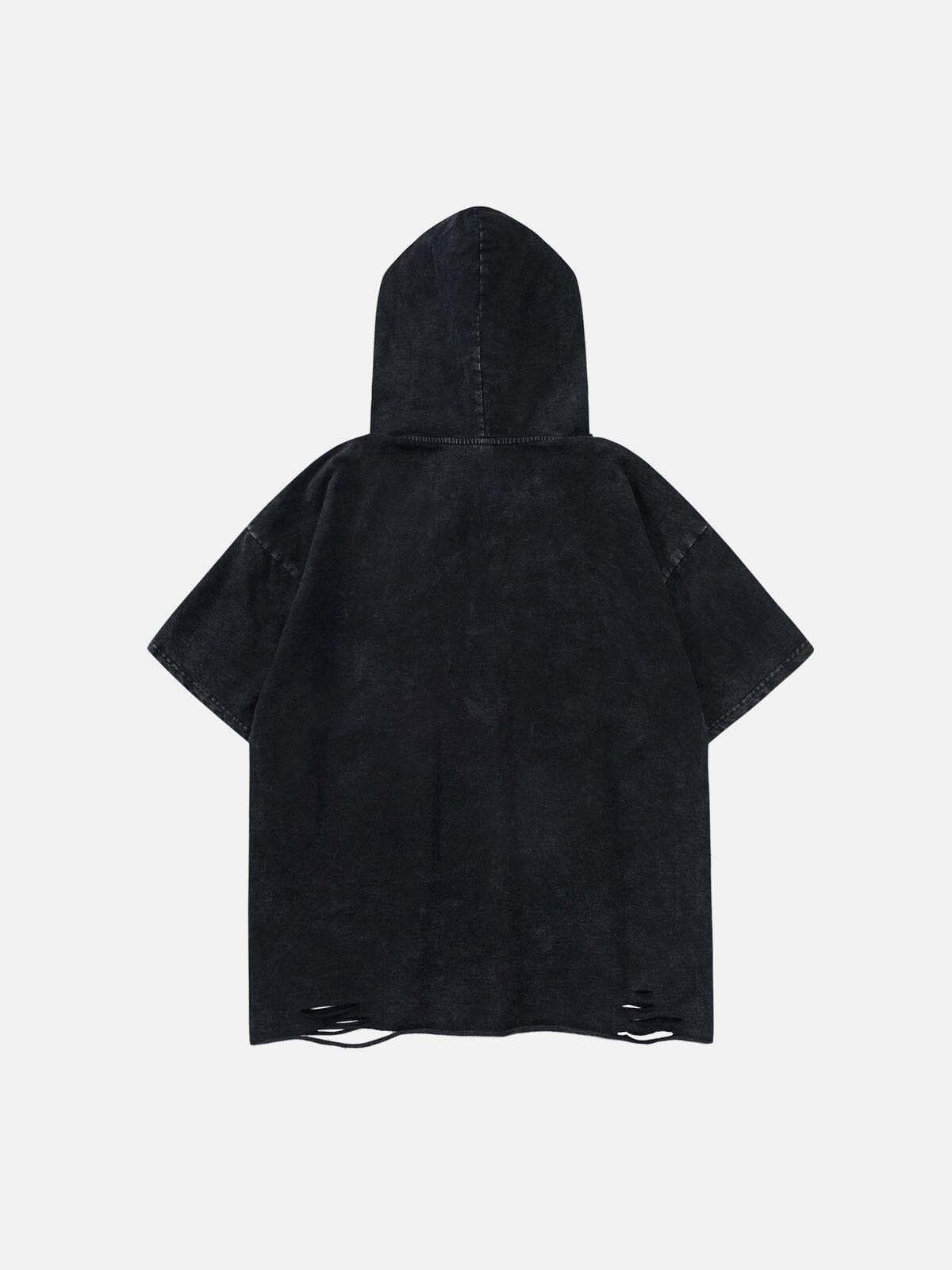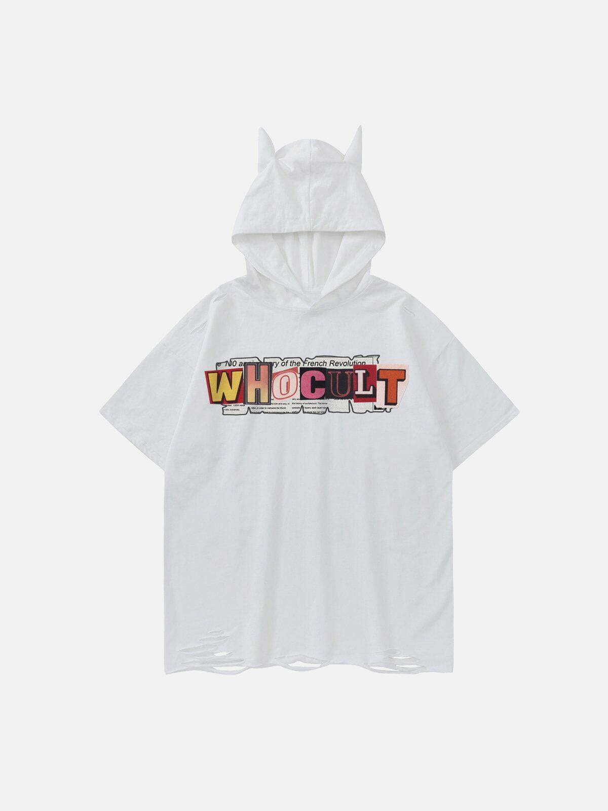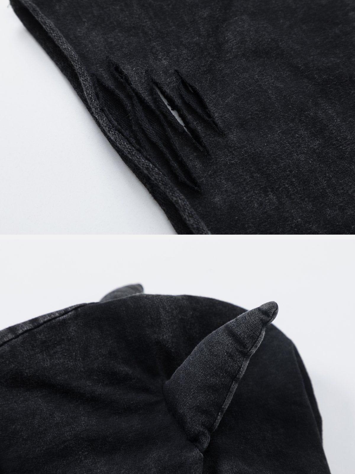 Embrace the rebellious spirit with this hoodie that merges edgy design and urban flair. The distressed black fabric, accented by playful devilish ears on the hood, makes a bold statement for any summer outfit. The oversized fit provides maximum comfort and style, perfect for layering over your favorite streetwear essentials. Available in sizes S, M, and L, this piece is a versatile addition to your wardrobe, whether you choose the classic black or crisp white. Pair it with ripped jeans and sneakers for a look that screams confidence. Dare to stand out and redefine summer fashion with this one-of-a-kind piece.