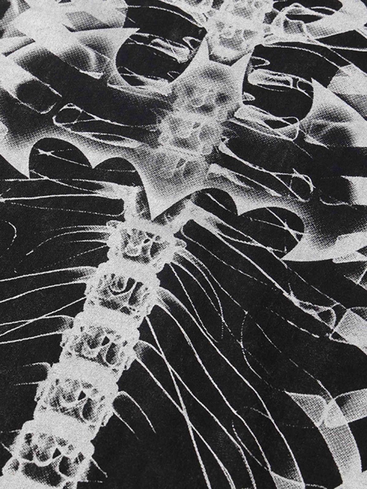 Dare to defy the ordinary with this bold, X-ray graphic tee, its striking skeletal design emblazoned on deep black fabric. The oversized fit exudes comfort and confidence, making it an essential piece for any urban wardrobe. Perfect for those who embrace edgy summer style, this shirt is available in versatile sizes M, L, and XL, ensuring a perfect fit for every fearless fashionista. Pair it with your favorite jeans or layer it under a jacket for a look that speaks volumes. Grab yours and redefine your summer fashion game.