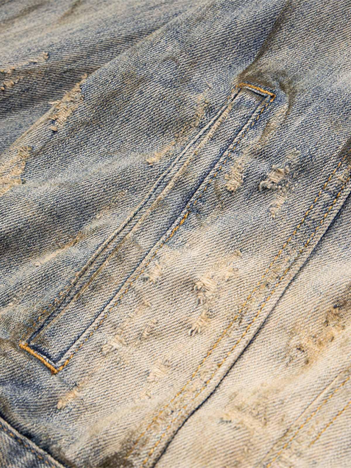This distressed denim jacket is your passport to the bold world of streetwear fashion, where the light blue wash and rugged texture create an unapologetic vibe. The artfully faded fabric and classic button-up front make this piece a versatile addition to any wardrobe, seamlessly fitting into the spectrum of y2k outfits. Available in sizes M, L, and XL, its relaxed fit ensures comfort without compromising style. Pair it with your favorite tee or layer over a hoodie for endless outfit ideas that keep you at the forefront of urban trends. Get ready to redefine your look with this essential piece.