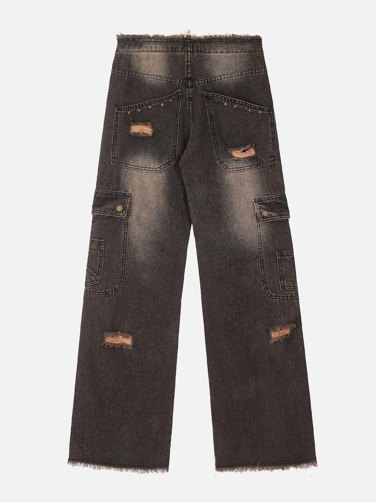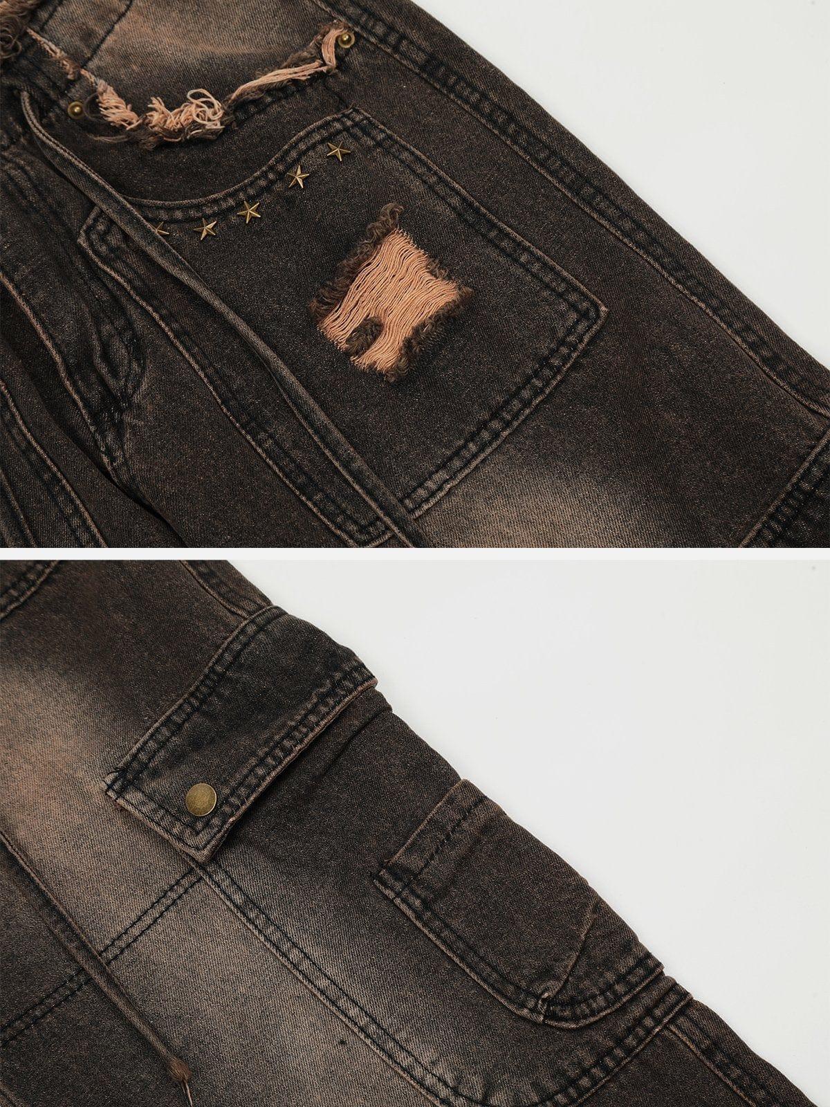 Ride the wave of streetwear fashion with these rugged, distressed jeans that boldly redefine urban style. The deep, earthy tones and raw, frayed edges create an effortless vibe, while the patchwork details and star-studded embellishments add a touch of rebellion. Designed to fit comfortably in sizes 25, 27, 29, and 30, these jeans deliver both form and function, offering multiple pockets for practicality. Pair them with your favorite sneakers or a vintage tee for the ultimate Y2K outfit inspo. Ready to own the streets? Dive into this trend and make it yours.