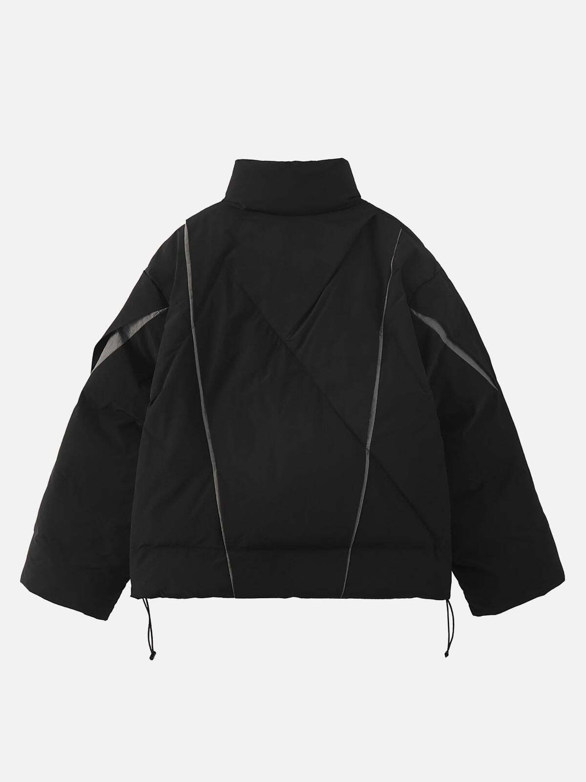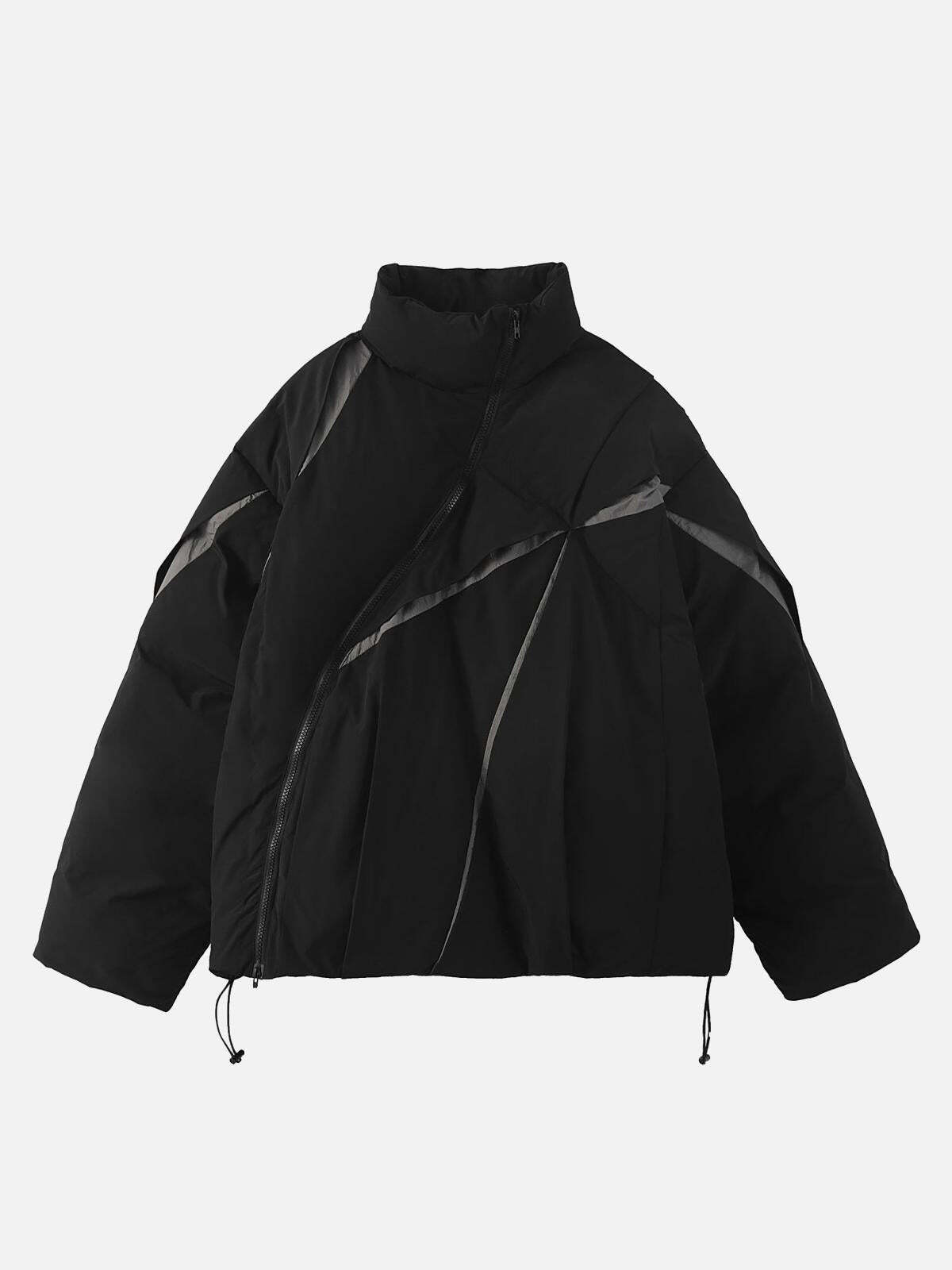 Embrace the urban edge with this bold black jacket, featuring sleek geometric patterns that carve out a unique silhouette. The high collar and asymmetrical zip add a modern twist, making this piece perfect for those who live for streetwear fashion. With a cozy fit that comes in sizes M through 2XL, it’s designed to keep you warm and stylish on city streets. Pair it with your favorite y2k outfits for a throwback vibe or layer over chunky sweaters for those chillier days. Elevate your wardrobe with a piece that speaks volumes.