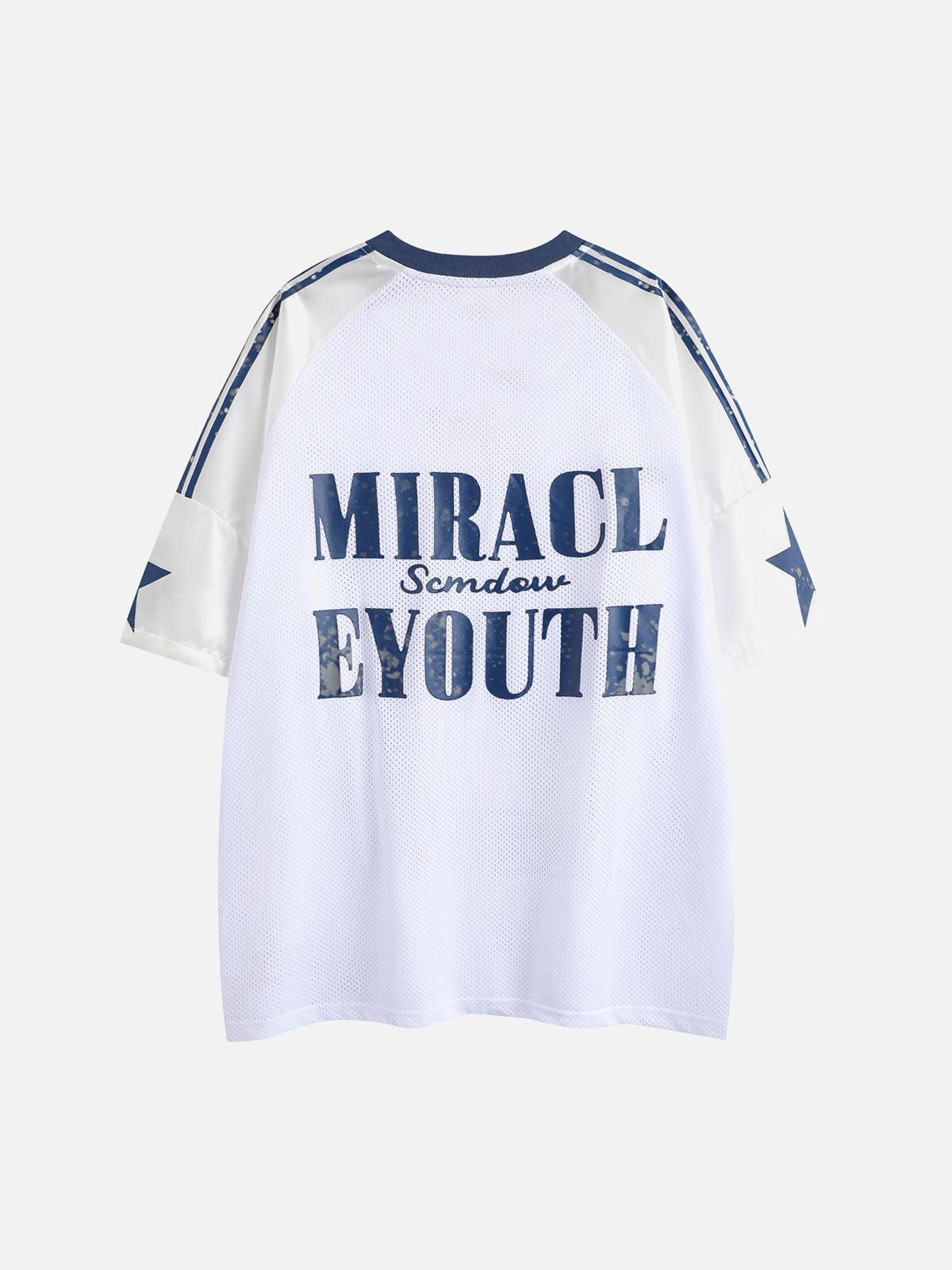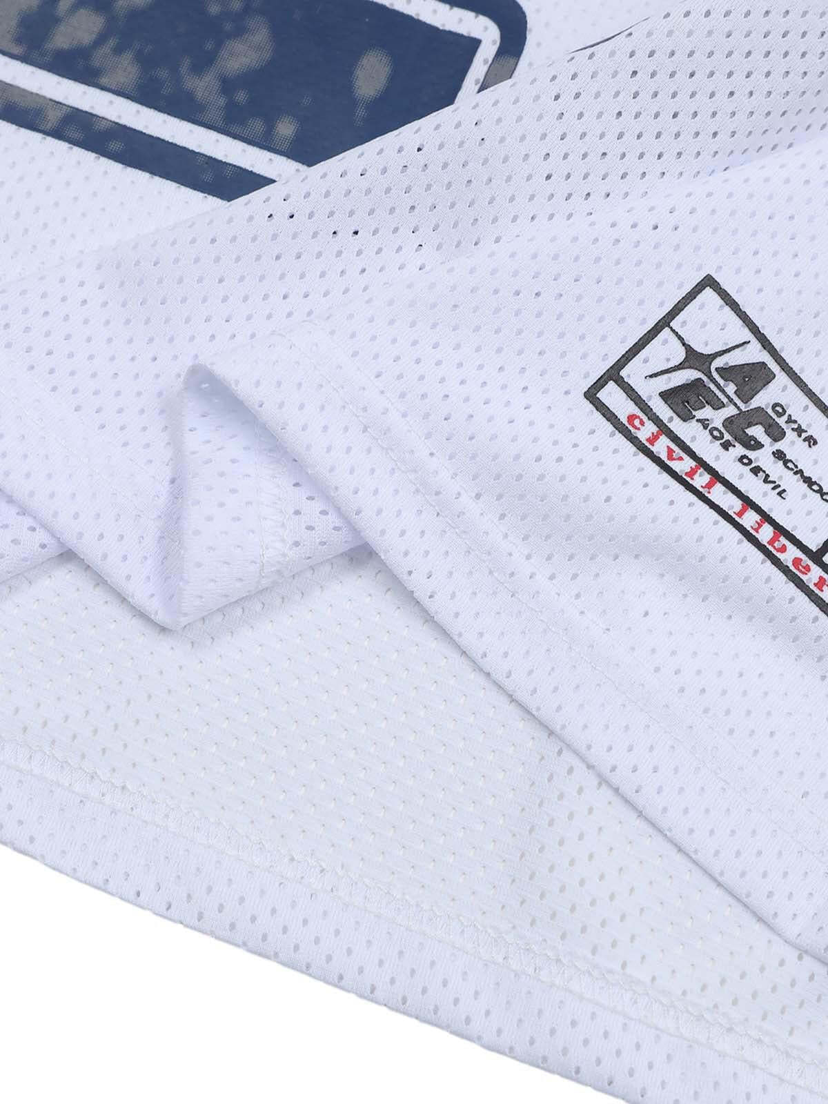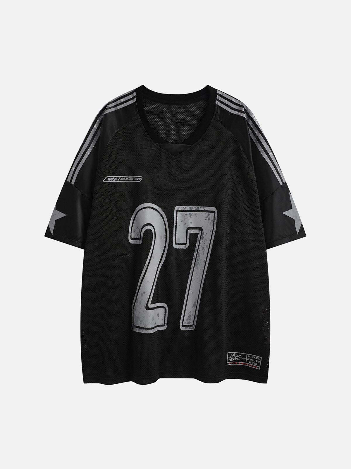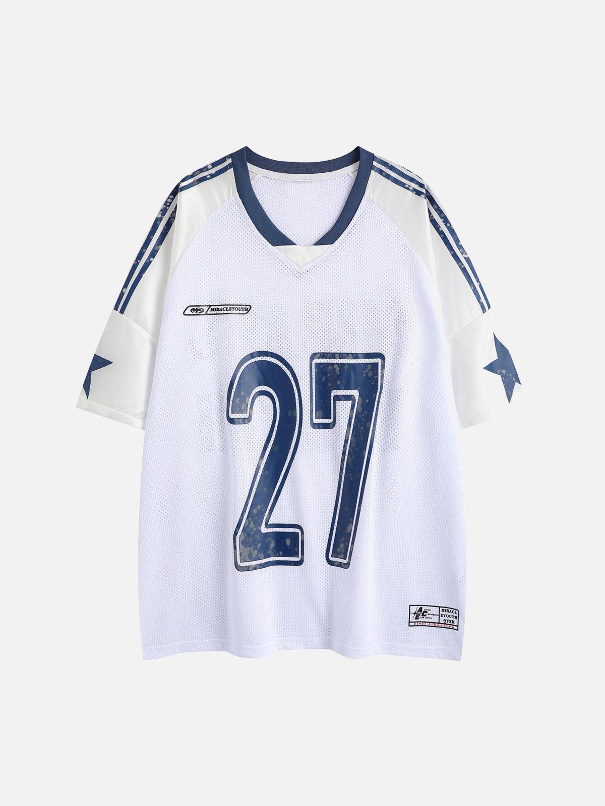 Inject some unapologetic edge into your summer wardrobe with this bold jersey, featuring a striking ’27’ emblazoned across the front in a distressed navy finish. With its breathable mesh texture and sleek star accents on the sleeves, this piece is perfect for keeping cool while rocking a standout look. Available in a crisp white that pairs effortlessly with your favorite streetwear staples, and sizes ranging from S to XL, it’s designed for those who live life on their own terms. Elevate your summer fashion with this jersey and redefine what it means to stand out.