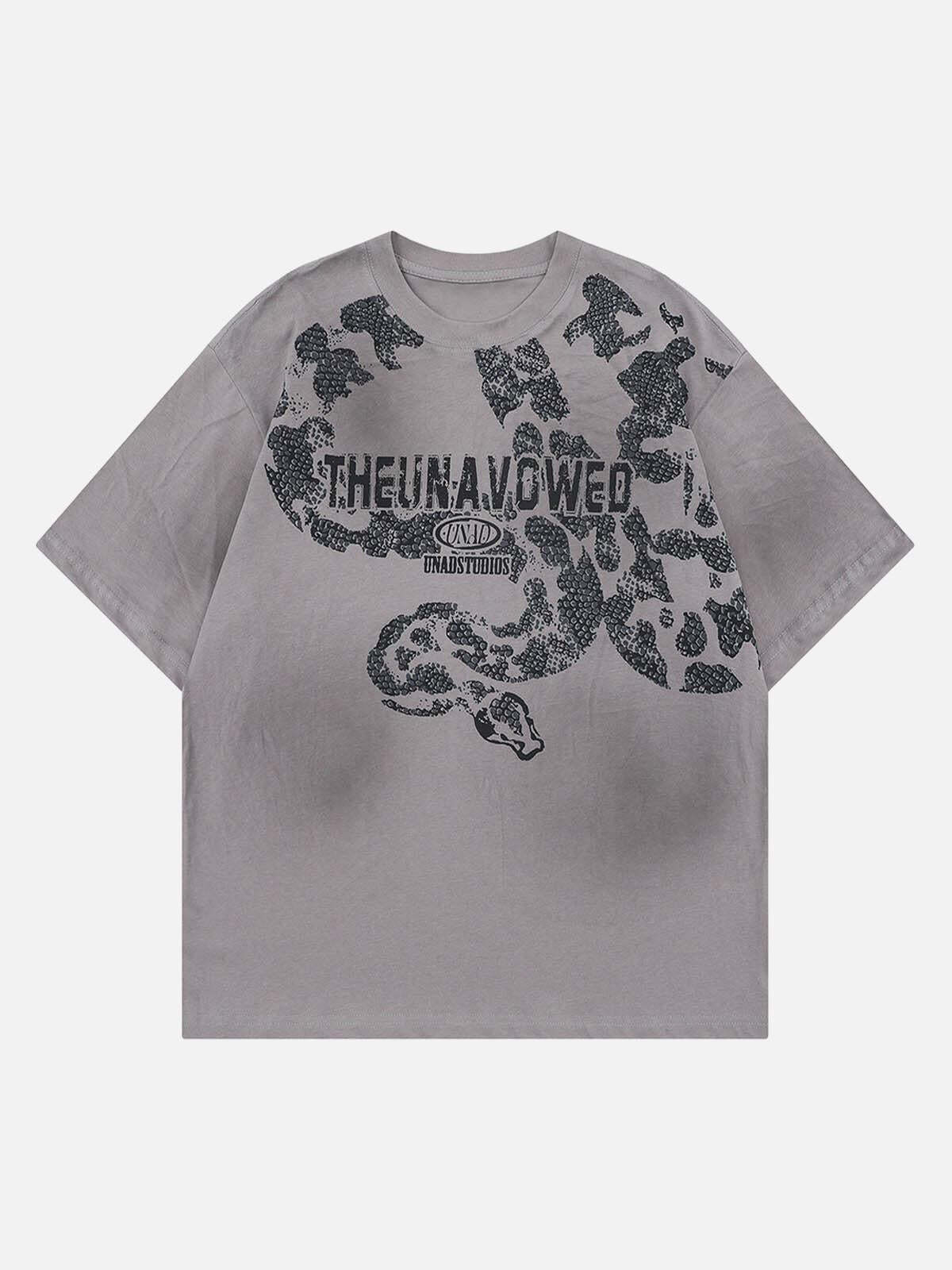 Turn heads with a daring blend of attitude and urban edge in this oversized tee, featuring a striking snake graphic and bold typography across the chest. Perfectly embodying the essence of summer fashion inspo, its soft gray tone provides a versatile base, while the audacious design adds a rebellious flair to any ensemble. Available in both gray and red, and sizes ranging from S to XL, it ensures a relaxed fit for all who wear it. Pair it with sleek joggers or distressed denim for an effortlessly cool summer outfit. Dare to redefine your style with this exceptional piece.