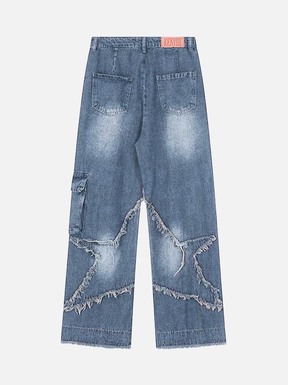 Boldly redefine streetwear fashion with these edgy jeans that fuse classic denim with a rebellious twist. The striking blue hue complements the raw, distressed star patterns, creating a visual edge that’s perfect for those who dare to stand out. With a relaxed fit and an added cargo pocket for utility, these jeans bring both style and function. Available in sizes from S to 2XL, they’re ready to pair with your favorite oversized tee for an effortless y2k outfit vibe. Slip into these jeans and let your outfit speak volumes.