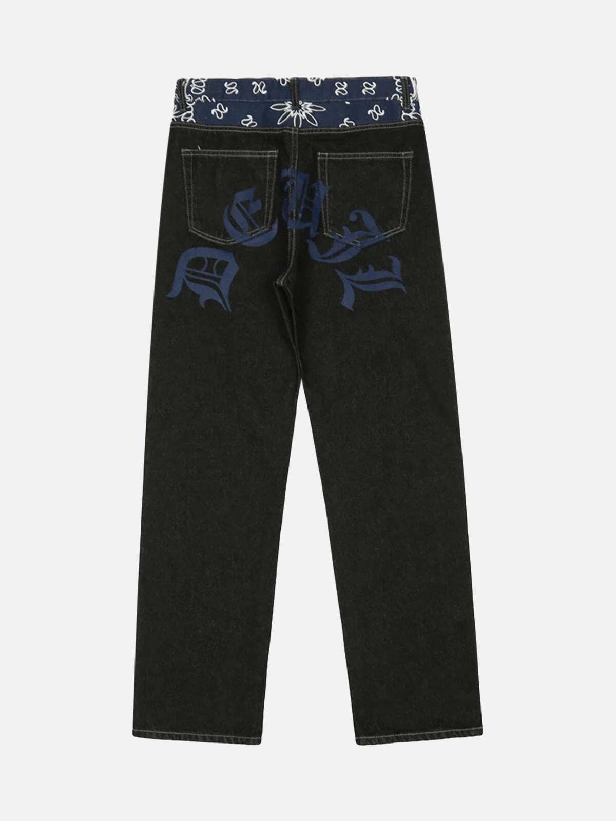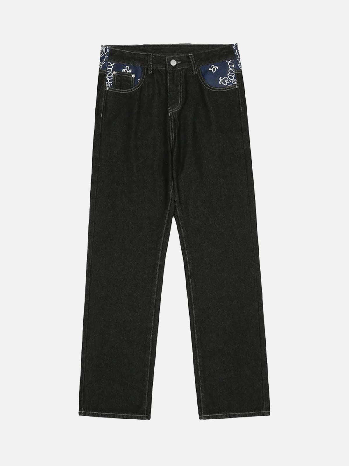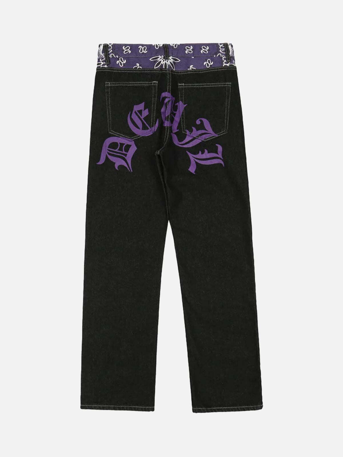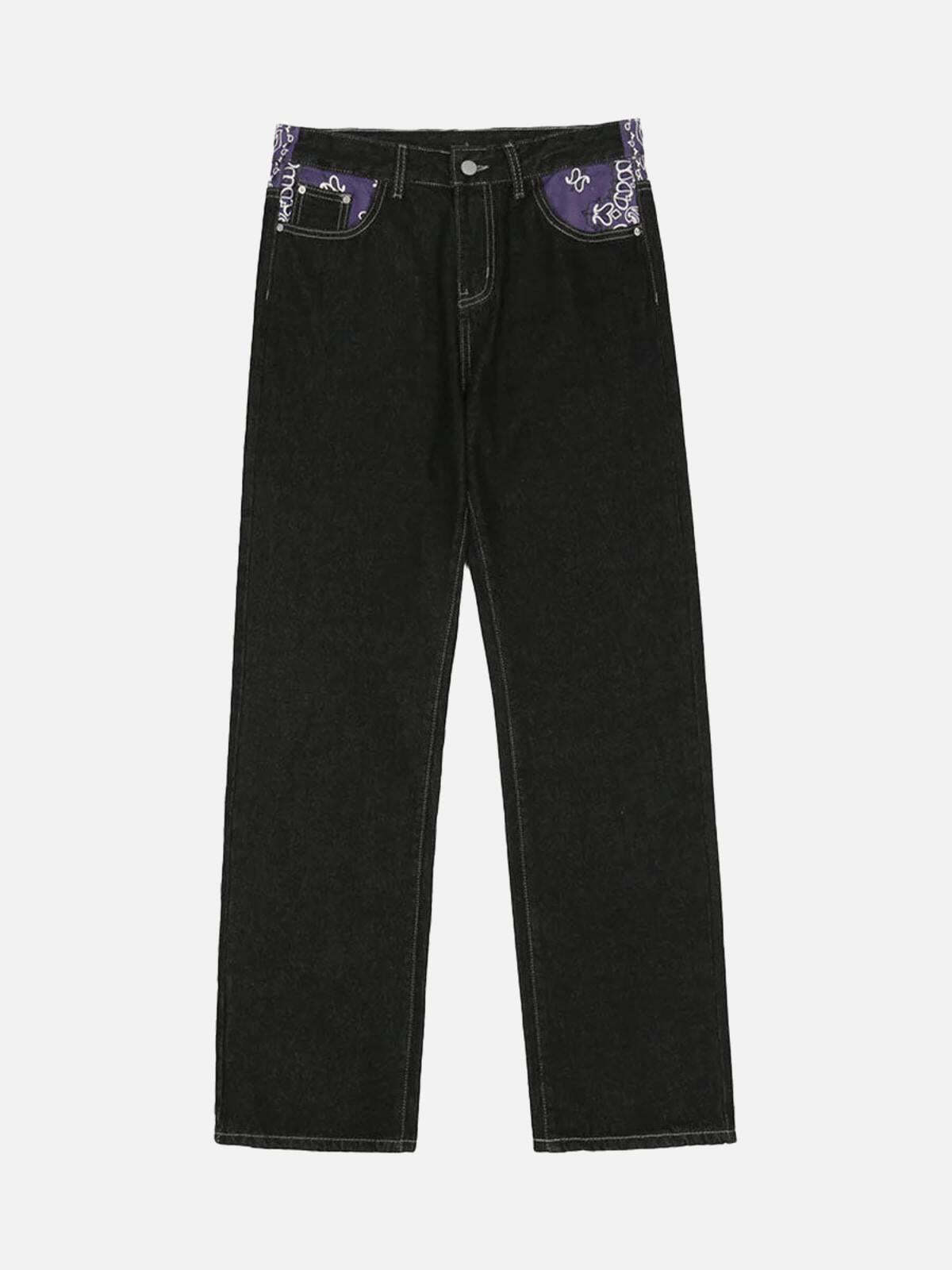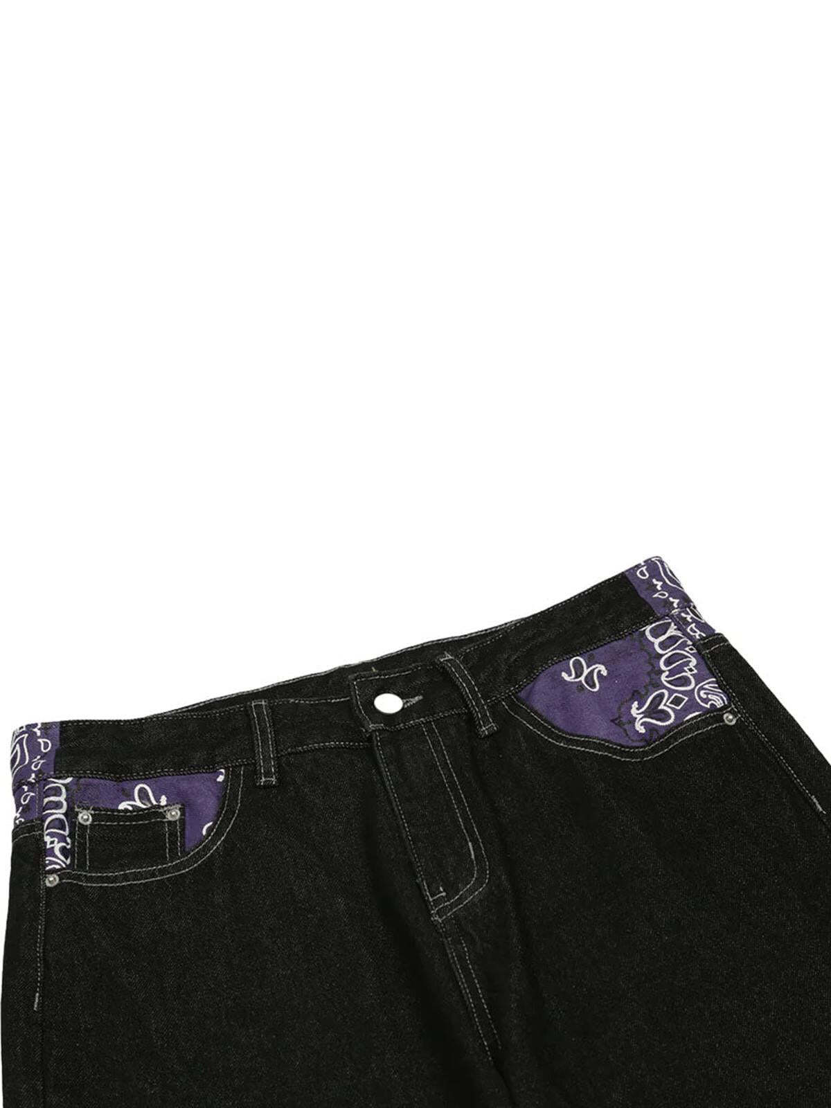 These jeans redefine streetwear fashion with a bold twist, featuring striking bandana accents in rich purple and blue hues that pop against the classic black denim. Crafted for those who crave a blend of edgy and sophisticated, the comfortable straight-leg fit offers versatility for any outfit inspo. Available in sizes S to XL, these jeans ensure a perfect fit for every style enthusiast. Pair them with your favorite graphic tee or a sleek jacket for a look that commands attention. Get ready to turn heads and redefine your style game.