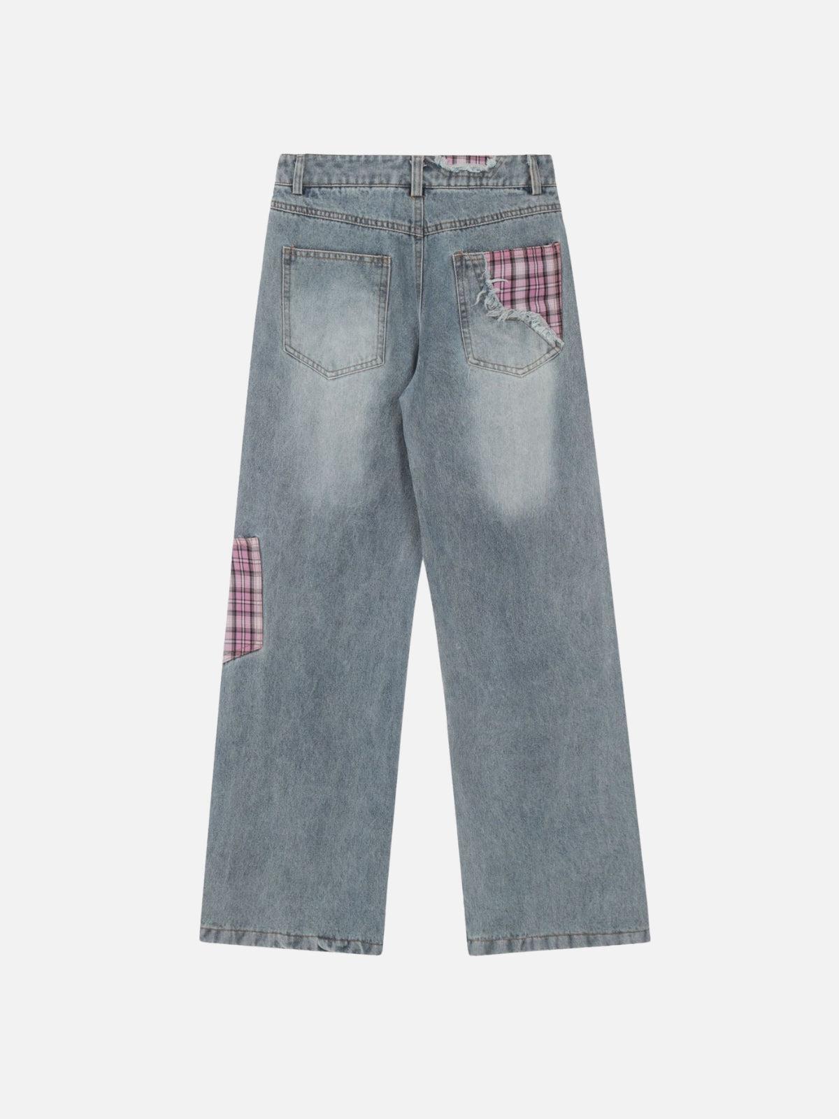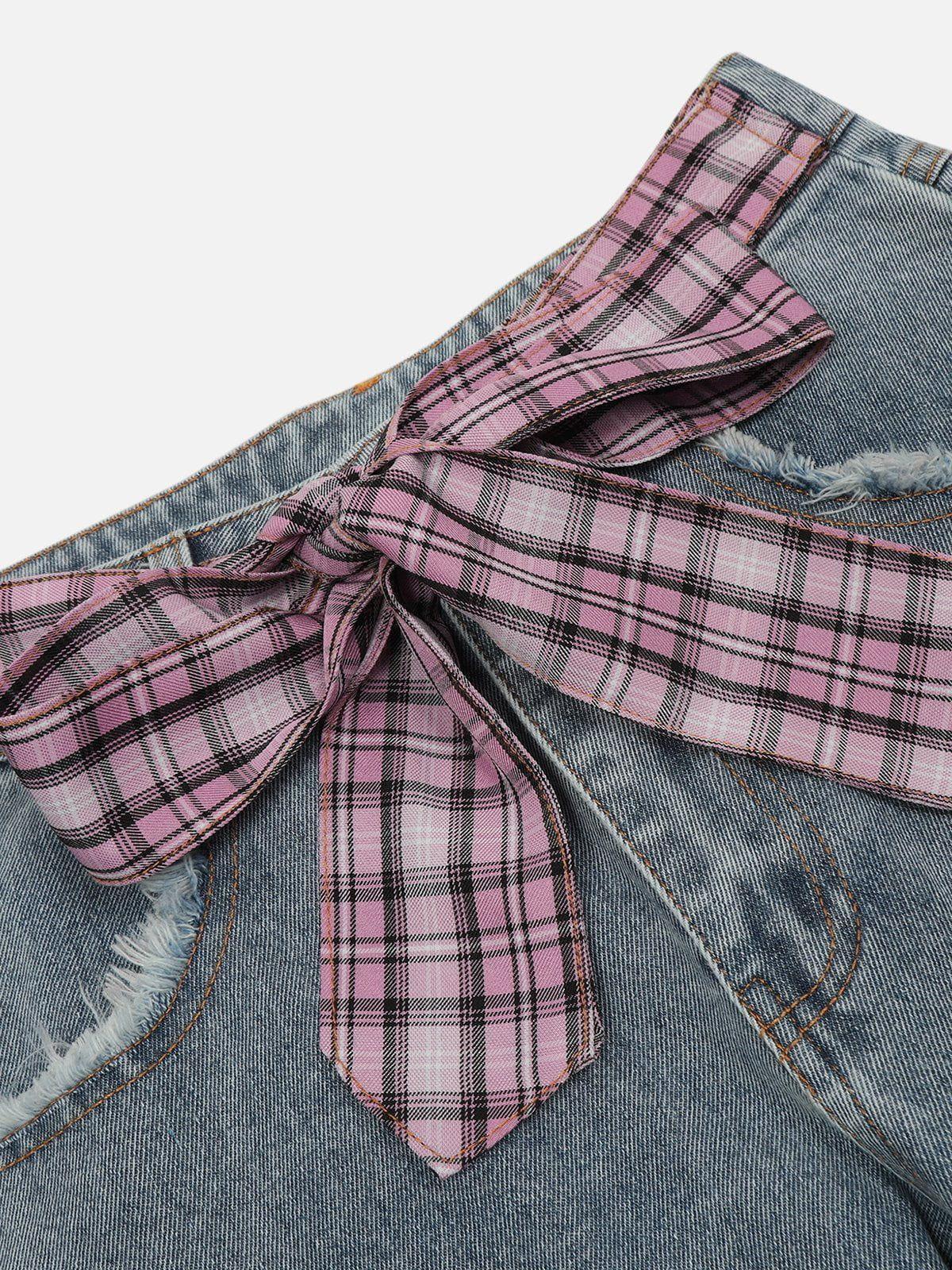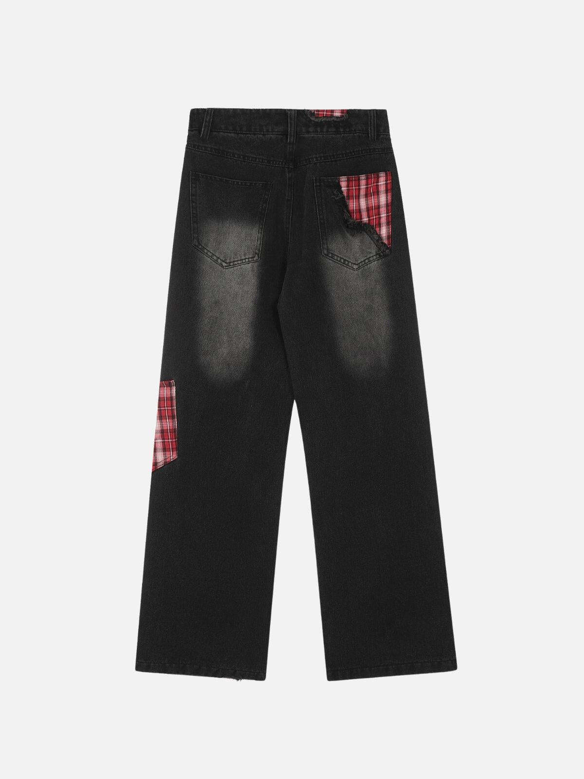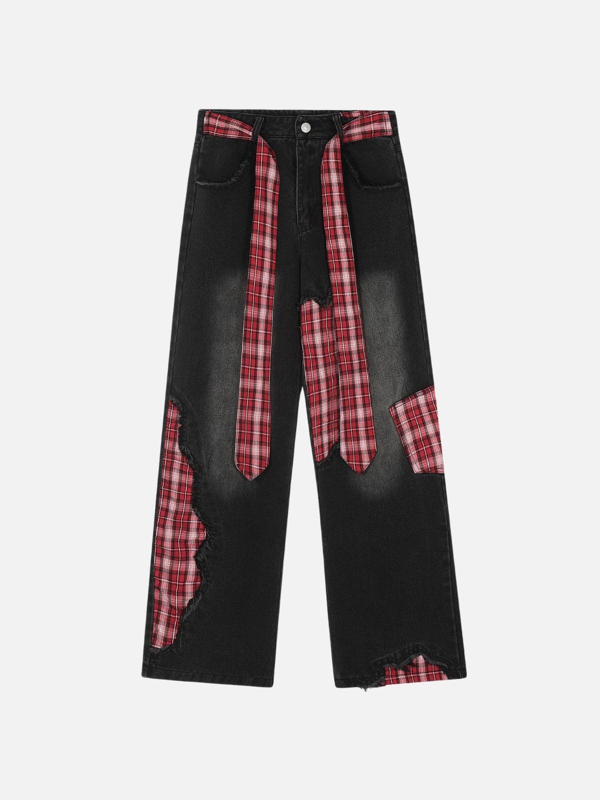 Break the mold with these audacious pants that merge raw street edge with a splash of rebellious plaid. The rugged black denim interplays with red plaid accents, creating a striking contrast that’s as bold as your spirit. Designed in a versatile one-size fit, these pants drape effortlessly, offering a relaxed silhouette perfect for your streetwear fashion ensemble. Whether you’re rocking them in black or blue, the distressed details and plaid inserts add a touch of y2k nostalgia, making these pants a dynamic centerpiece for any outfit. Slip them on and let your style speak volumes without saying a word.