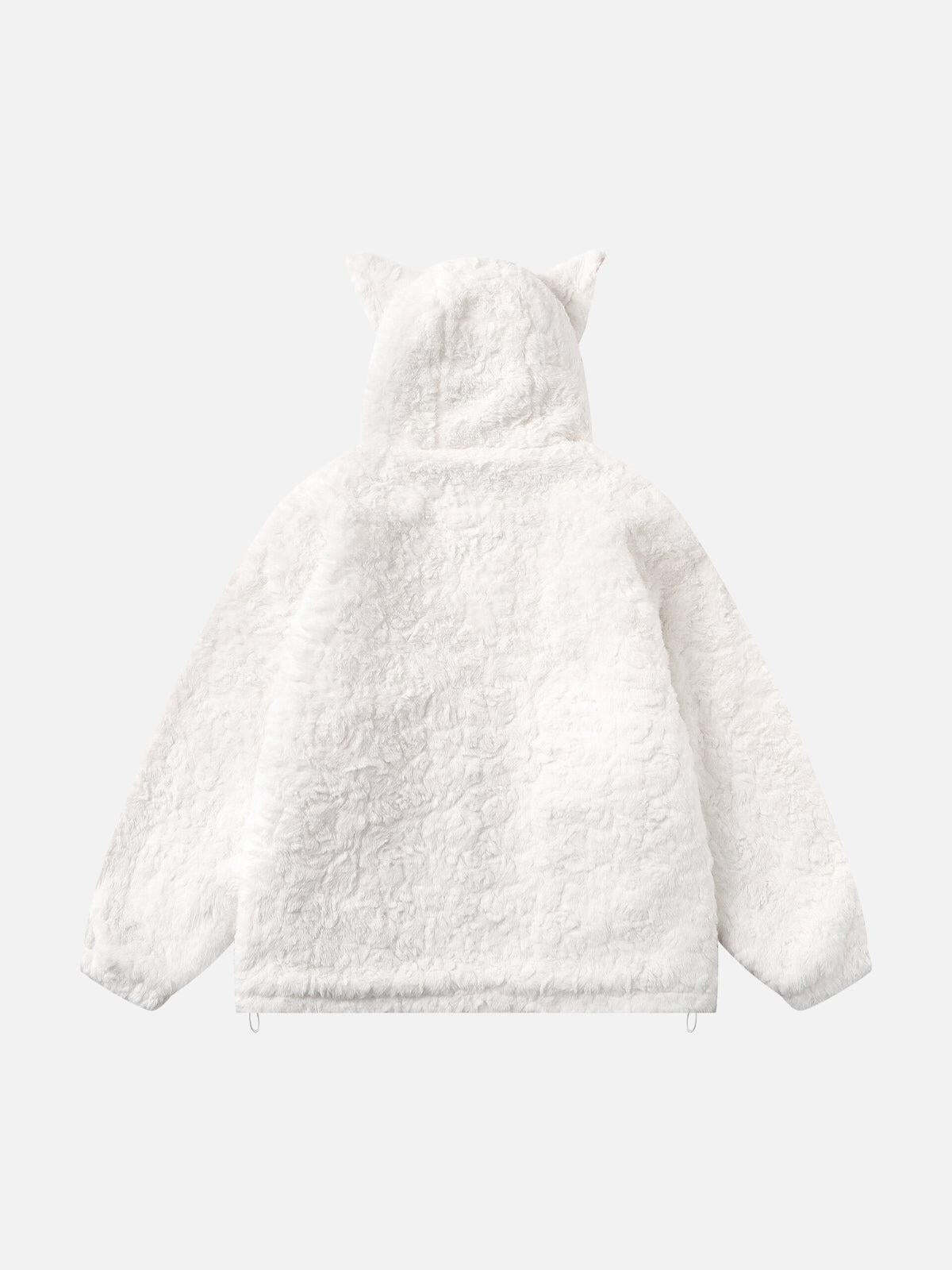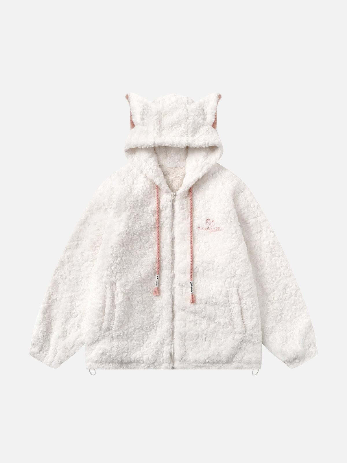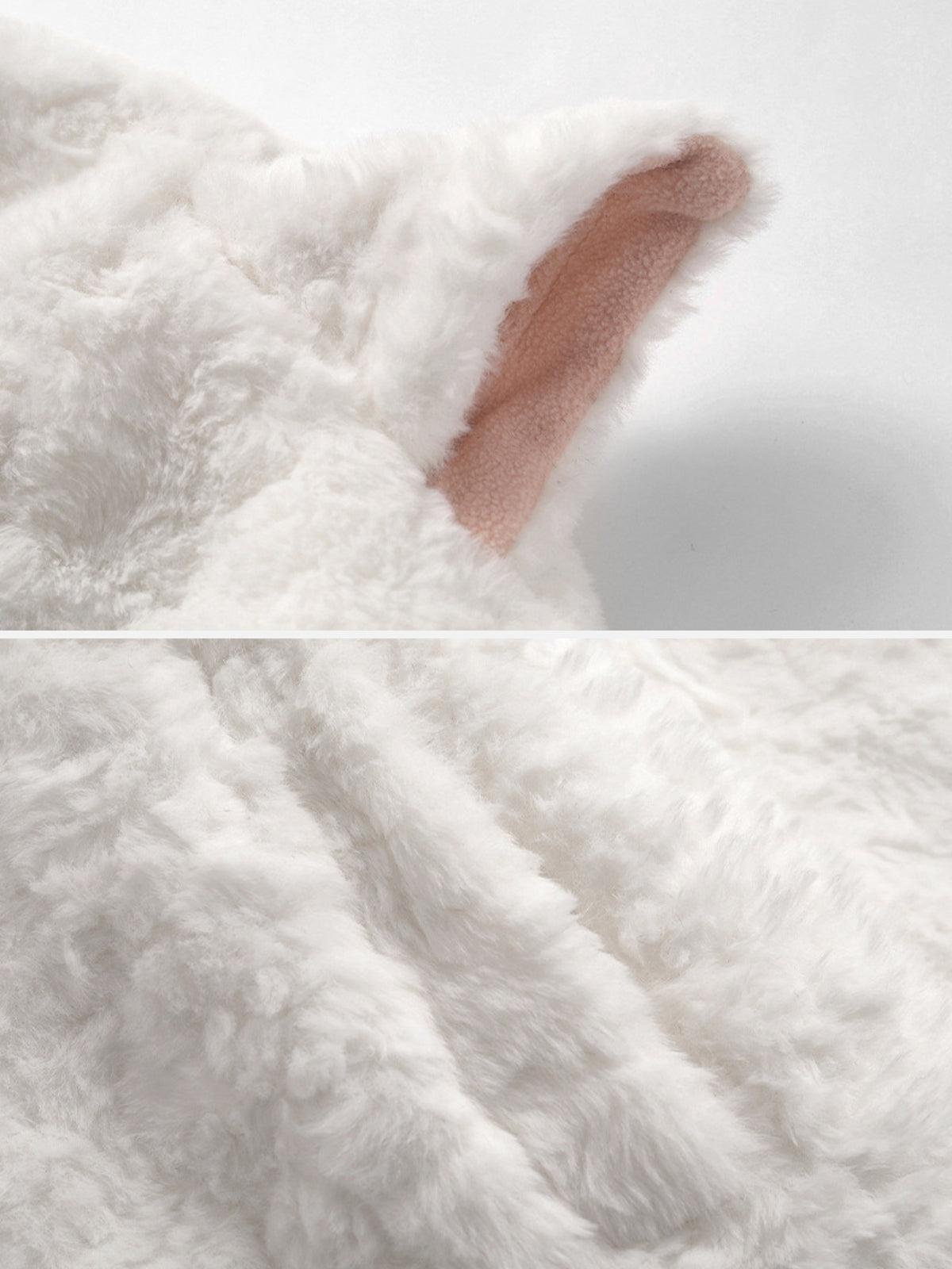Embrace the blend of playful charm and urban edge with this plush, fluffy hoodie that wraps you in a cocoon of soft, textured warmth. The subtle off-white hue and pink accents offer a fresh take on streetwear fashion, making it the perfect addition to any y2k-inspired ensemble. Designed as a one-size-fits-all masterpiece, its relaxed fit ensures comfort while the adorable ear-tipped hood gives it an irresistible twist. Pair it with your favorite denim or layer it over a sleek outfit to create an effortlessly cool look. Ready to redefine your wardrobe?