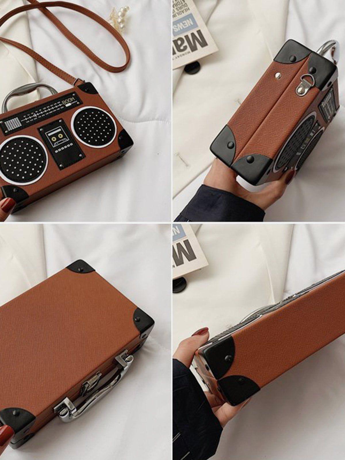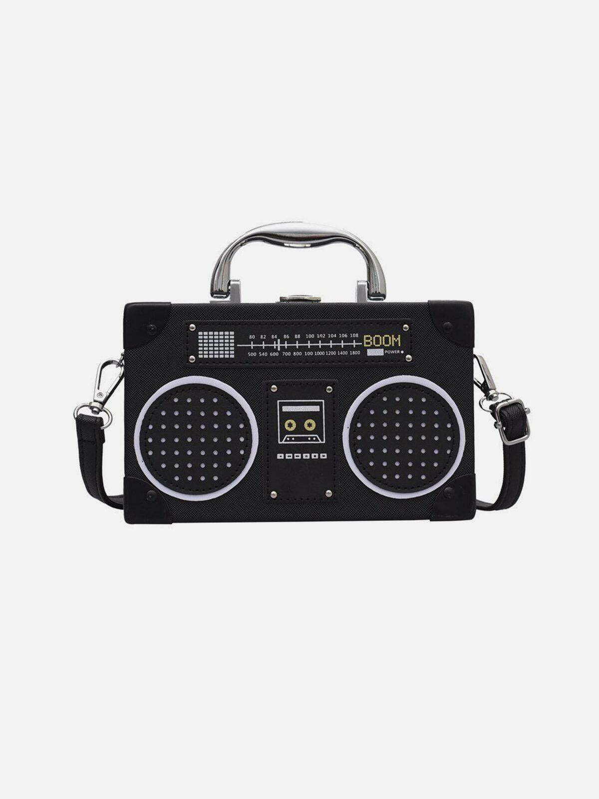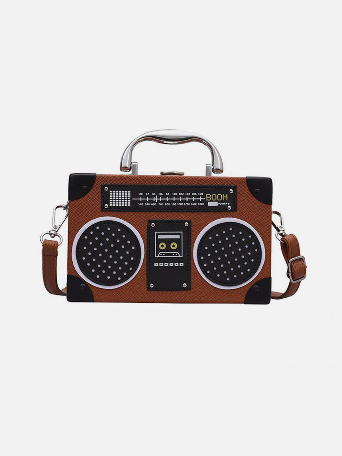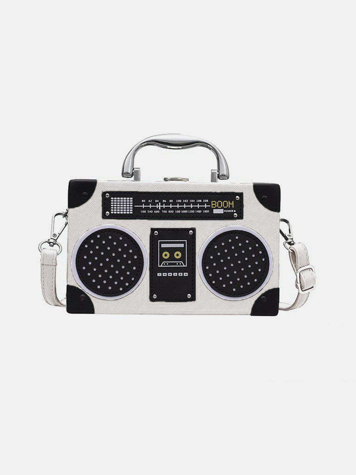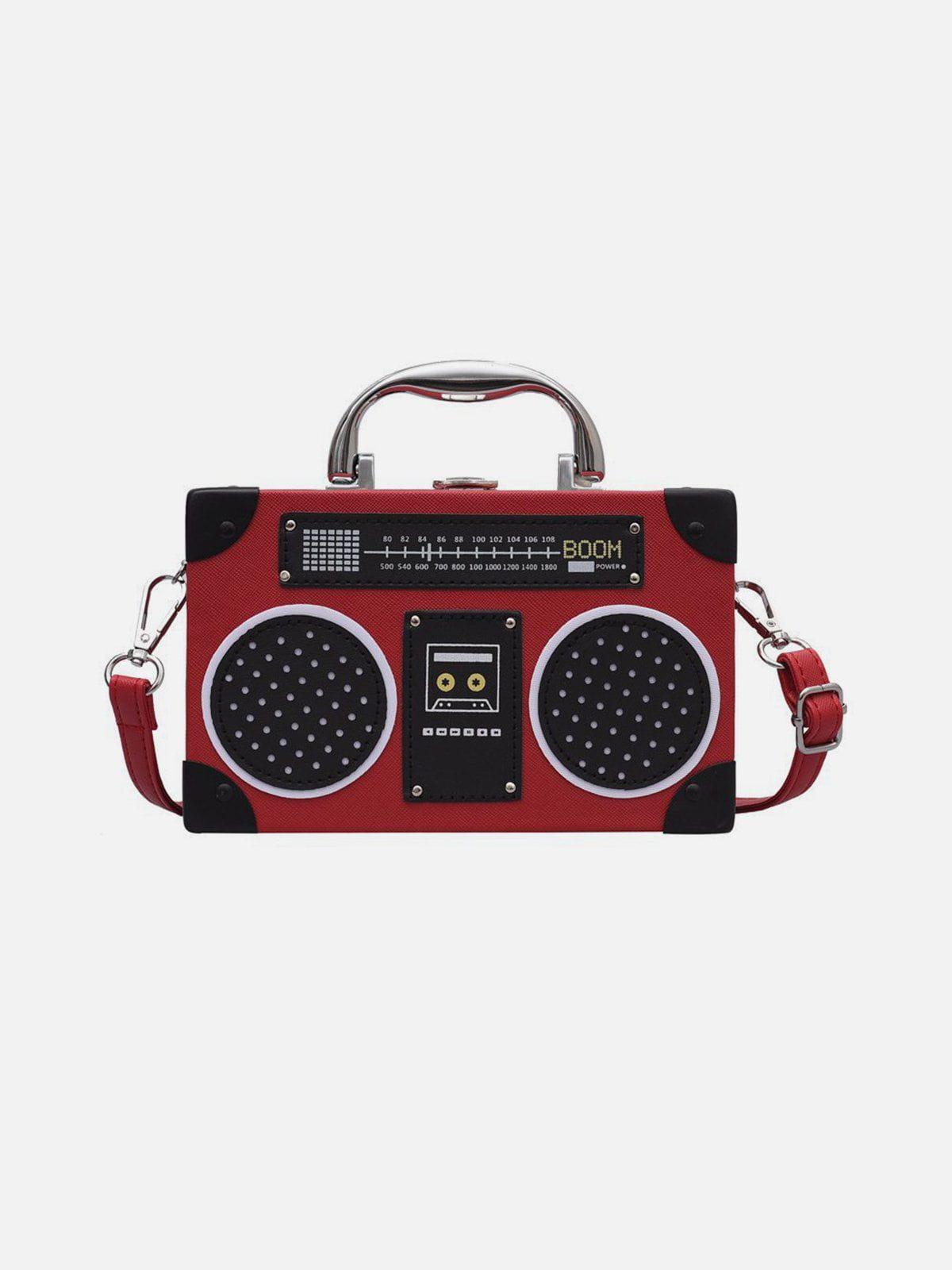 Turn up the volume on your style game with this audacious boombox handbag, resonating with retro vibes and urban flair. Its striking black and white design, accented with realistic speaker and cassette graphics, commands attention wherever you go. Available in bold shades like red and brown, this versatile piece adapts to your every mood and outfit. With a sturdy handle and adjustable strap, it offers both comfort and edge, making it a standout accessory in any streetwear fashion ensemble. Perfect for those who dare to mix the nostalgic charm of y2k outfits with modern street style. Grab yours now and let your bag do the talking.