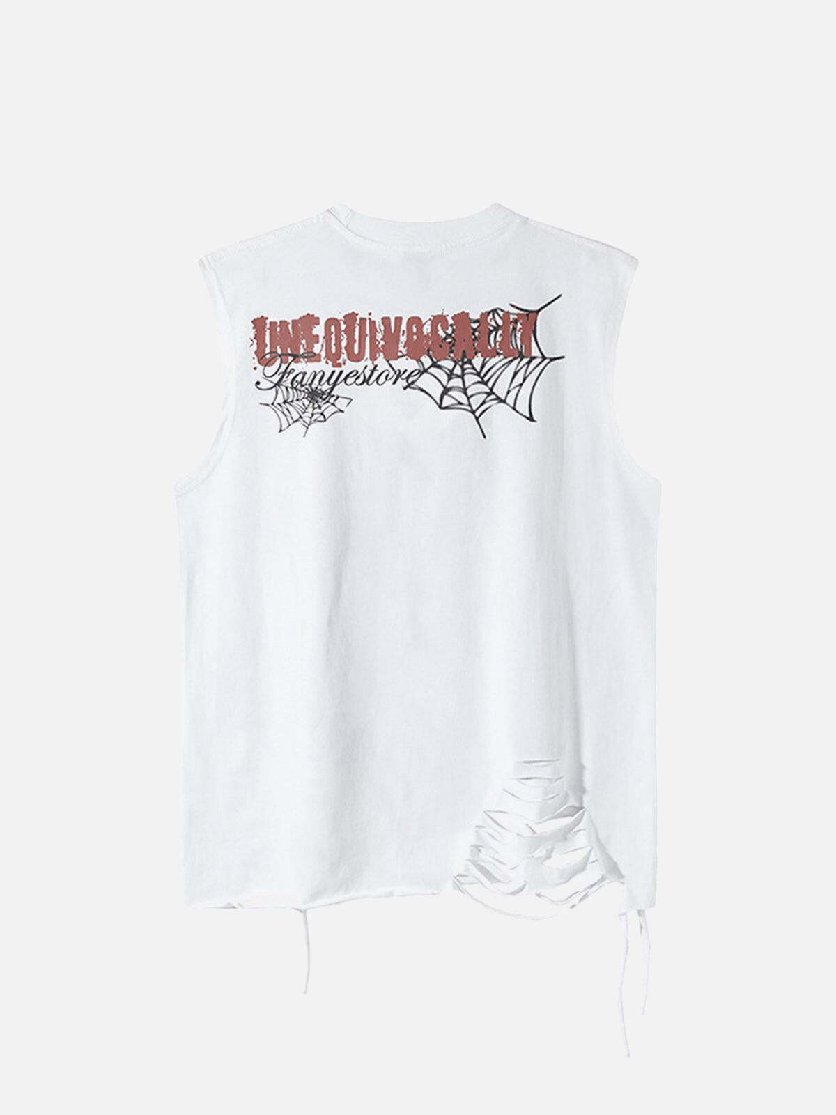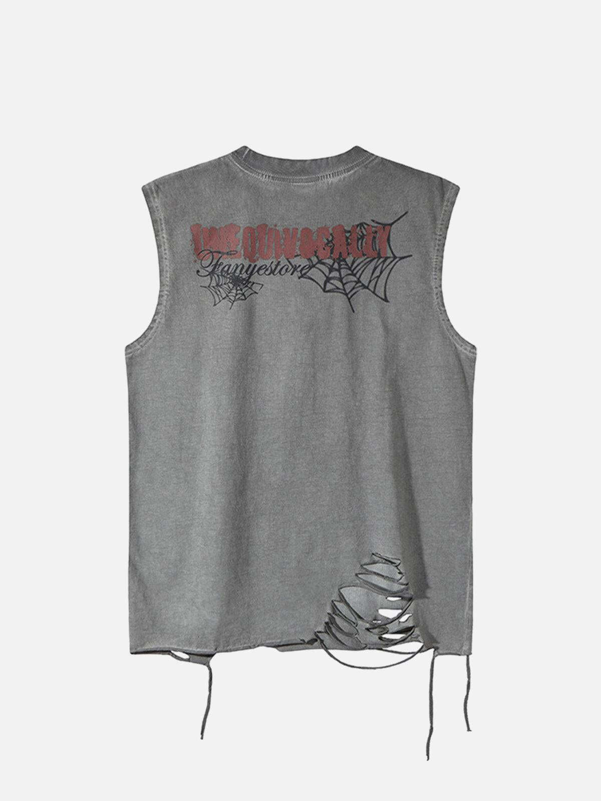 Dare to redefine streetwear fashion with this audacious sleeveless tee, where edgy meets elegance in a woven dance of intricate spider web designs. The distressed detailing and raw hems add a gritty texture, perfect for those who embrace the urban jungle. Available in versatile gray, white, and black, and sizes ranging from S to 2XL, this piece seamlessly fits any vibe and any body. Pair it with your favorite ripped jeans or layer it under a sleek bomber jacket for ultimate outfit inspo. Ready to turn heads and spark conversations? Slide into your new favorite look today.