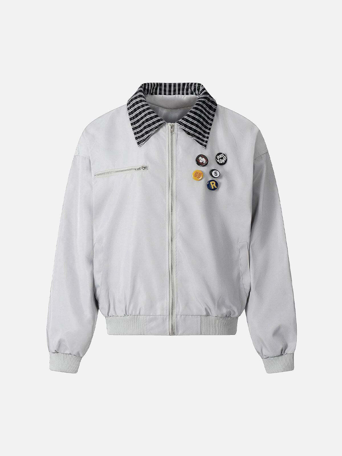 Embrace the fusion of edgy and vintage with this sleek jacket, where a striking striped collar meets a smooth gray canvas adorned with eye-catching pins that echo streetwear’s rebellious spirit. Slide into the perfect fit with options ranging from M to XL, ensuring comfort without compromising style. The subtle yet bold detailing on the chest adds a touch of flair, while its versatile design in gray or blue makes it an essential piece for those inspired by y2k outfits. Pair it with your favorite jeans or joggers for that ultimate urban vibe. Ready to redefine your look?