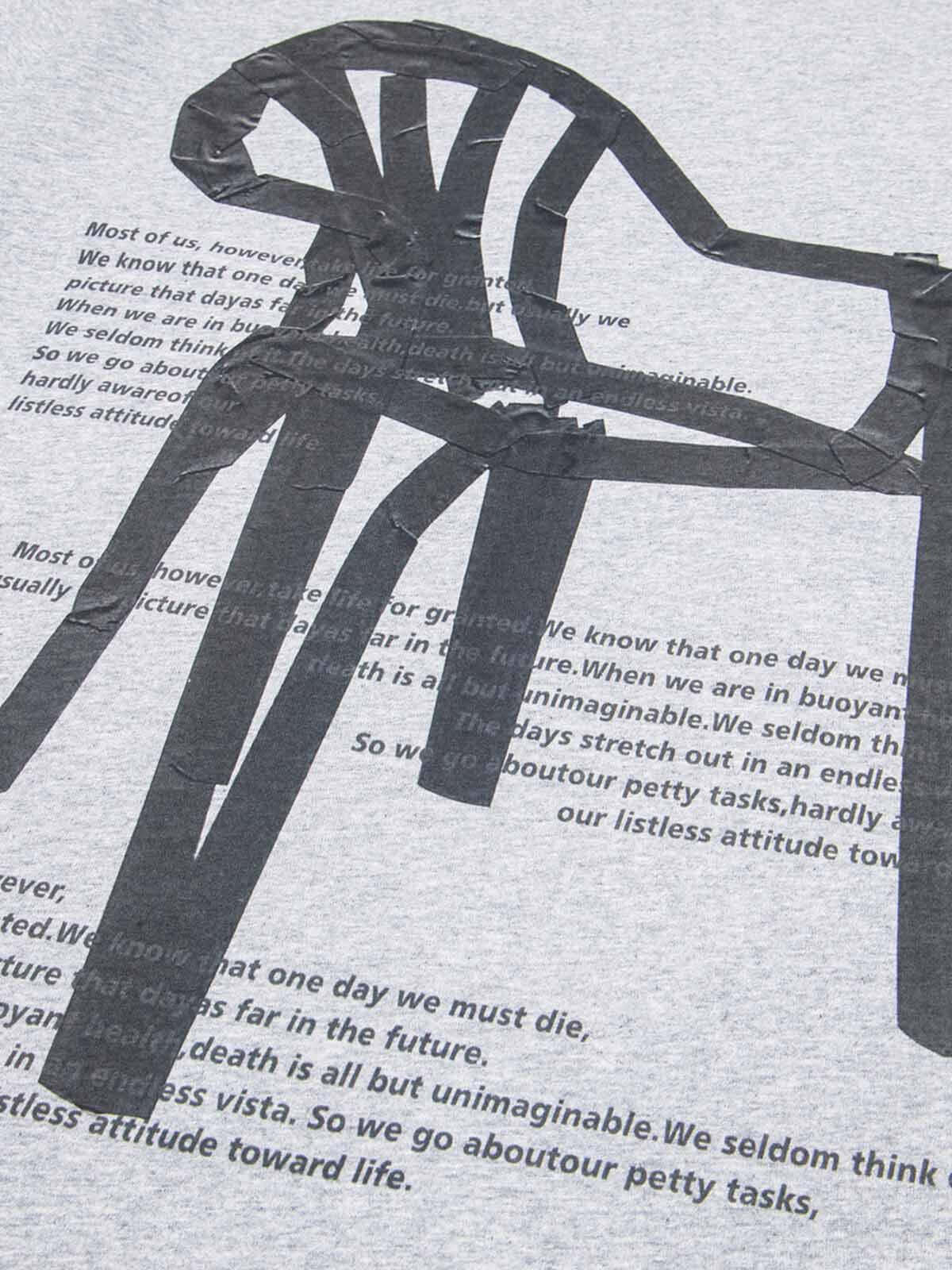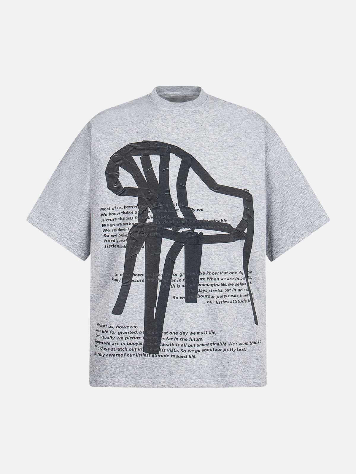 Embrace the raw edge of urban culture with this striking tee that showcases a bold, abstract chair graphic seamlessly fused with a thought-provoking text overlay. Available in versatile gray and crisp white, this tee is a canvas for your summer style, making it an essential piece for those who dare to stand out. Its relaxed fit ensures comfort whether you’re rocking it solo or layering it for a fresh summer outfit. With sizes ranging from M to XL, it’s designed to fit your vibe perfectly. Elevate your streetwear game and let this tee do the talking.